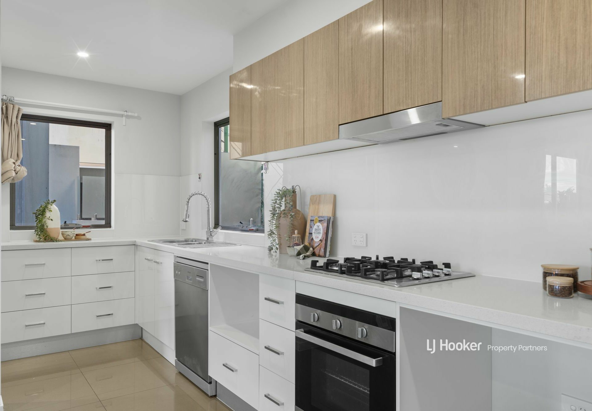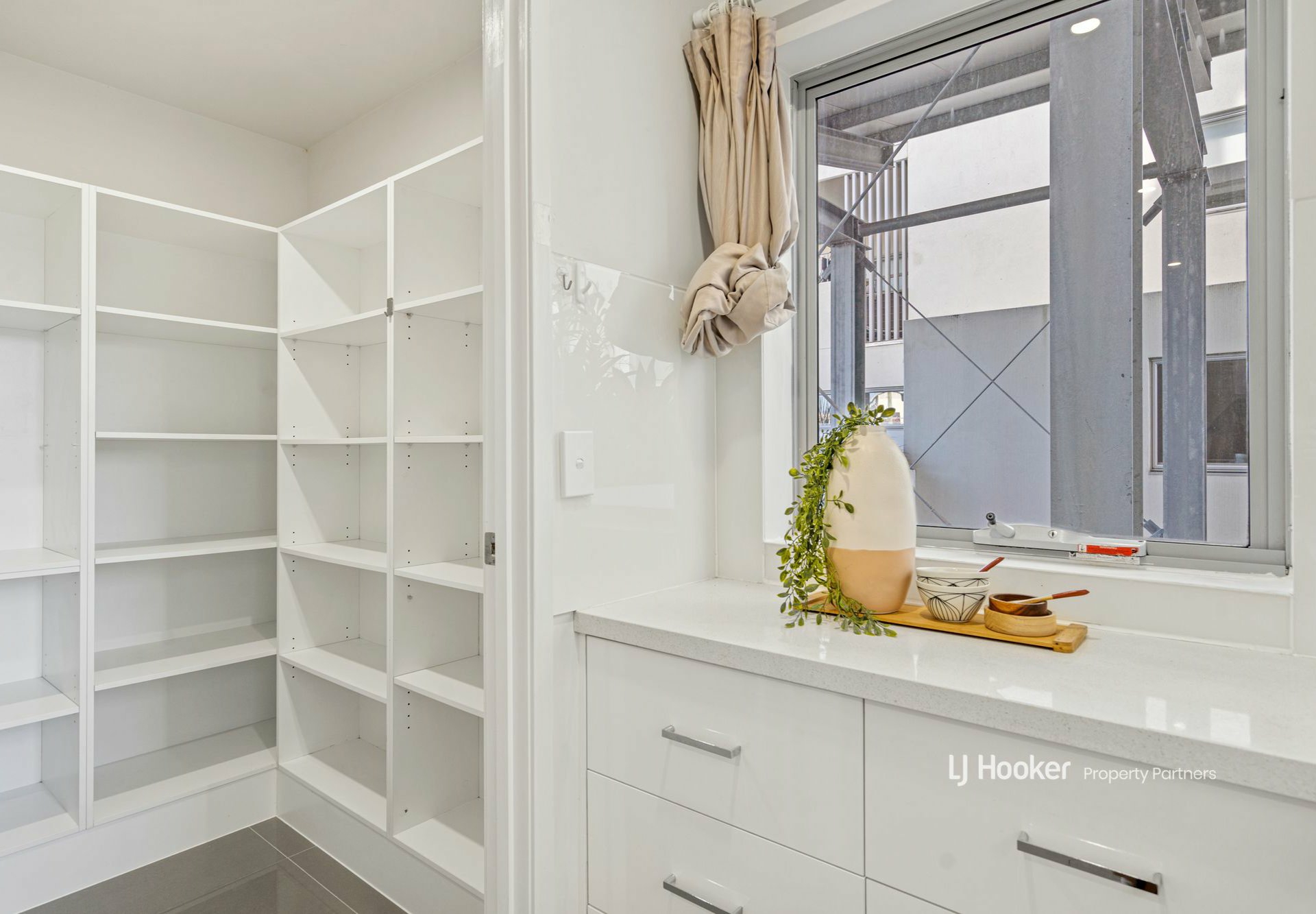 Tiled floors and LED downlights lead you to the open plan living space, with a grand open-facing kitchen boasting a gas cooktop, dishwasher, and rows of sleek cabinetry running along the wall toward the walk-in pantry.