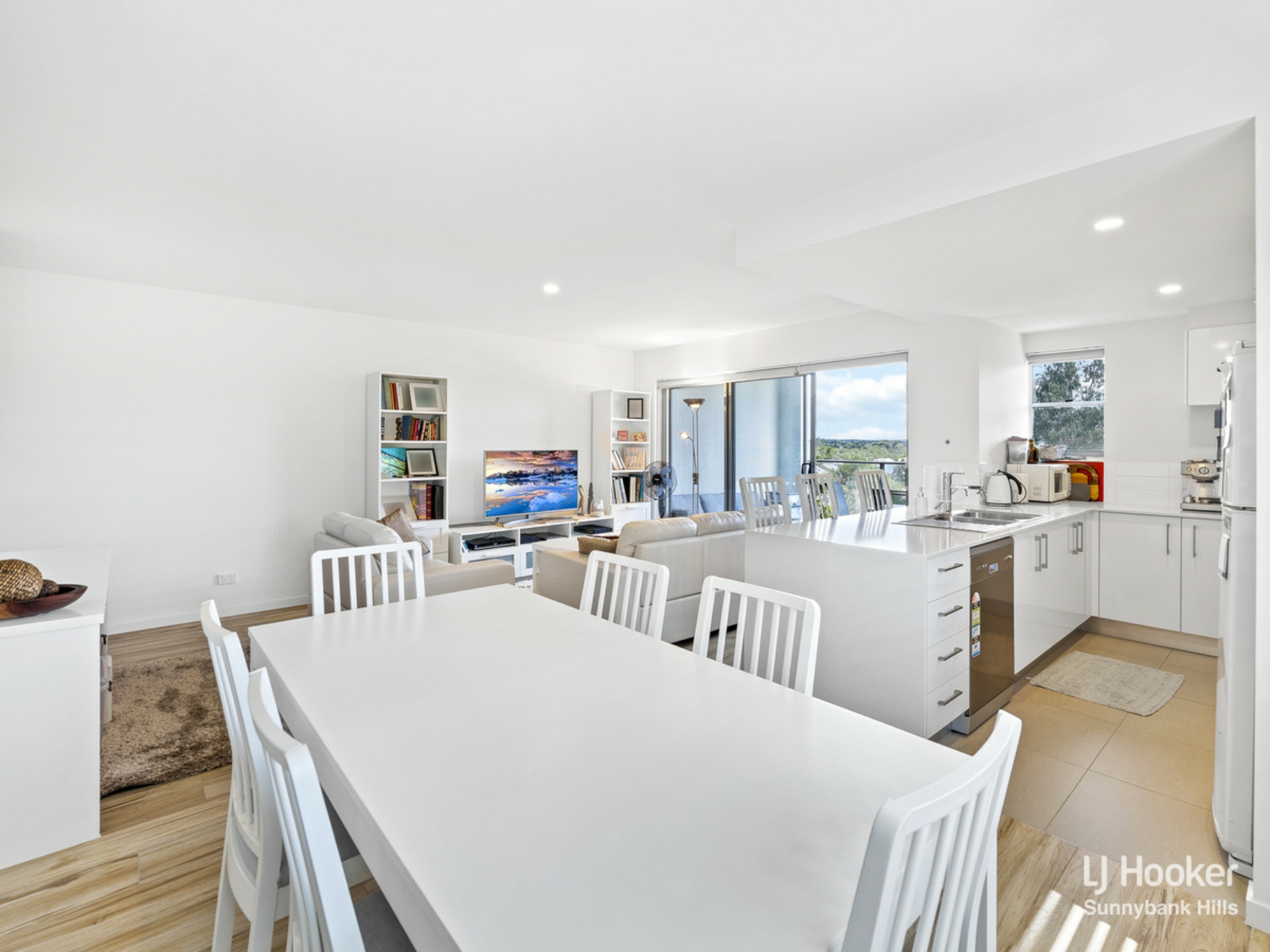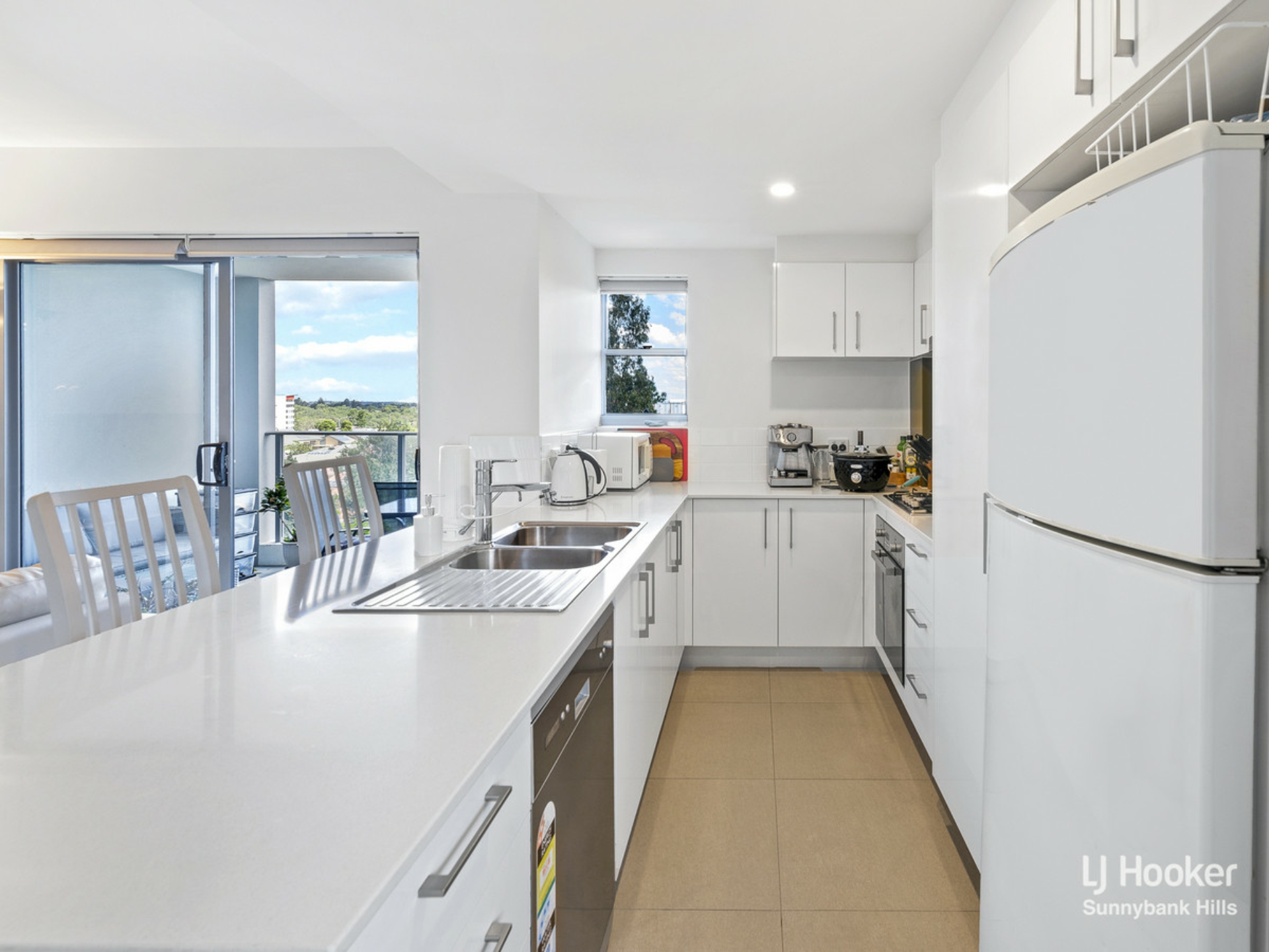 The kitchen features a long breakfast counter for easy meals on the go, smooth stone benchtops, quality modern appliances, a double sink with draining area, tall built-in pantry and tonnes of natural light.