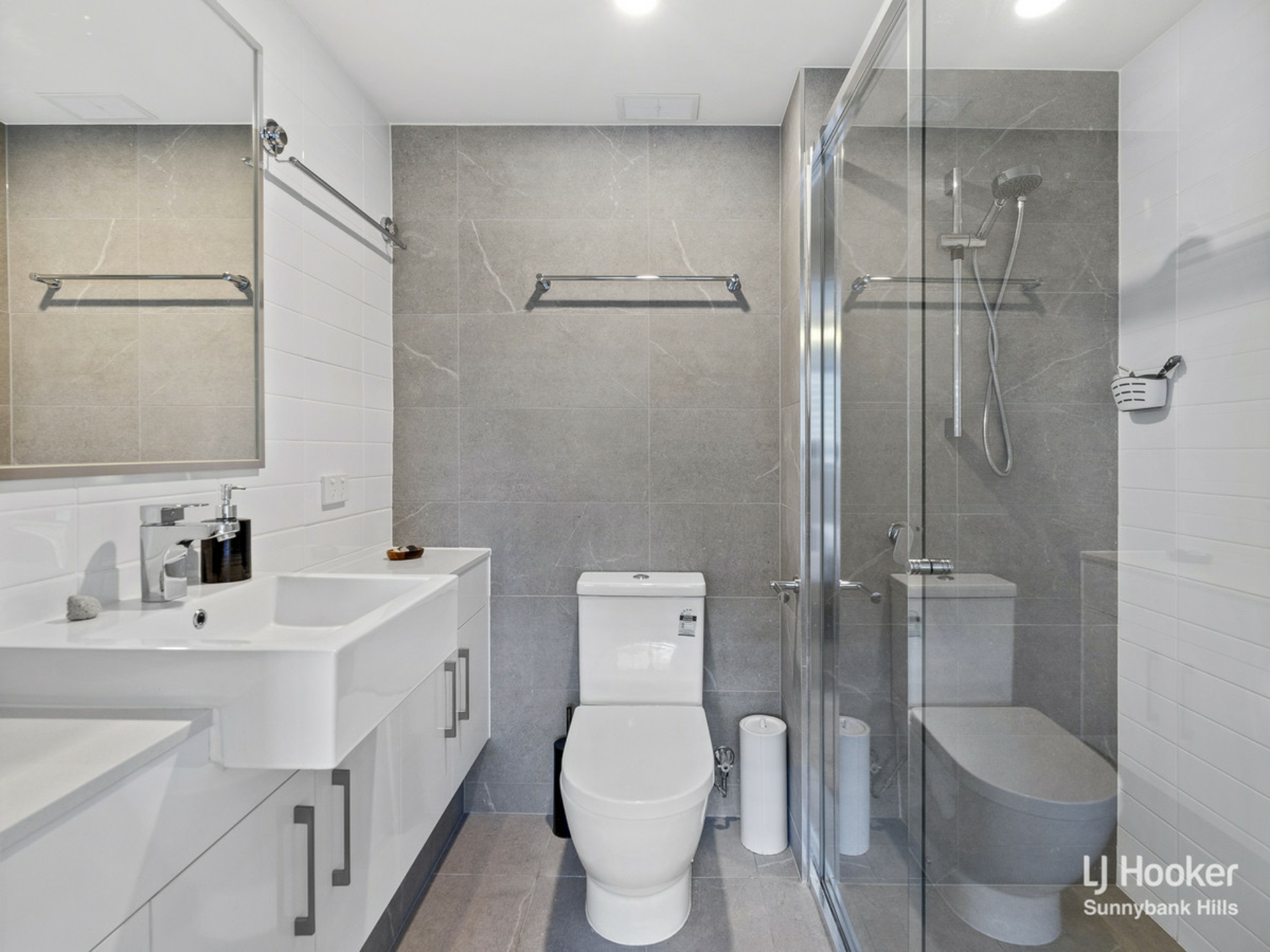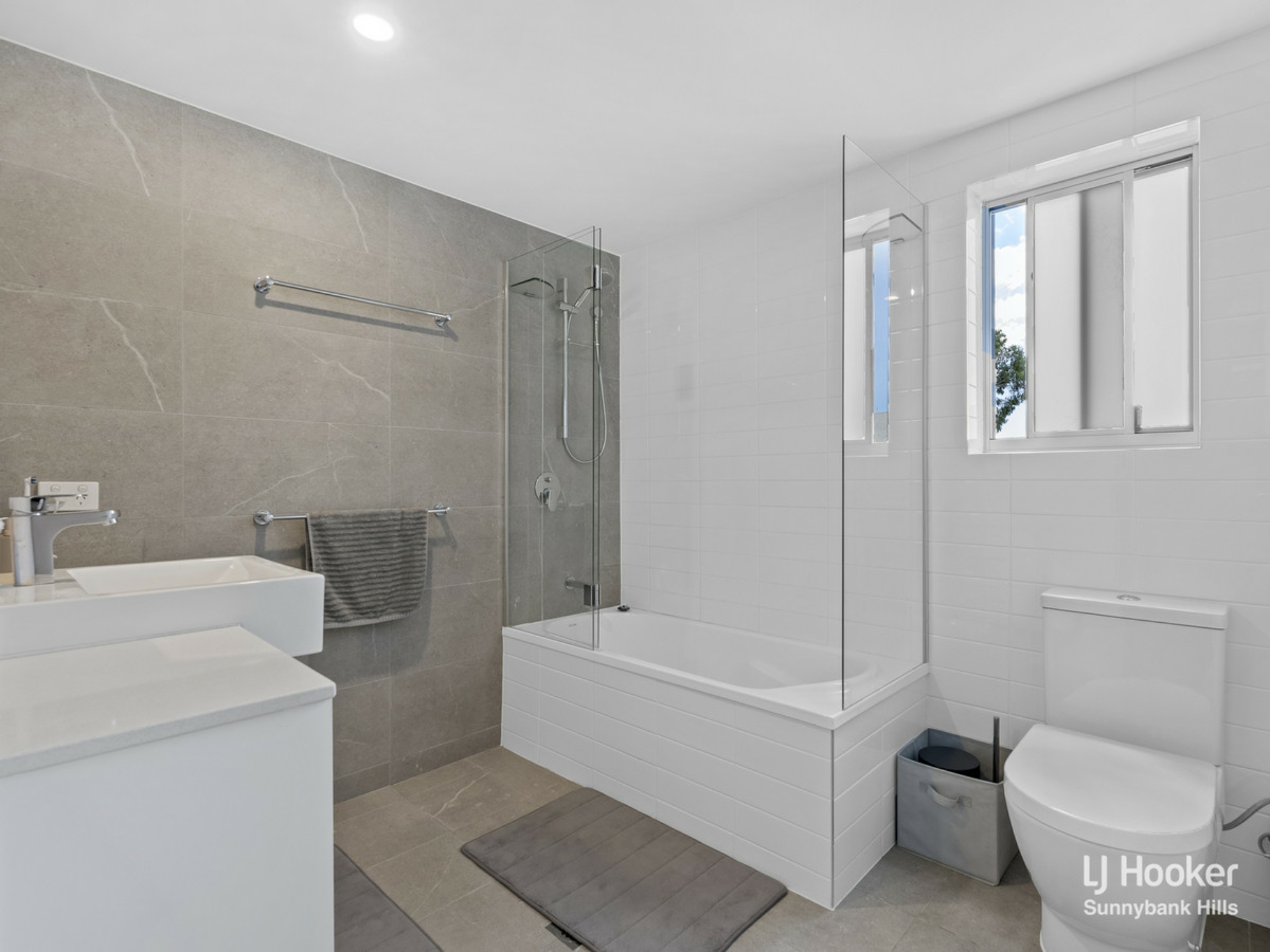 Both bathrooms have floor to ceiling tiles, a contemporary vogue colour palette, quality fittings, stone benchtop vanities, a large shower in the ensuite, and a combined bath-shower in the main bathroom.