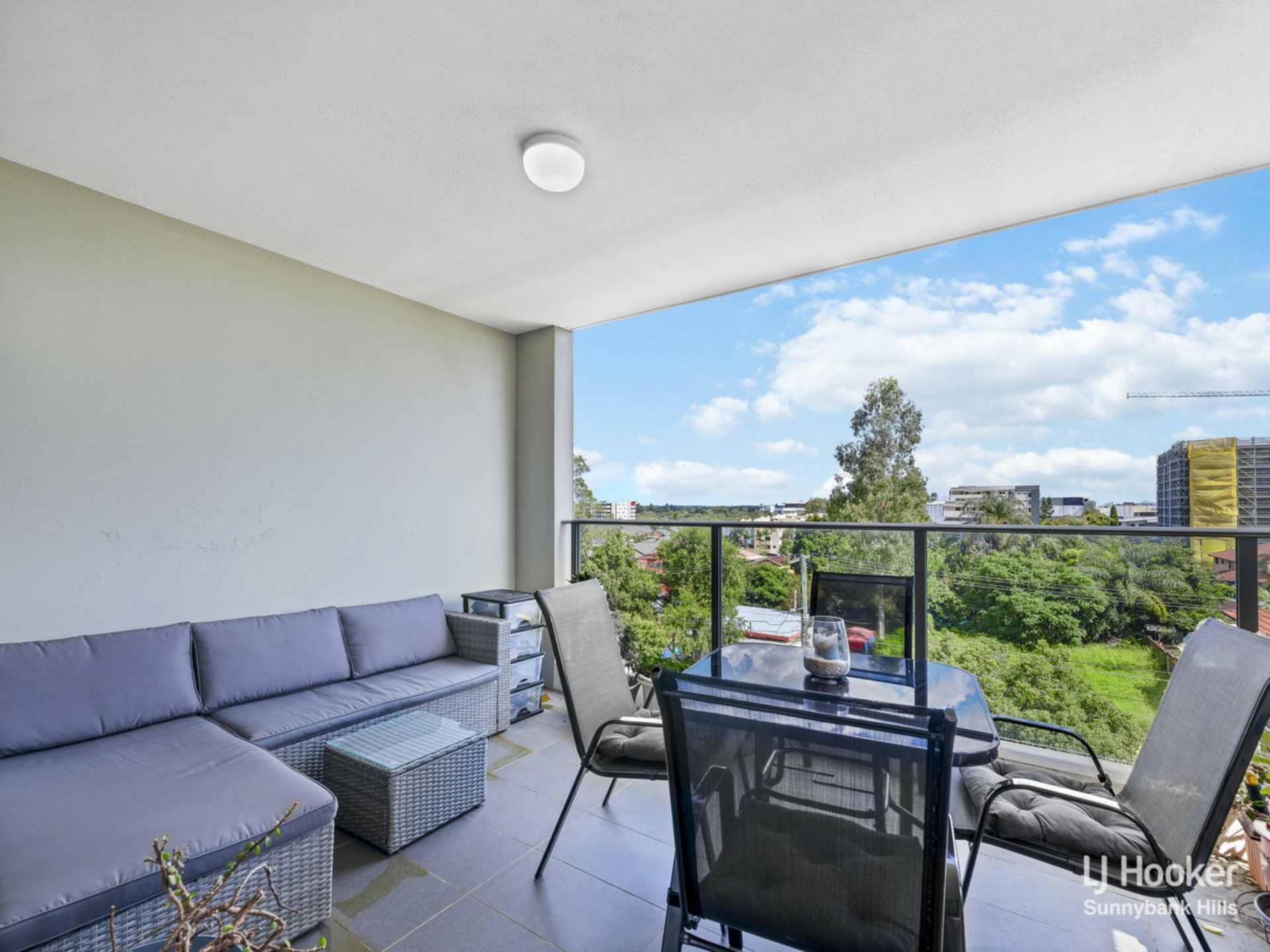 - Secluded balcony with glass balustrade and leafy green views