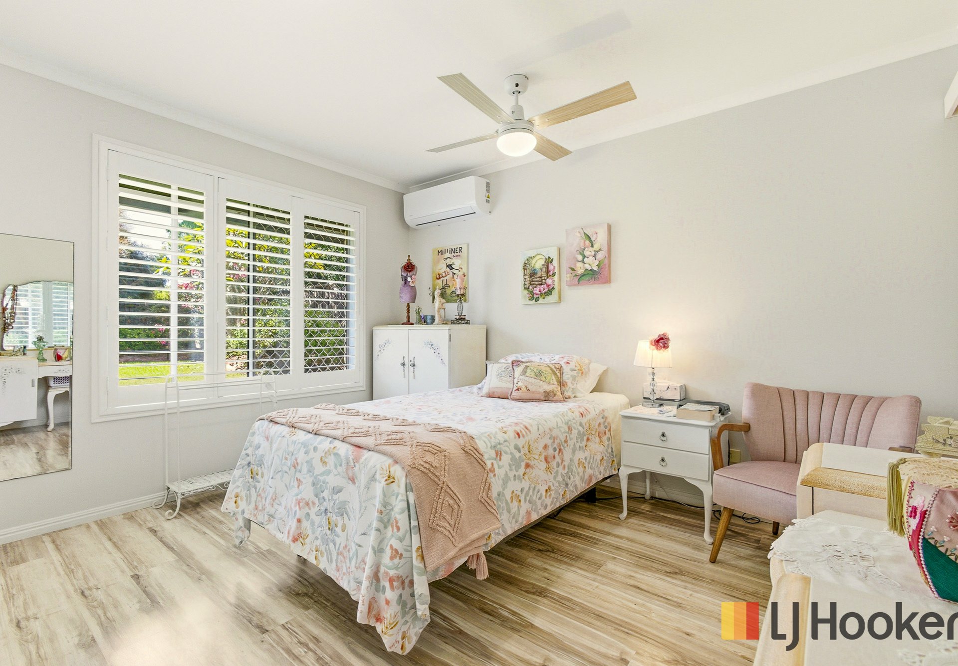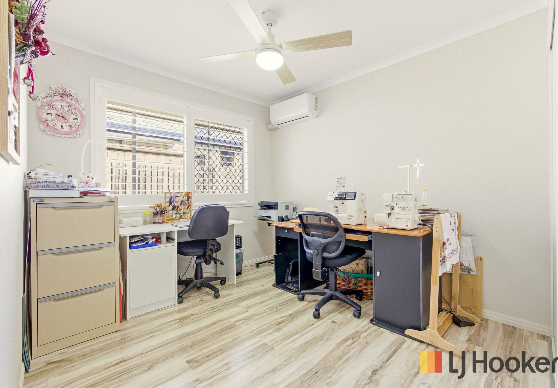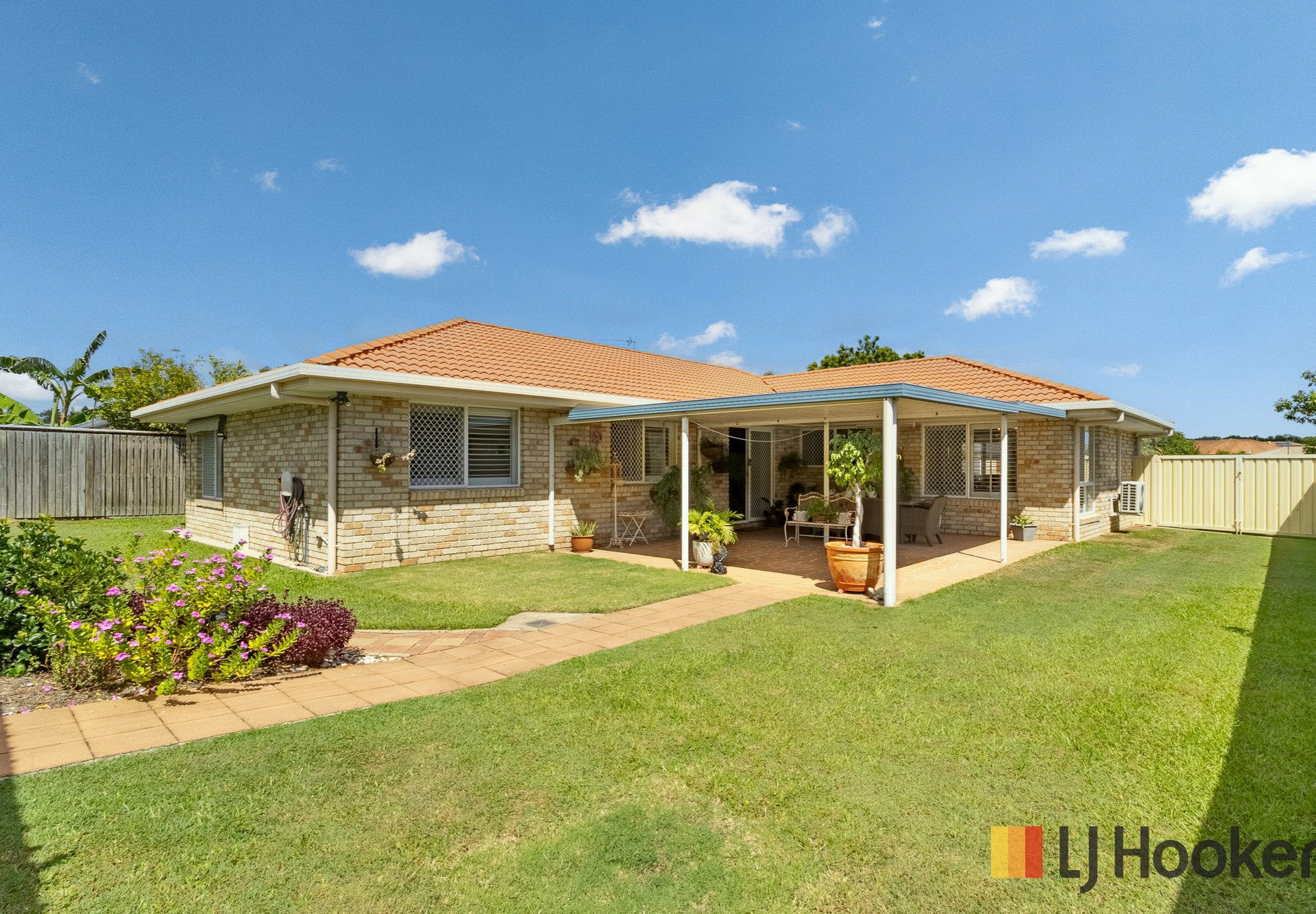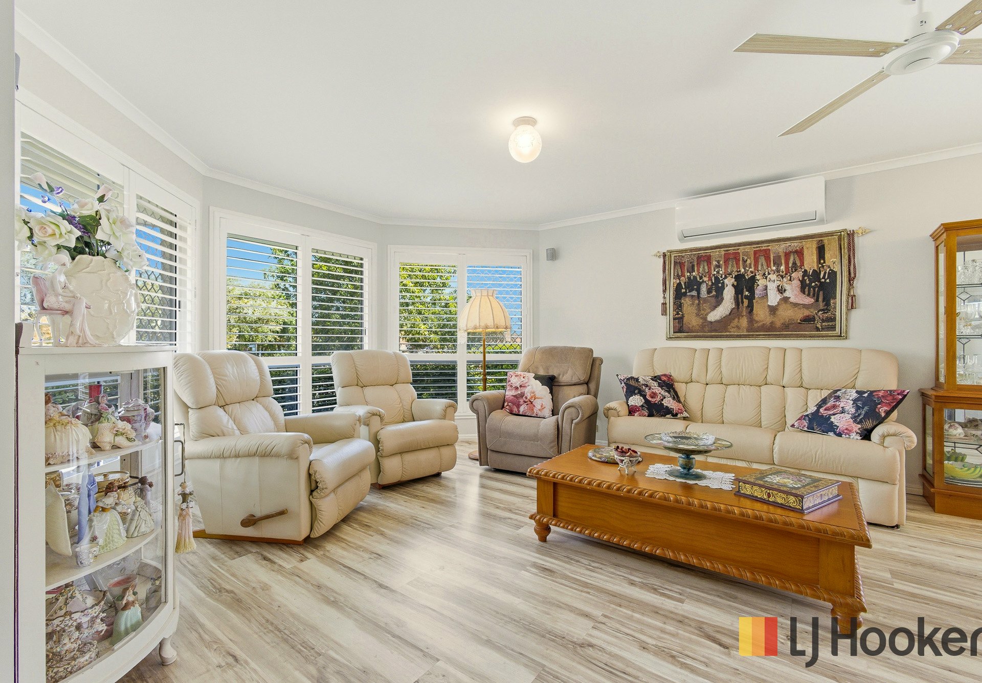 The home features four generous bedrooms, all with built-in wardrobes, including a master suite complete with ensuite and air-conditioning. Plantation shutters throughout, along with security screens on all windows and doors, provide both style and peace of mind.