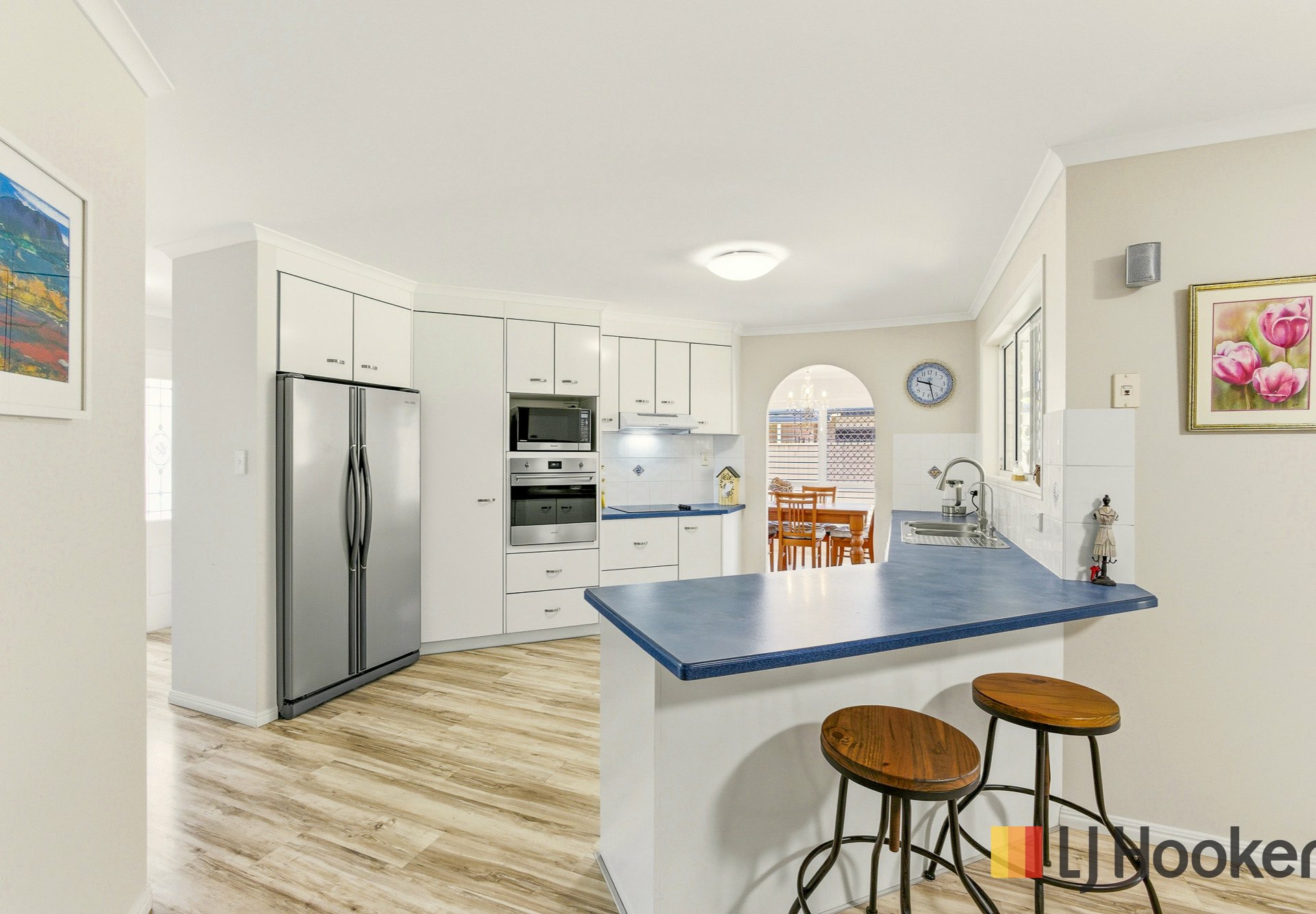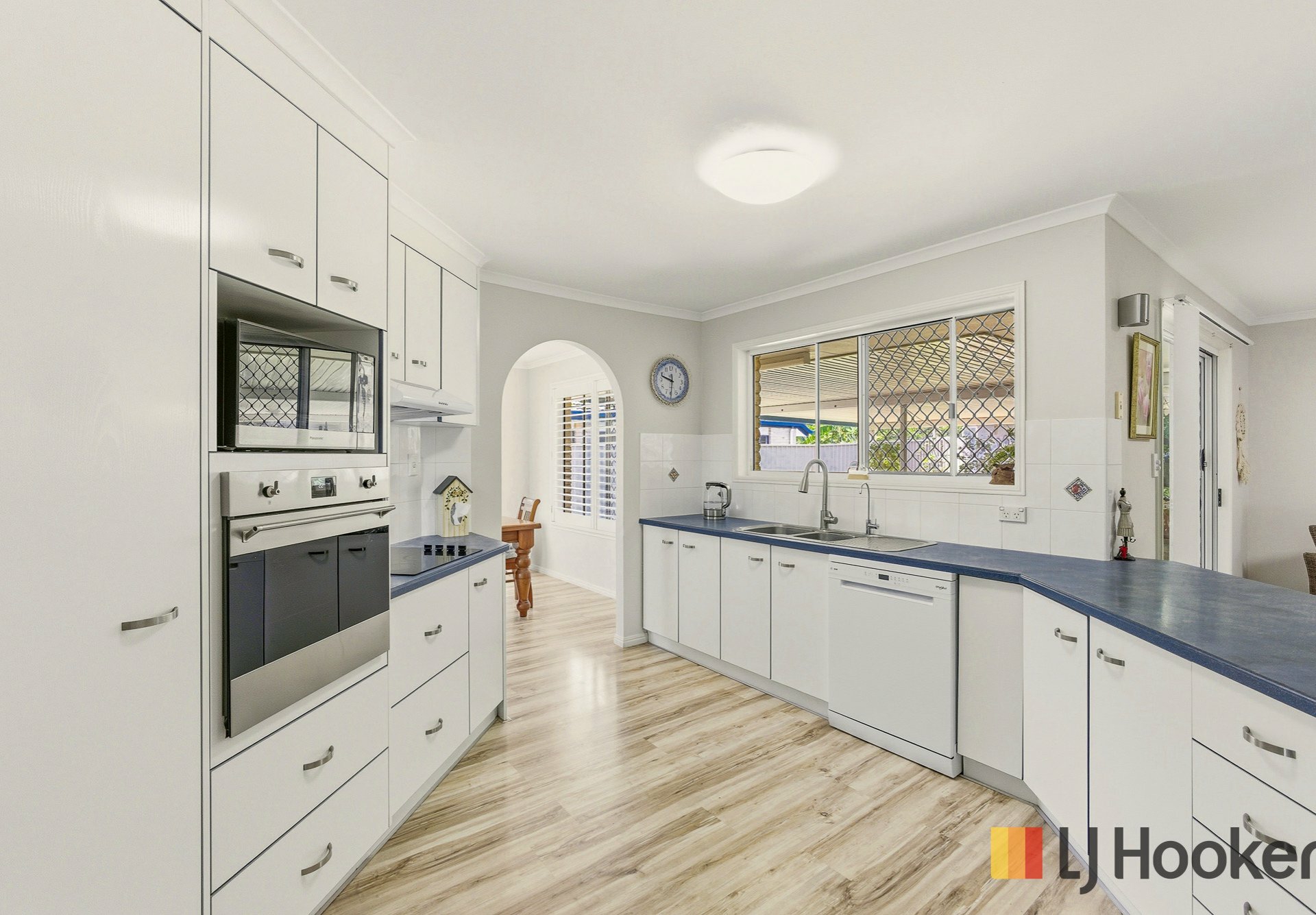 At the heart of the home is a large open-plan kitchen fitted with a Smeg oven and Bosch cooktop, flowing seamlessly into multiple living zones. Quality floating flooring throughout ensures low-maintenance living, while separate lounge, dining and additional TV areas offer flexibility for families of all sizes.