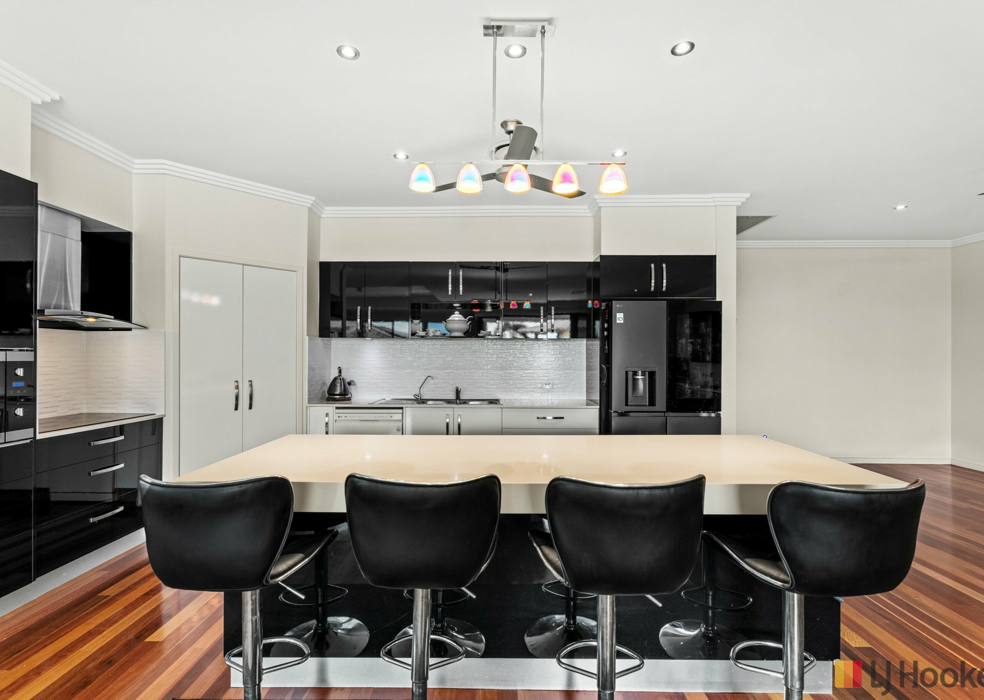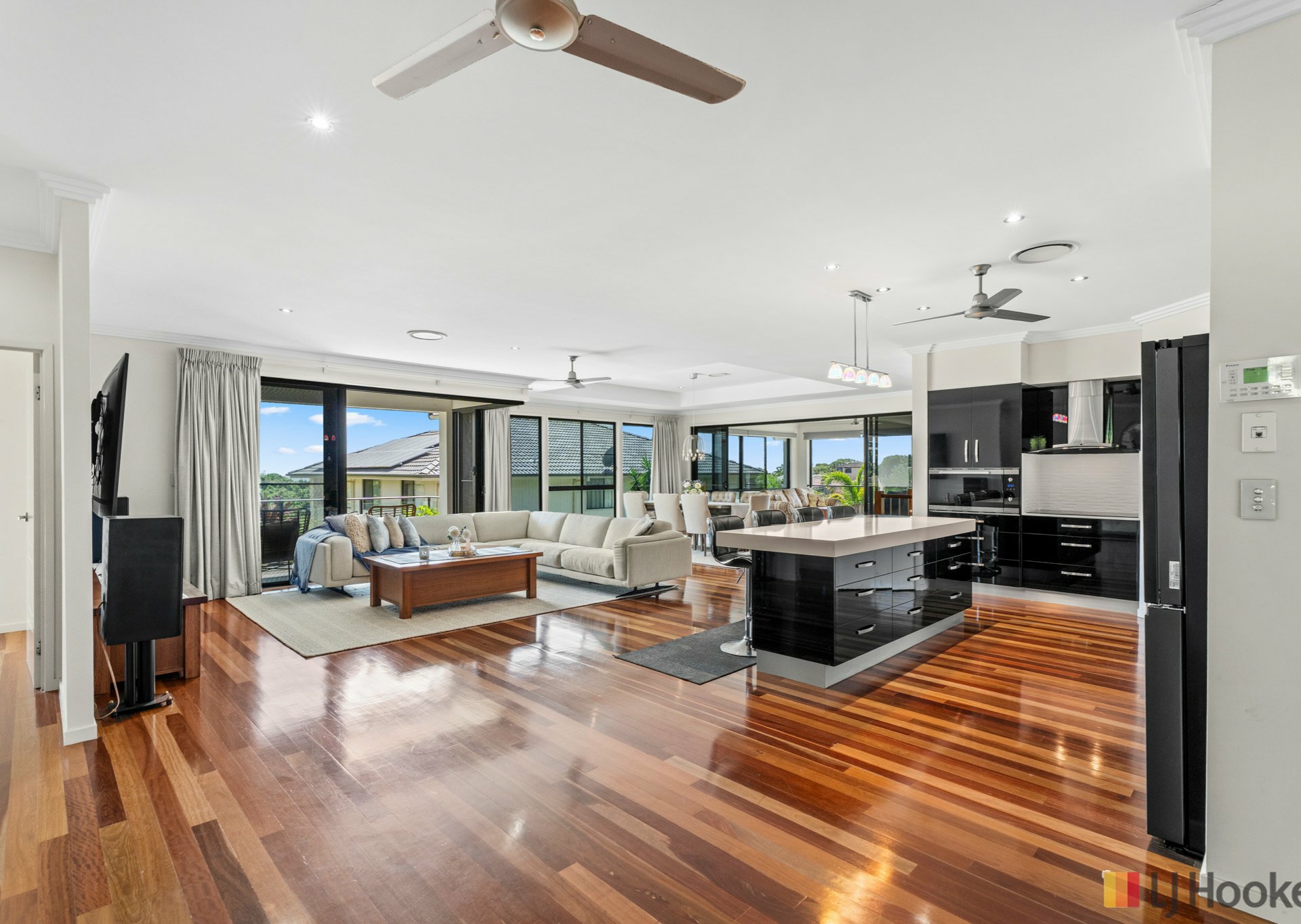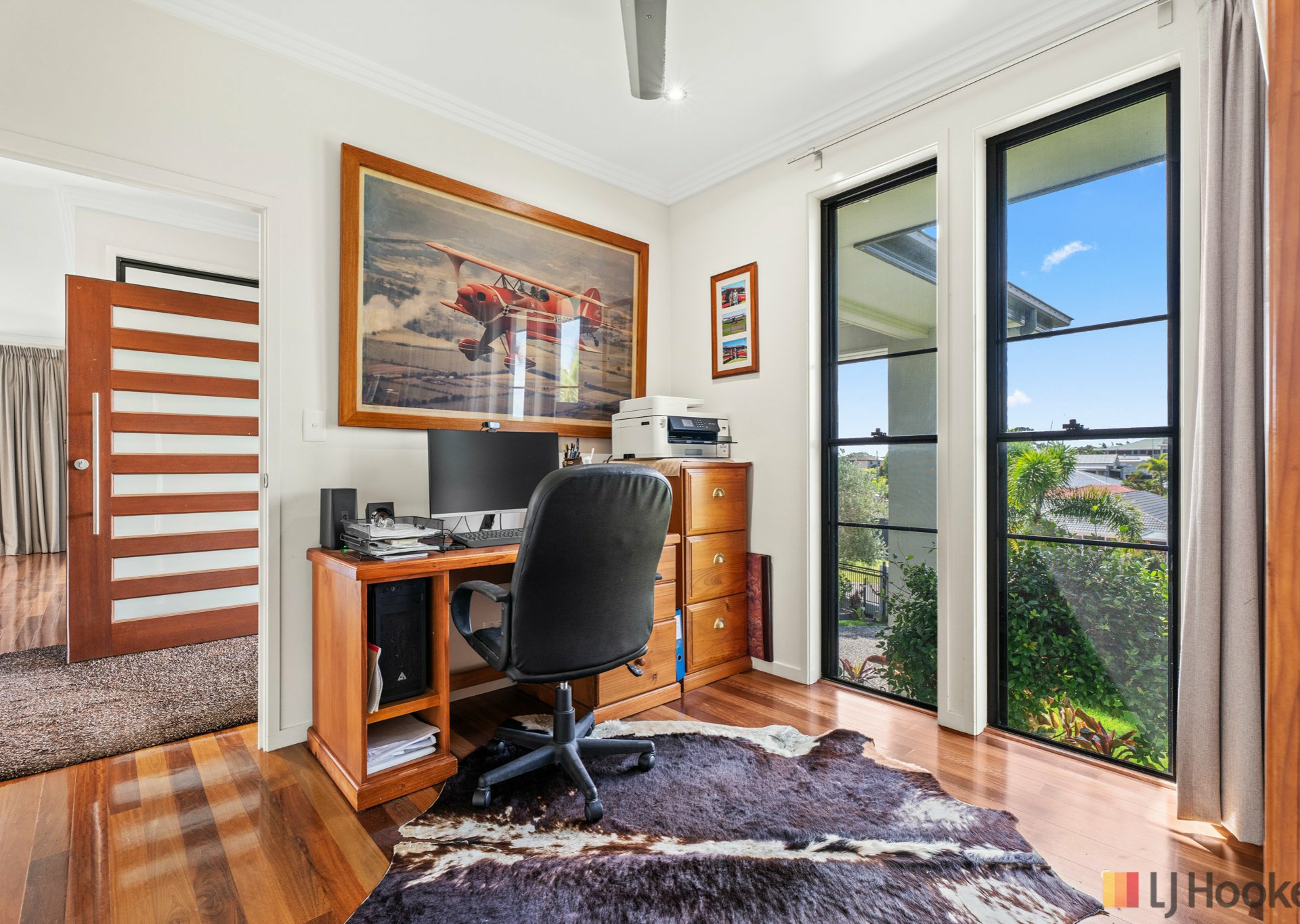 Inside, expansive open-plan living, dining and kitchen areas are enhanced by polished timber floors and an abundance of natural light, creating a warm yet sophisticated atmosphere. At the front of the home, a dedicated office or study sits adjacent to the foyer - perfectly suited for professionals working from home or those seeking a quiet retreat.