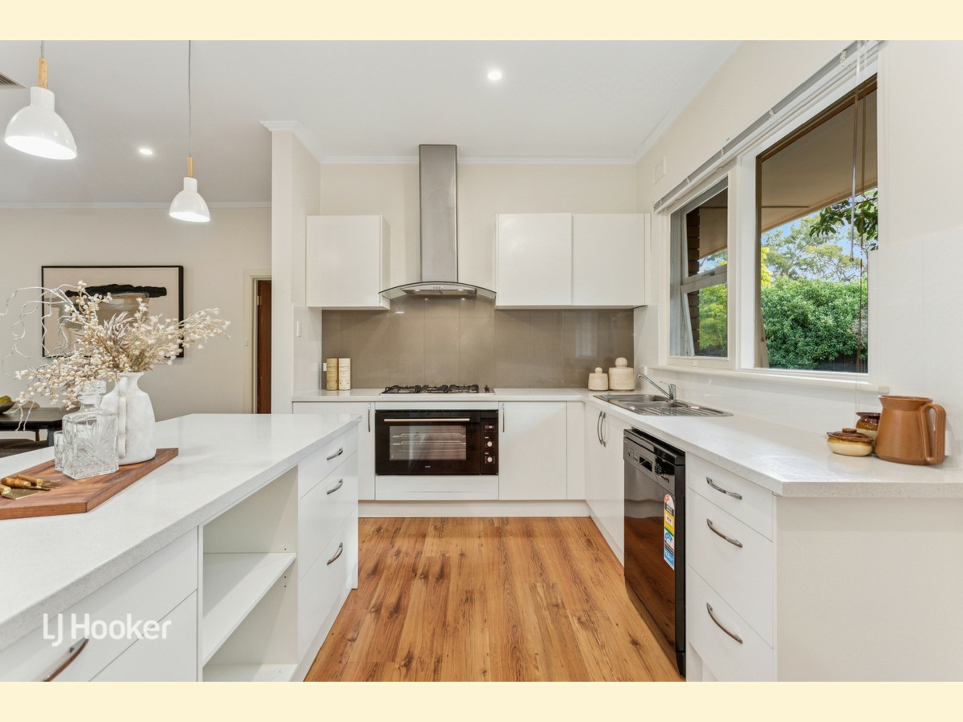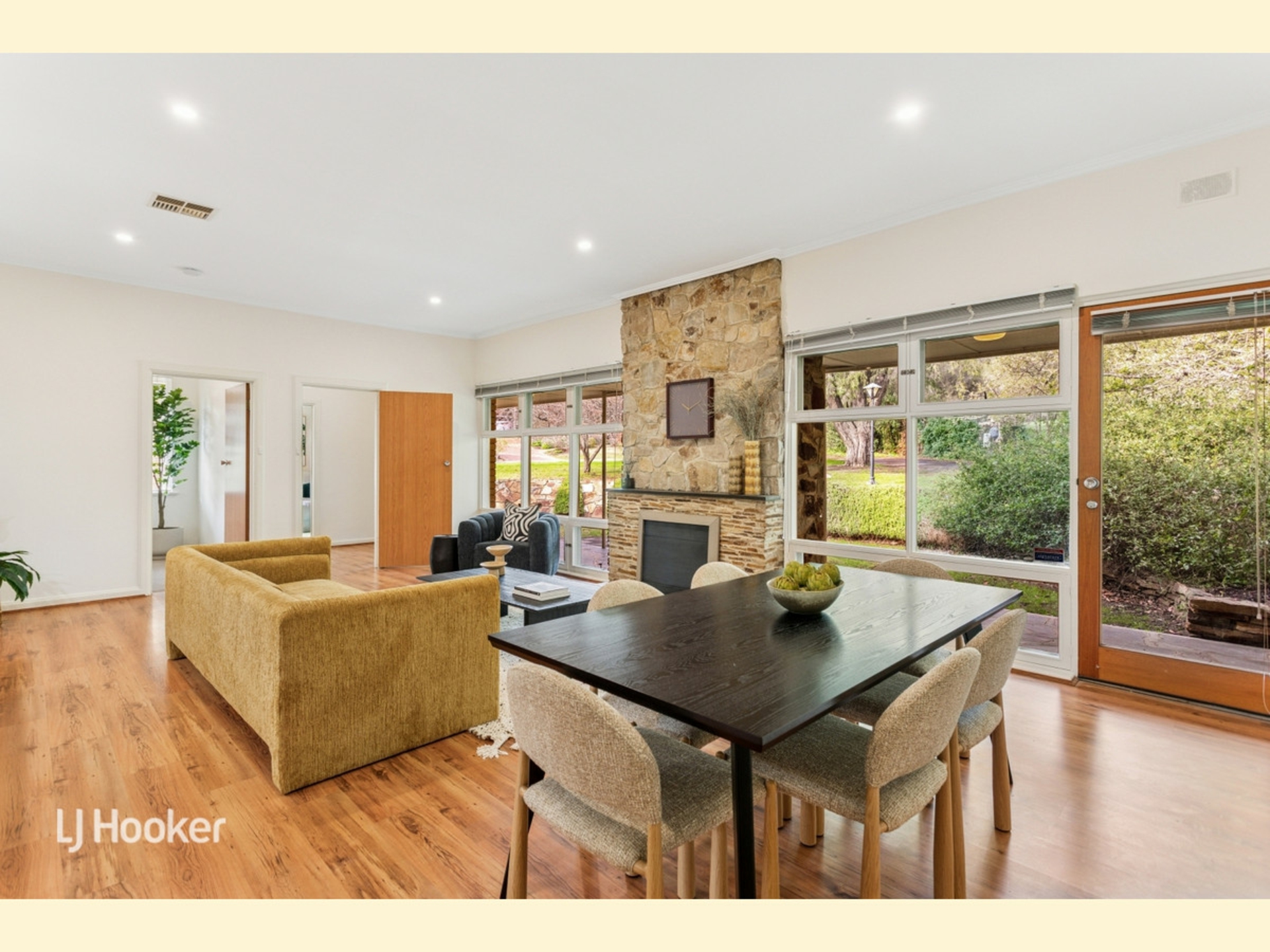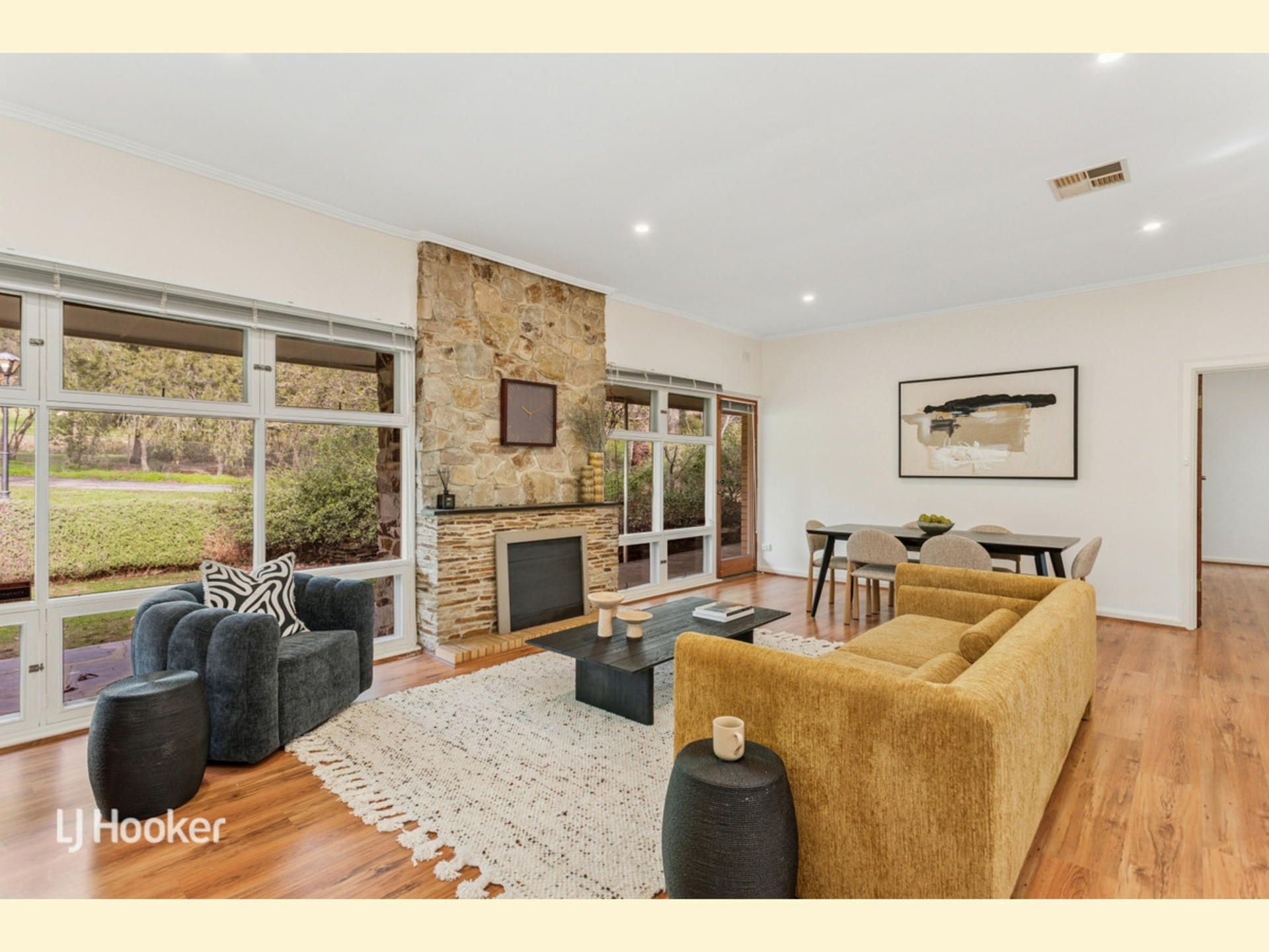 The focal point of the home is the stunning open plan kitchen, dining, and family room, filled with natural light from large windows, and anchored by a striking Carey Gully stone mantel complete with electric fire. Timber laminate flooring runs through the 2 living areas, adding both warmth and practicality.