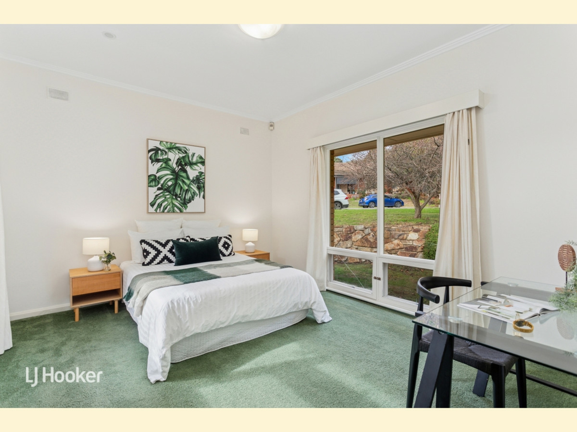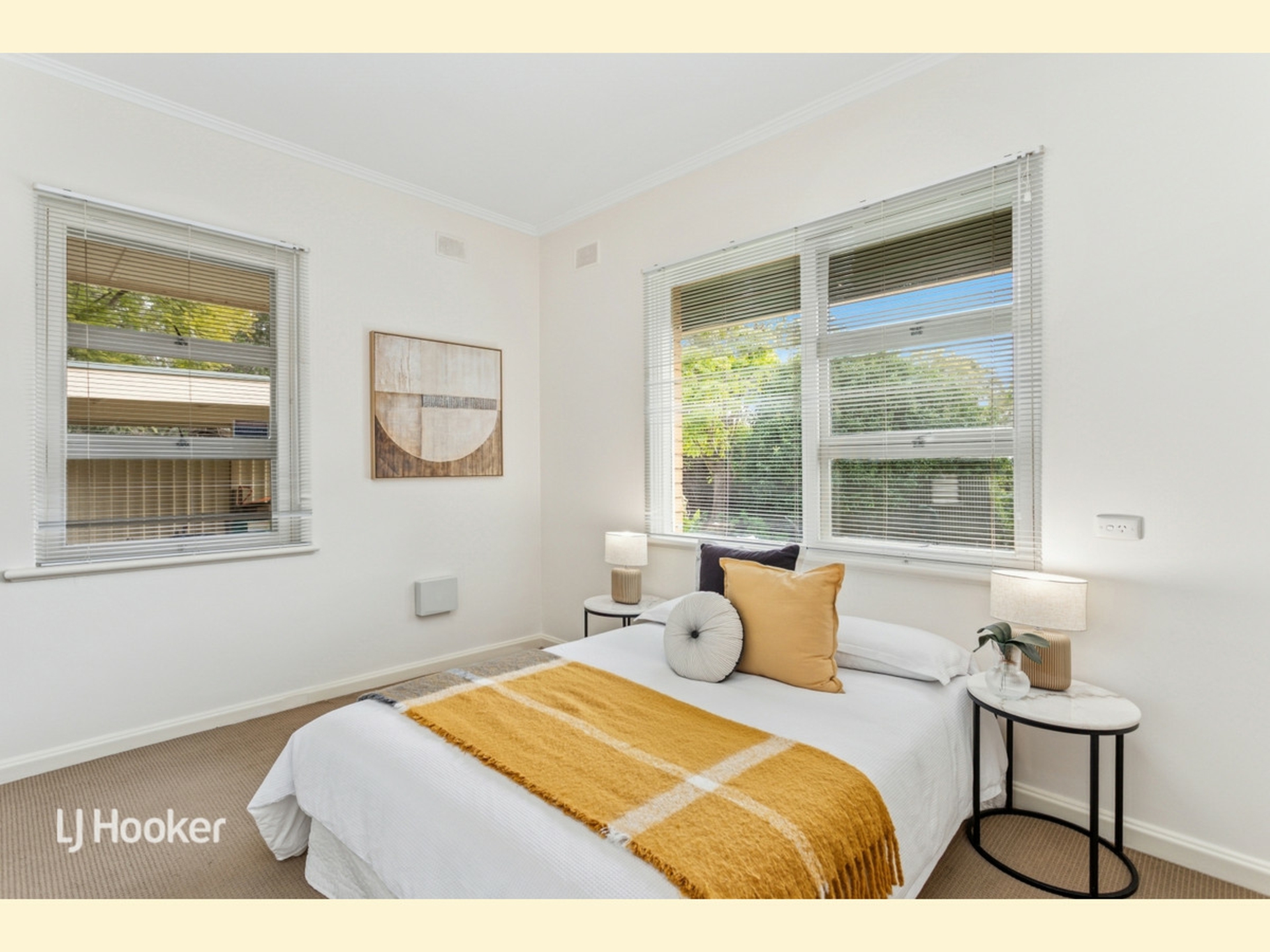The main bedroom is generously sized and features charming corner windows that overlook the front garden, along with a full wall of built-in robes. Bedrooms 2 and 3 also include built-in storage, while bedroom 4 is positioned separately - ideal as a quiet home office or guest room if desired. All bedrooms are large, typical of this era, and carpeted for cozy comfort.