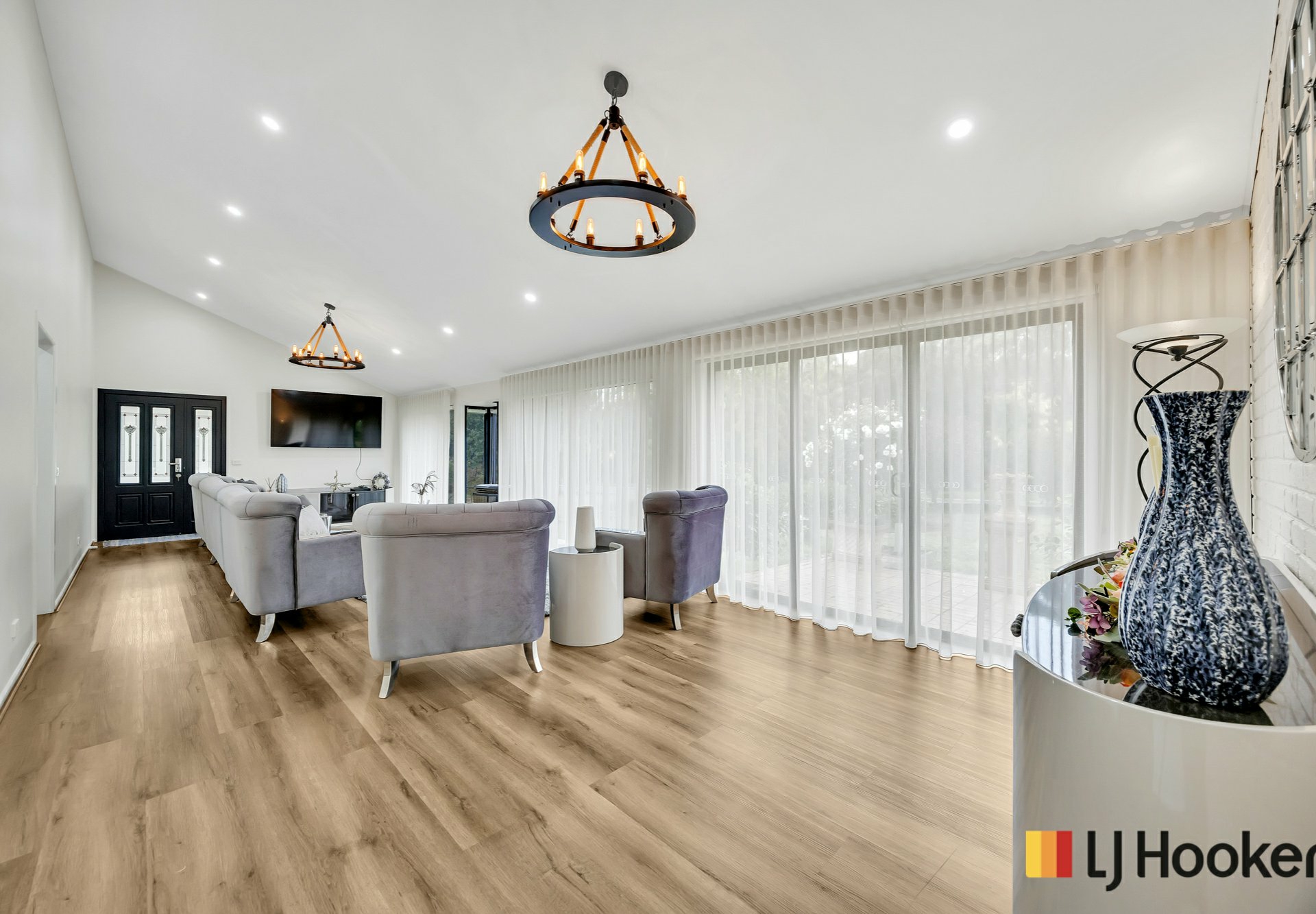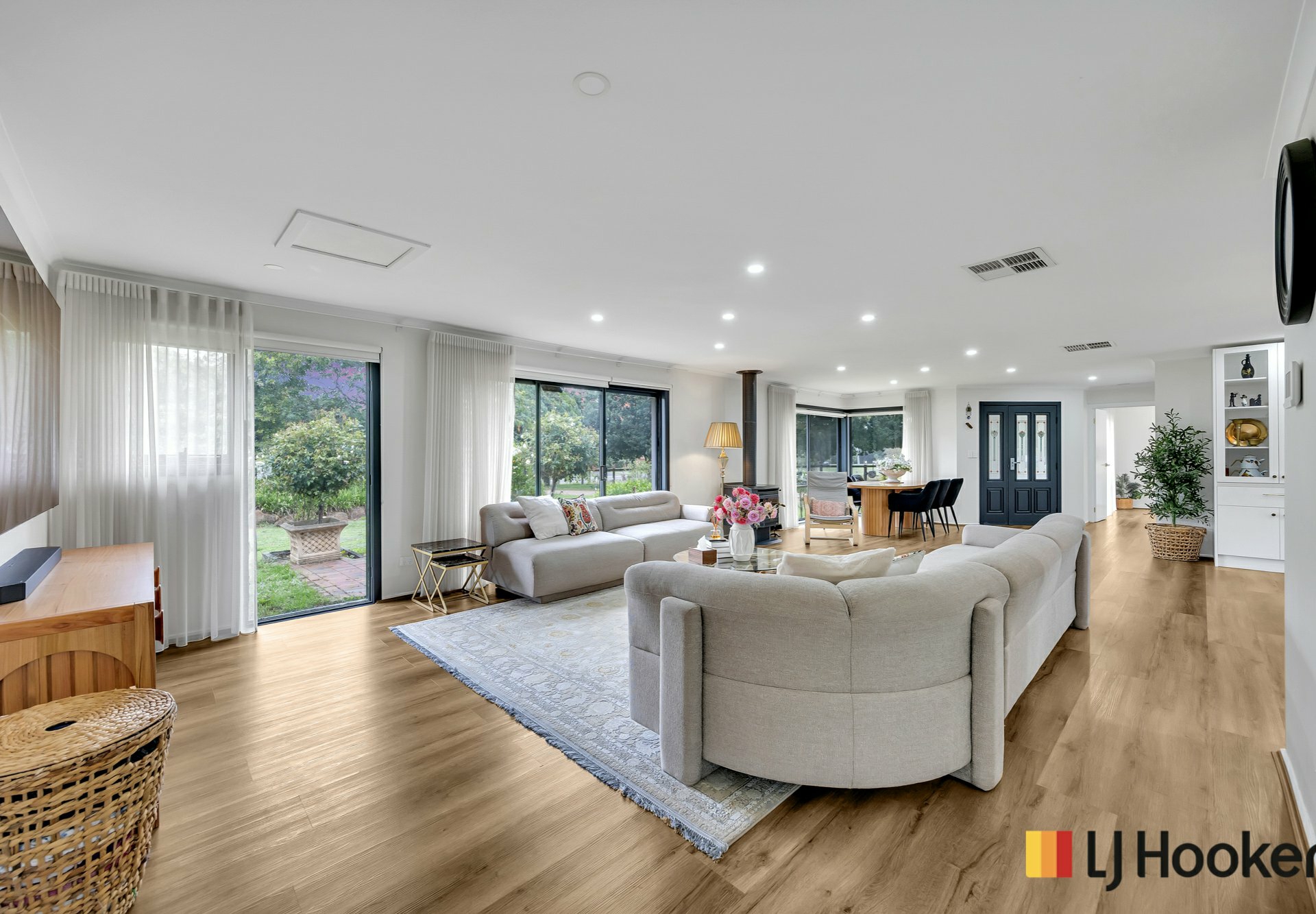 Accessed via a separate side entrance, the second wing offers a private and inviting retreat. Highlighted by a striking raked ceiling, a cosy gas fireplace, and expansive windows that fill the space with natural light, it creates a warm and relaxing atmosphere. It’s the perfect place to unwind after a long day, enjoying a glass of wine by the fire while taking in the beautiful outlook of the front yard.