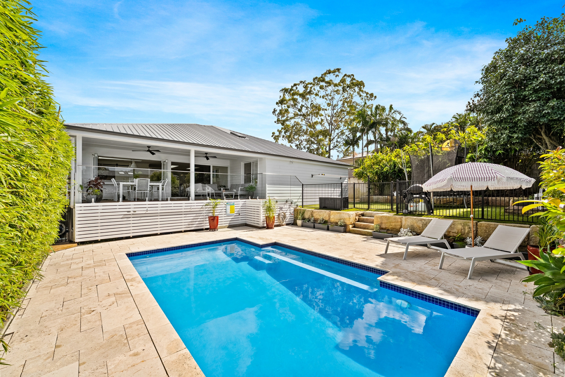 Outdoors, a heated saltwater pool is framed by travertine tiles and established bamboo, offering a private and practical space for entertaining or relaxing. Adding further flexibility, the ground floor studio with its own bathroom is ideal for guest accommodation, a home office, teenage retreat or potential rental income stream.