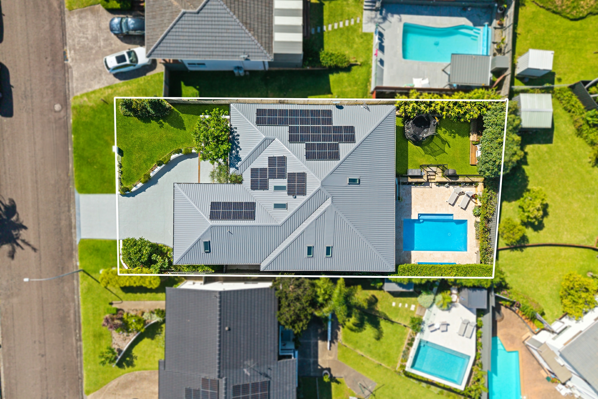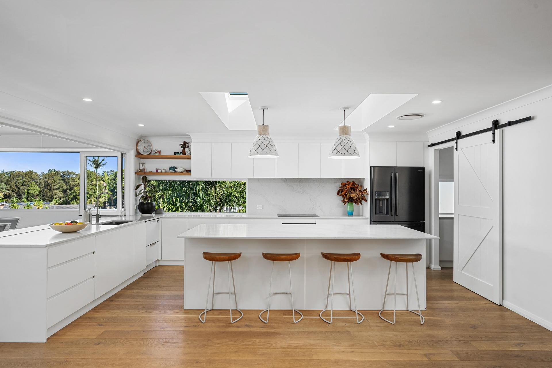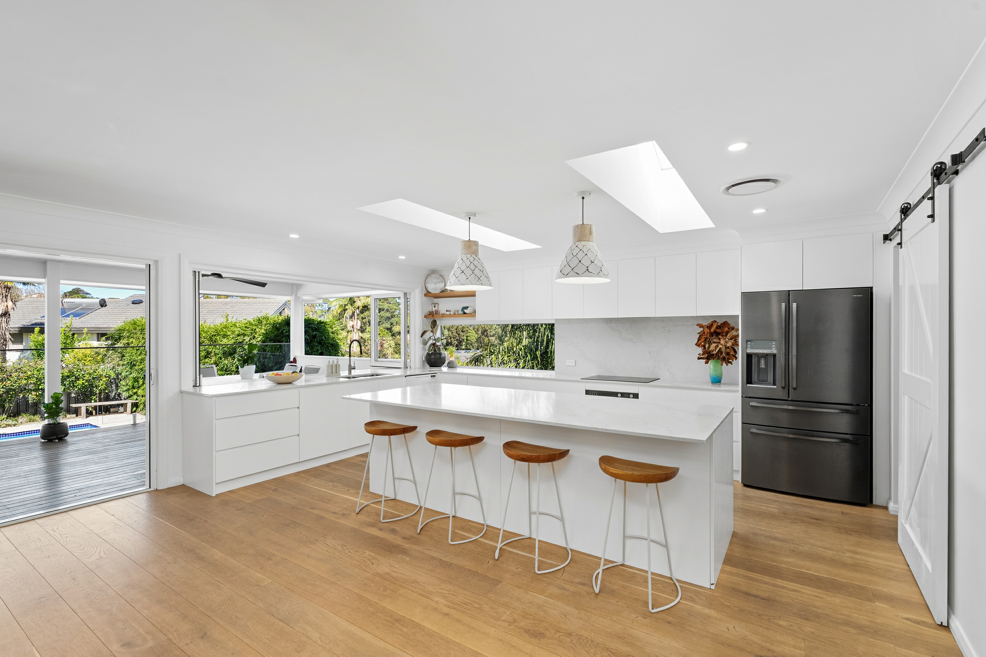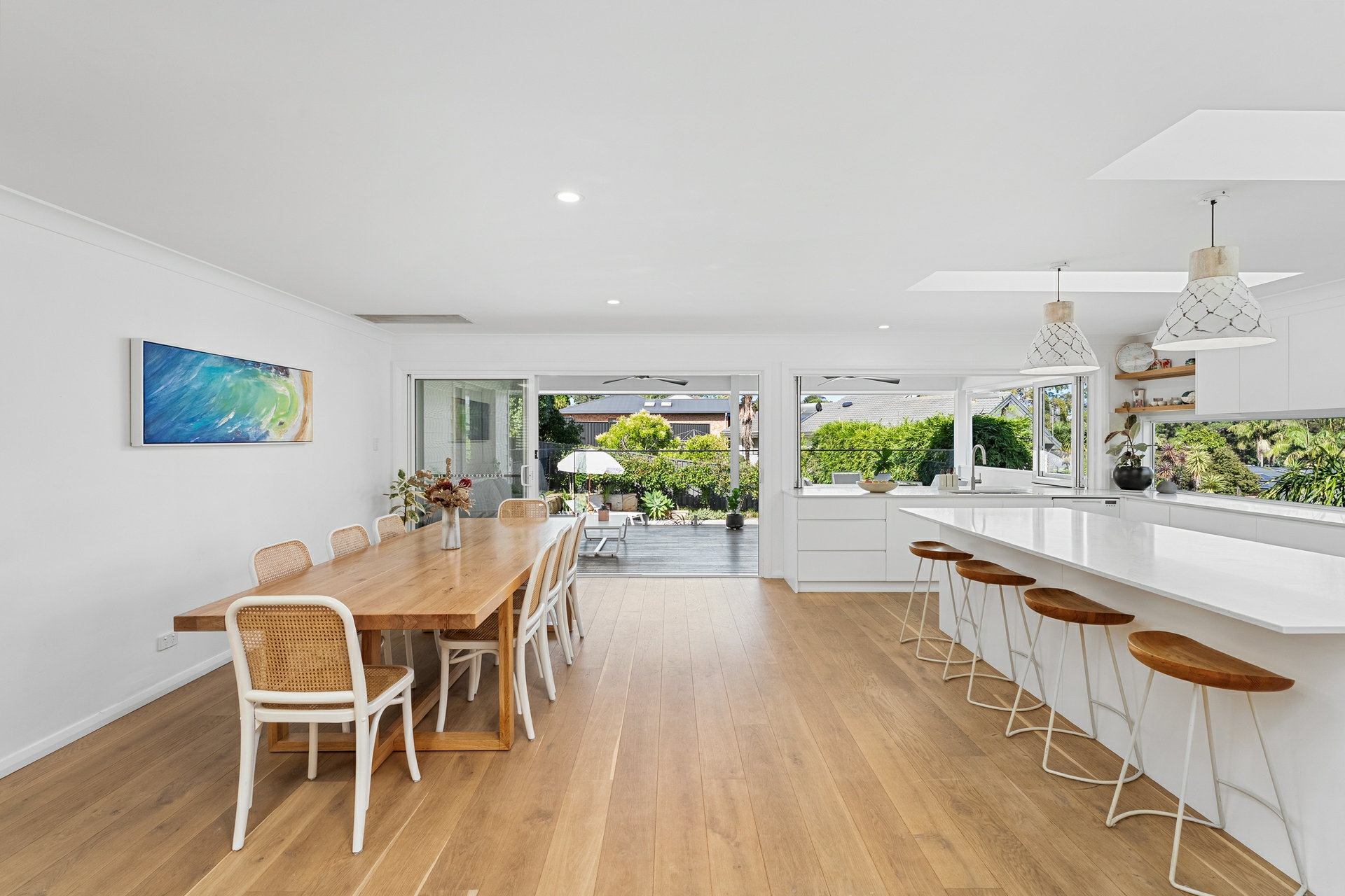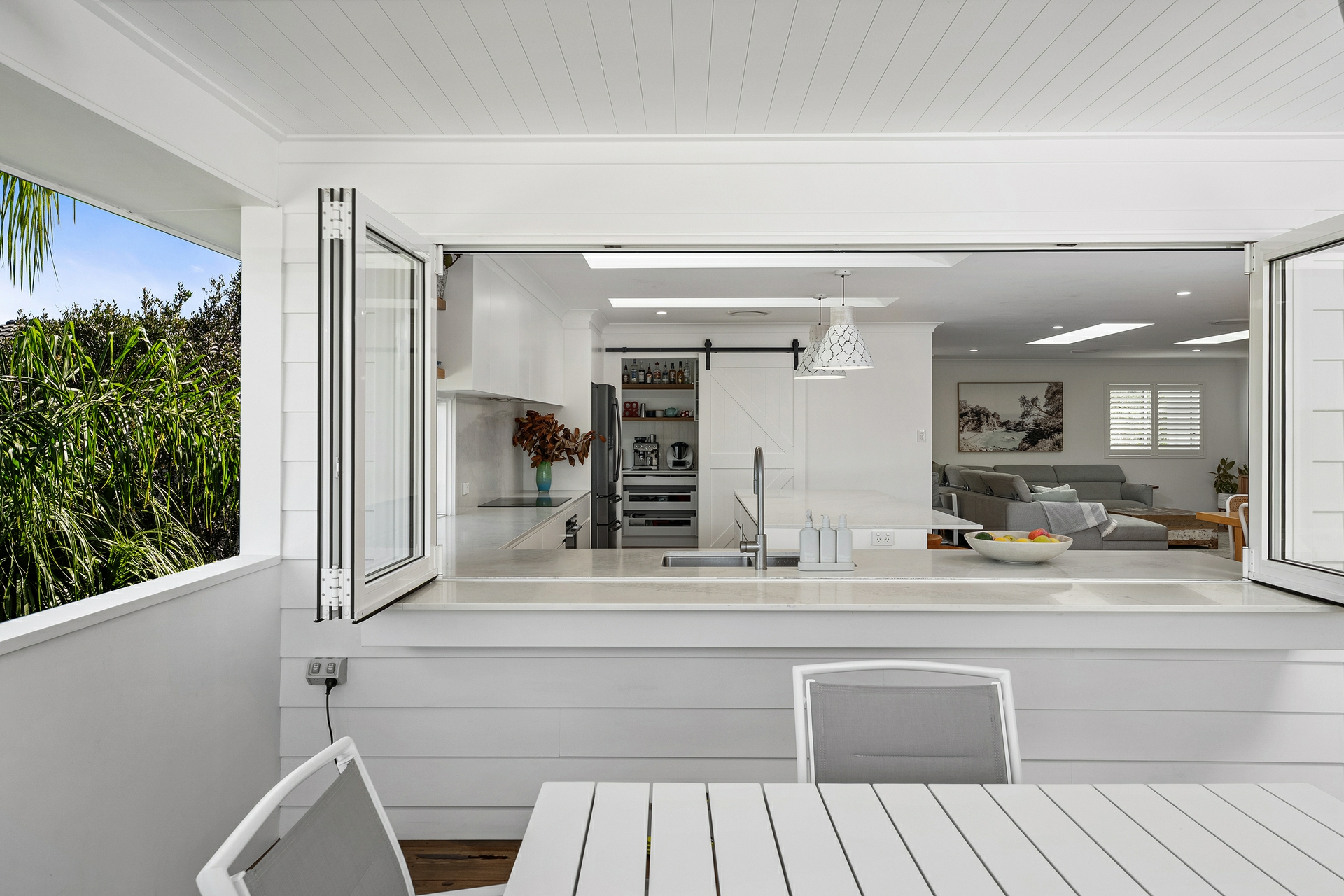 Inside, light-filled interiors are enhanced by Velux skylights and beautiful engineered oak flooring that flows throughout, creating a warm yet sophisticated feel. The expansive open-plan living and dining zone connects seamlessly to a modern entertainers' kitchen appointed with premium appliances, a butler's pantry with abundant storage and a servery window that connects the kitchen to the outdoor entertaining area.