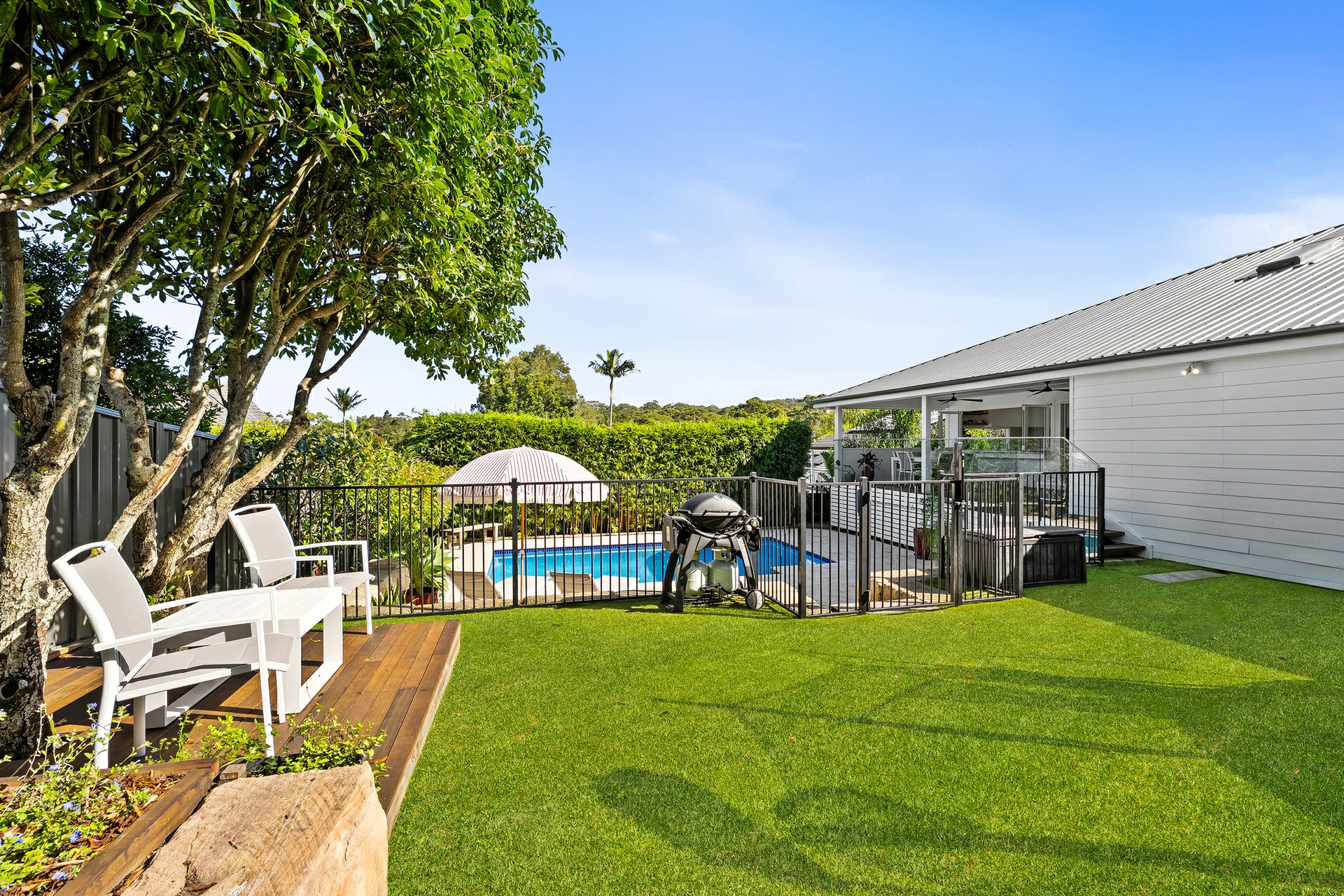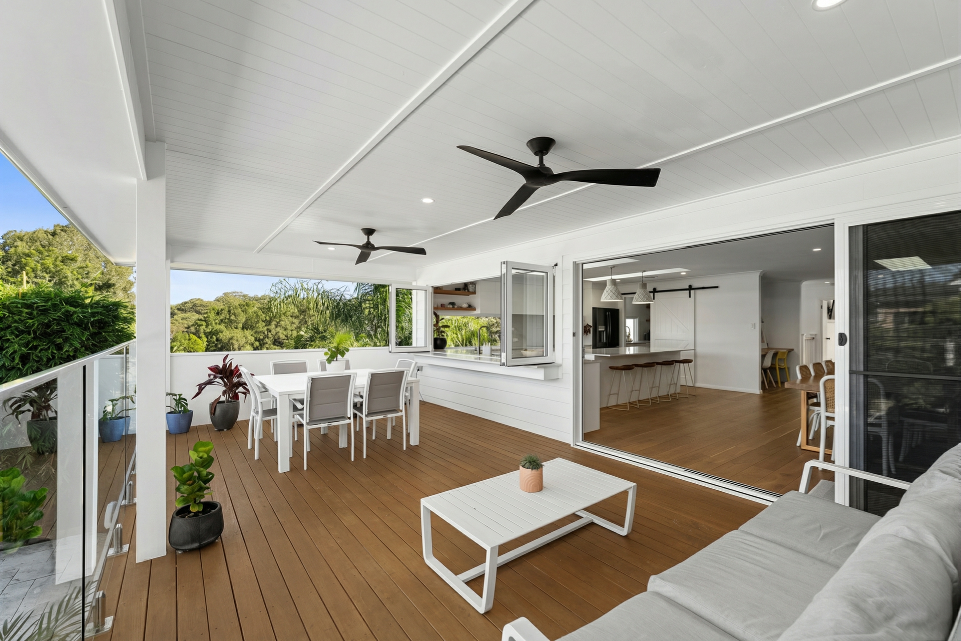 -Covered entertaining deck overlooking the pool with outdoor fans and servery bench