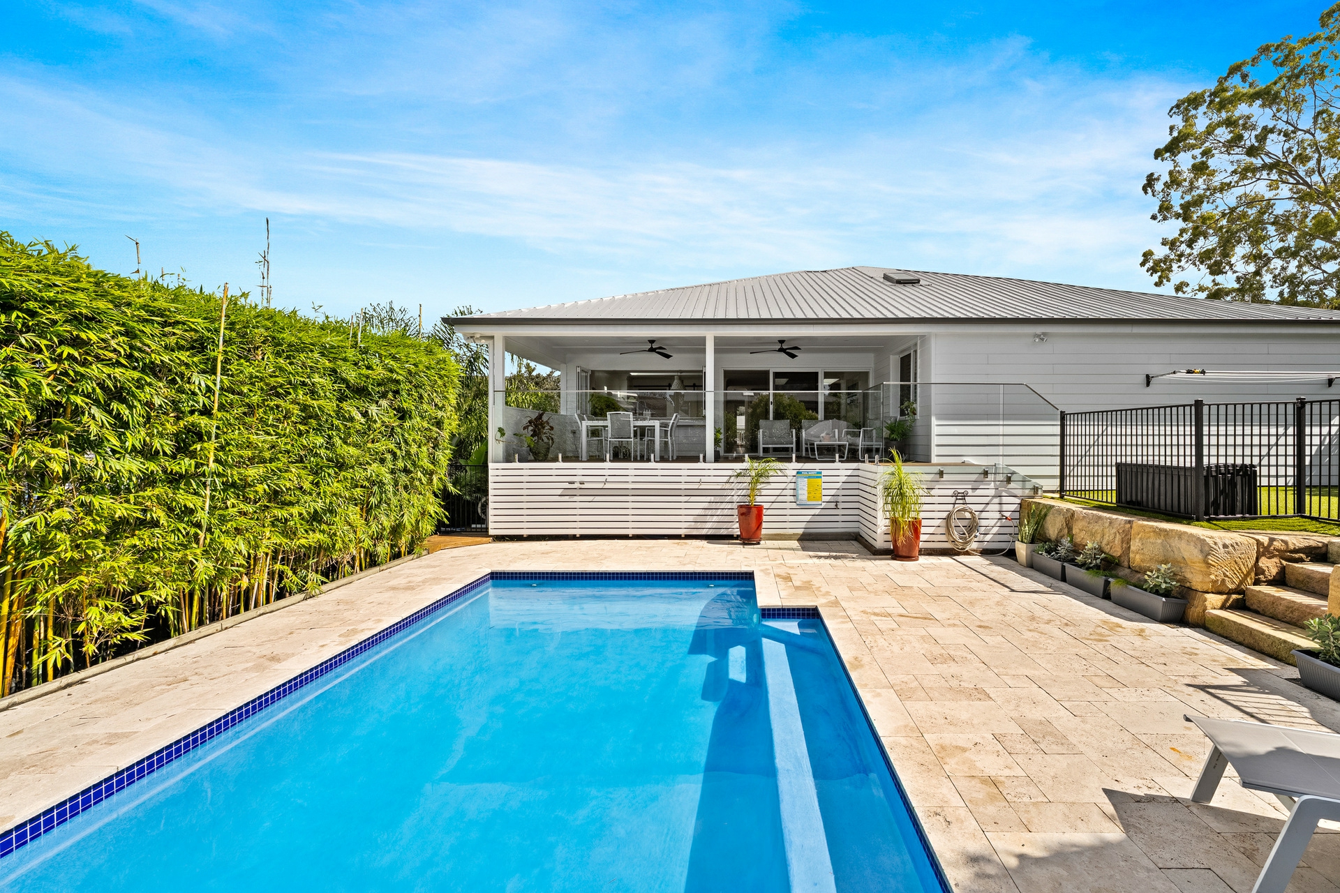 -Saltwater in-ground pool with travertine paving and bamboo screening plants for privacy