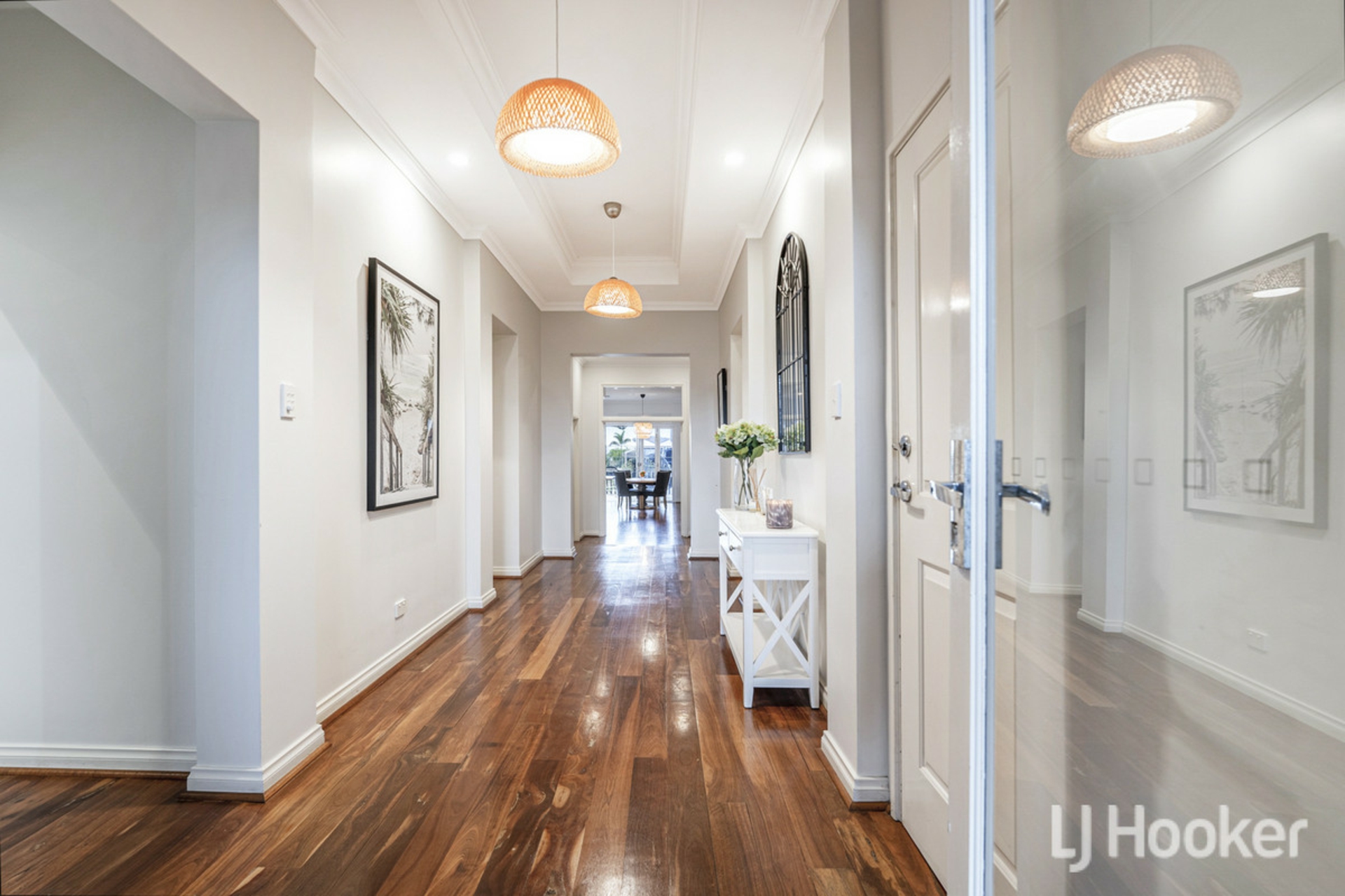 Approaching the residence from the street, you will instantly notice the striking elevation which greets you, leading you in through the nearly three-metre-high timber lined porch and into a wide entrance hall giving a sense of space which continues throughout the home.