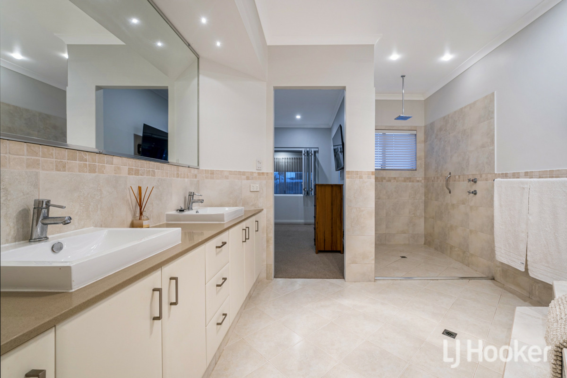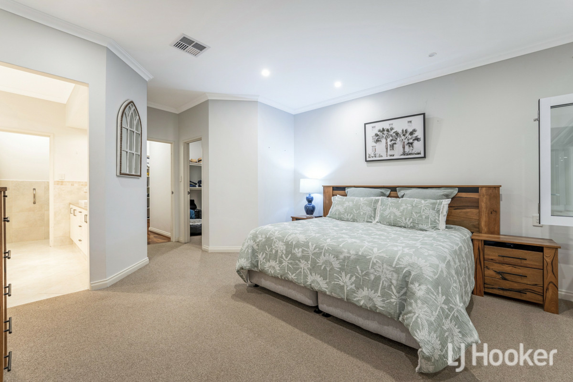 Rich jarrah timber flooring leads you through to the front wing of the home where you will find two large guest bedrooms, one of which has direct access to a large ensuite bathroom finished with bath and cabinetry.