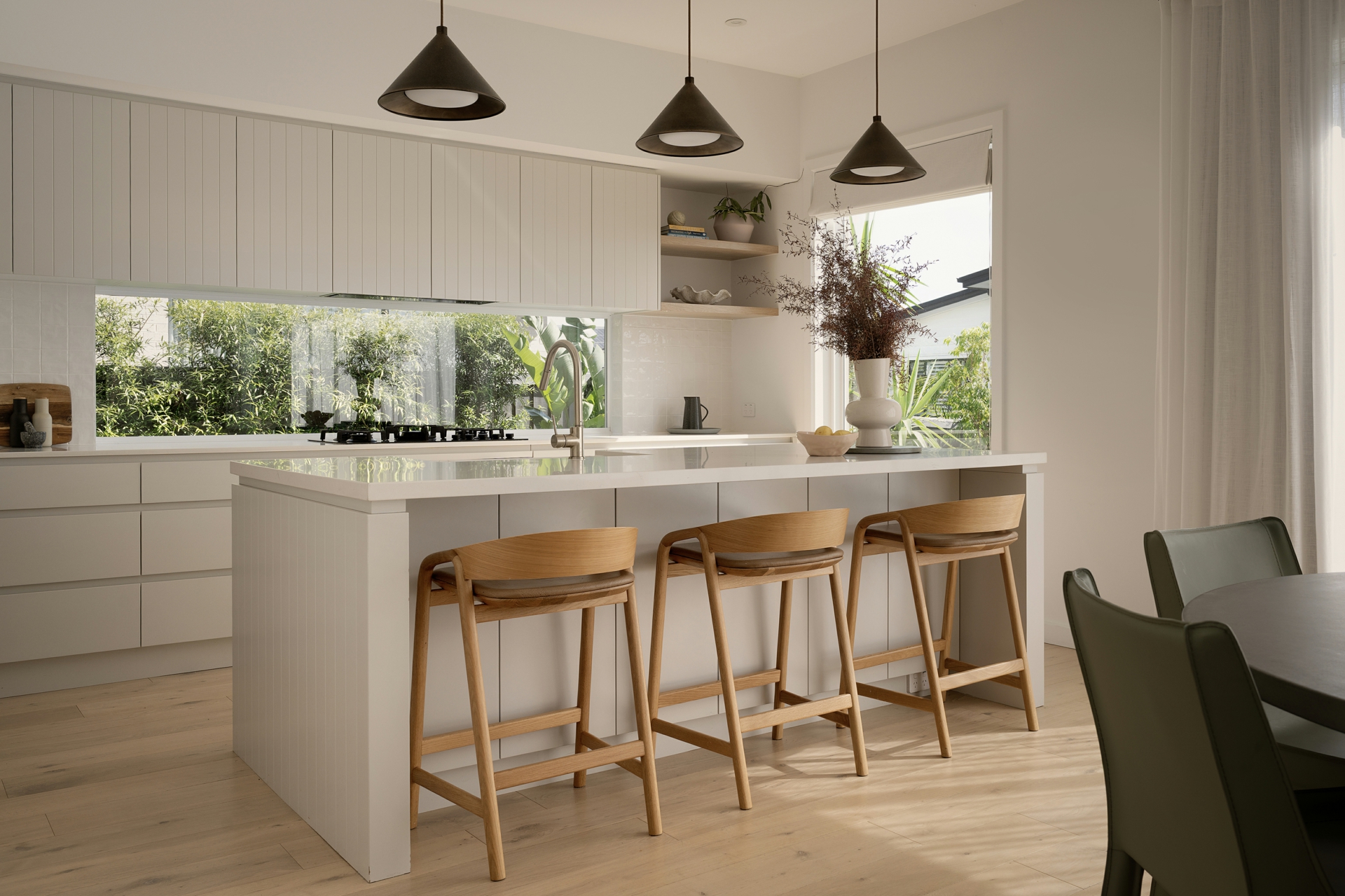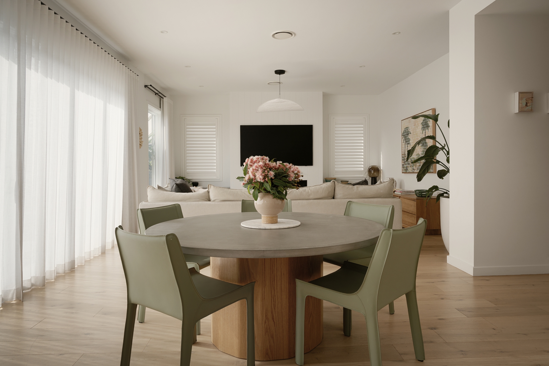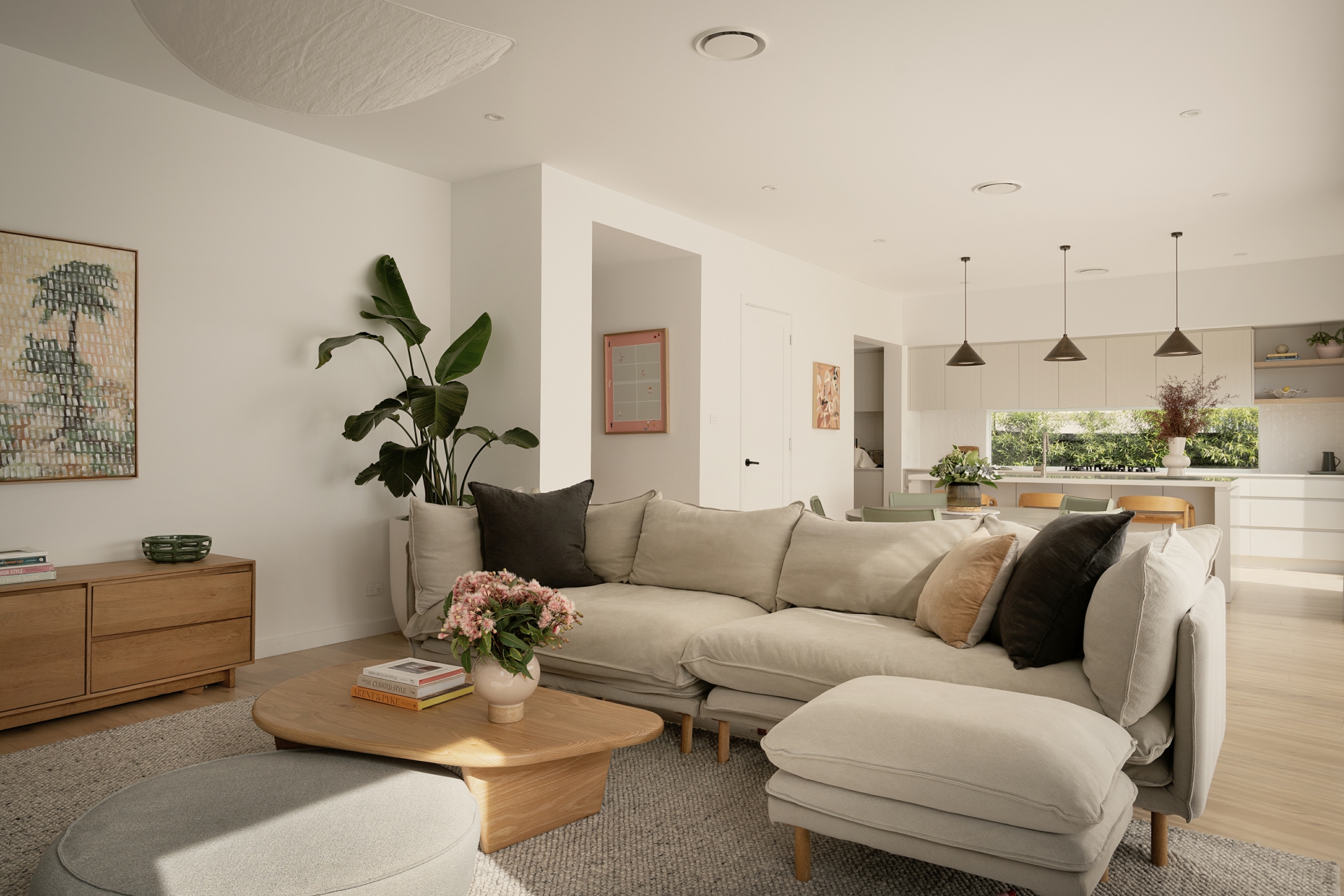 • Light-filled open-plan living and dining zone with a warm, coastal aesthetic and large sliding doors opening directly to the outdoor entertaining area