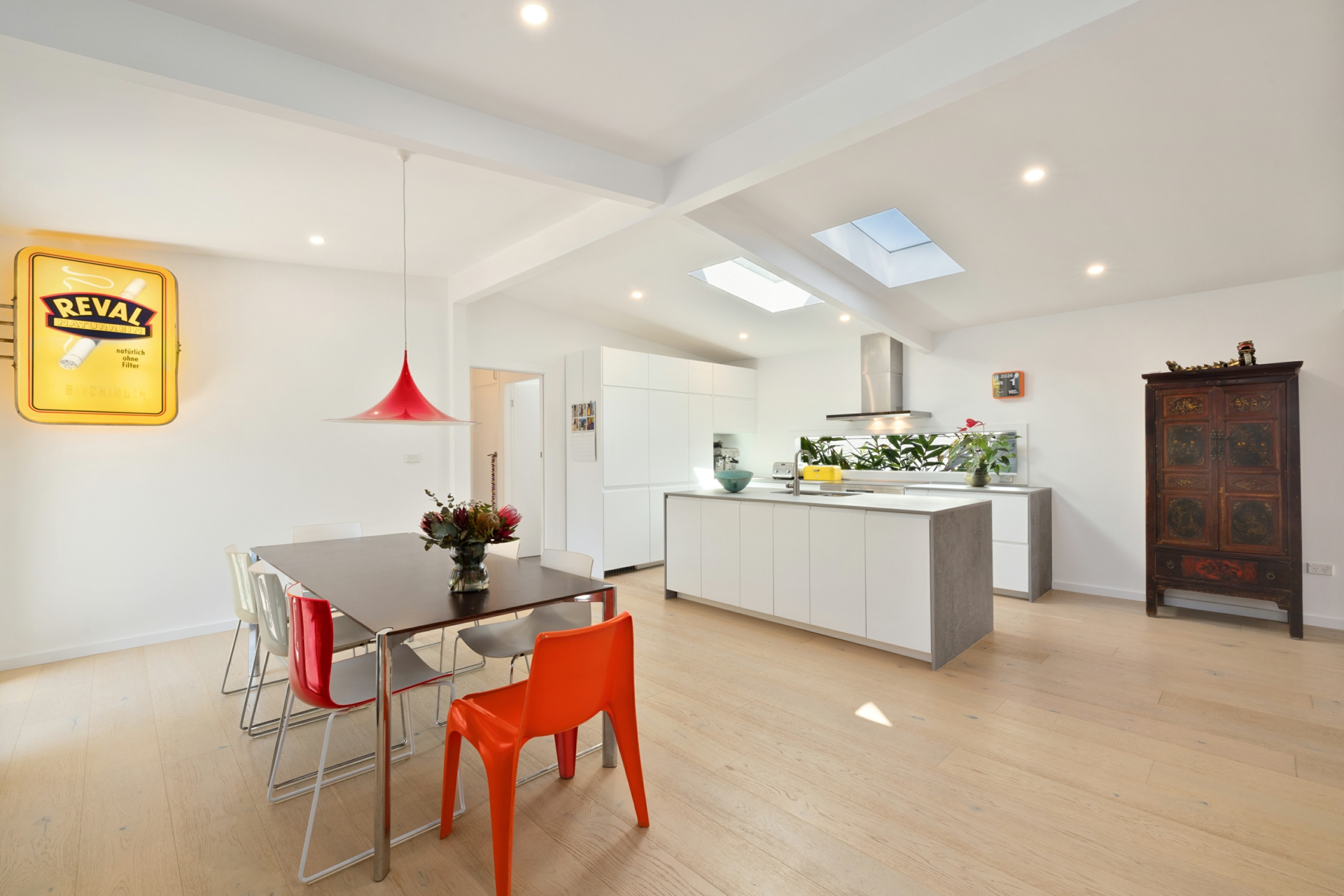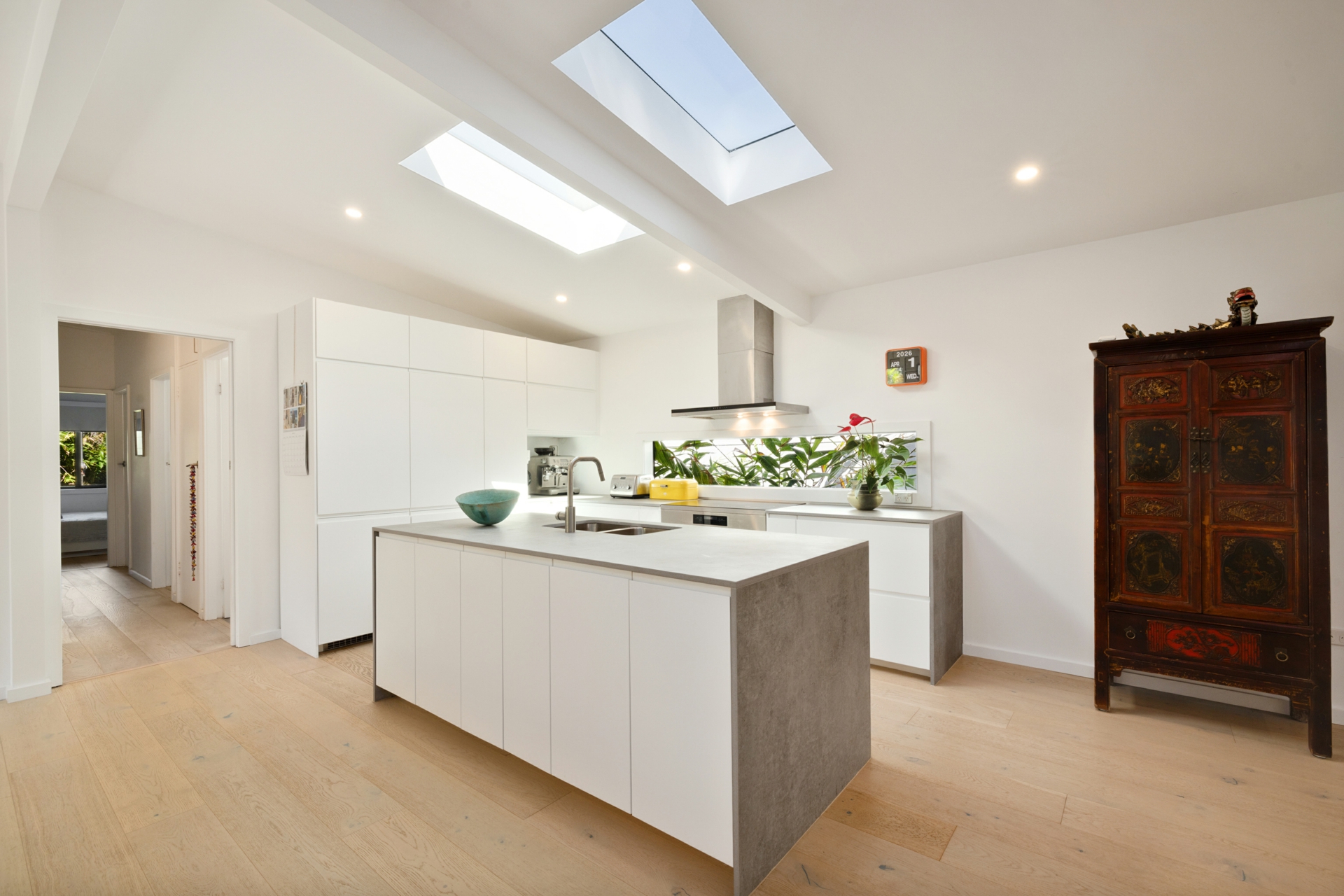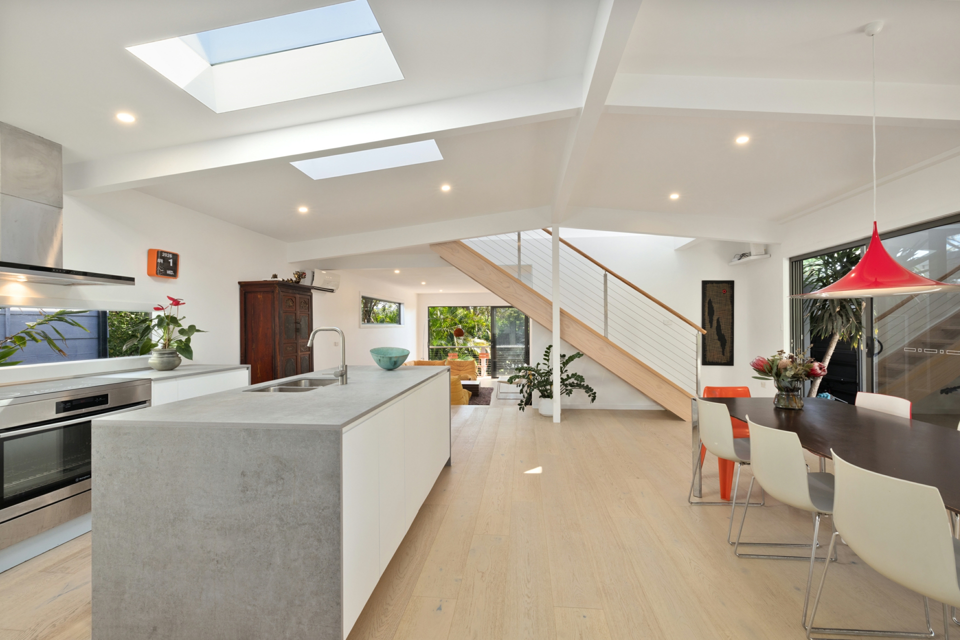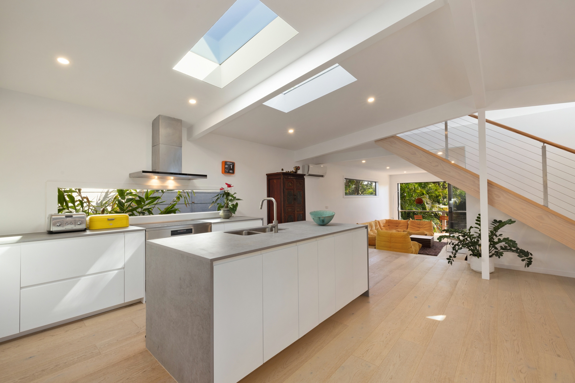 • Modern kitchen with Caesar stone island bench, quality appliances and stunning dual skylights