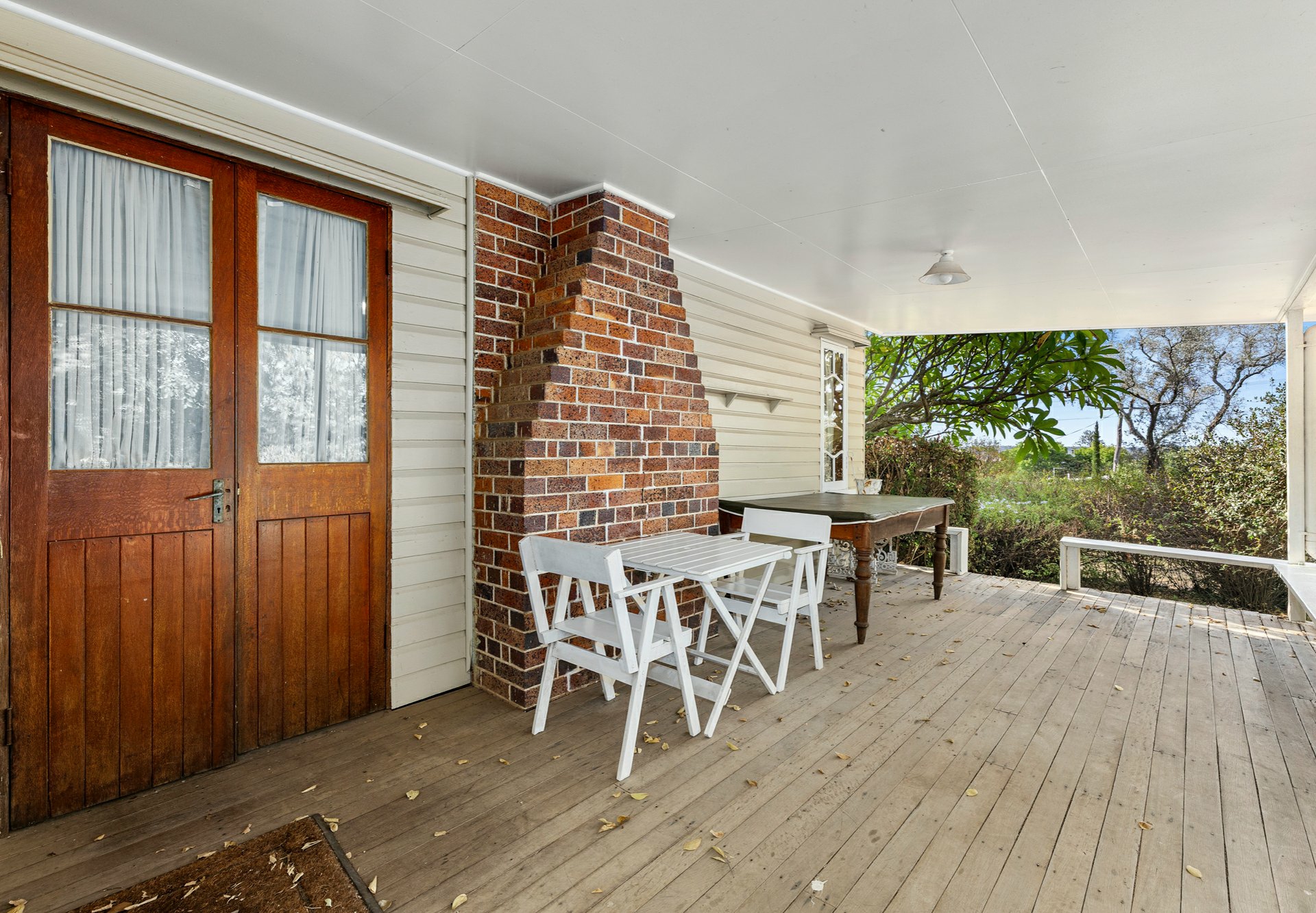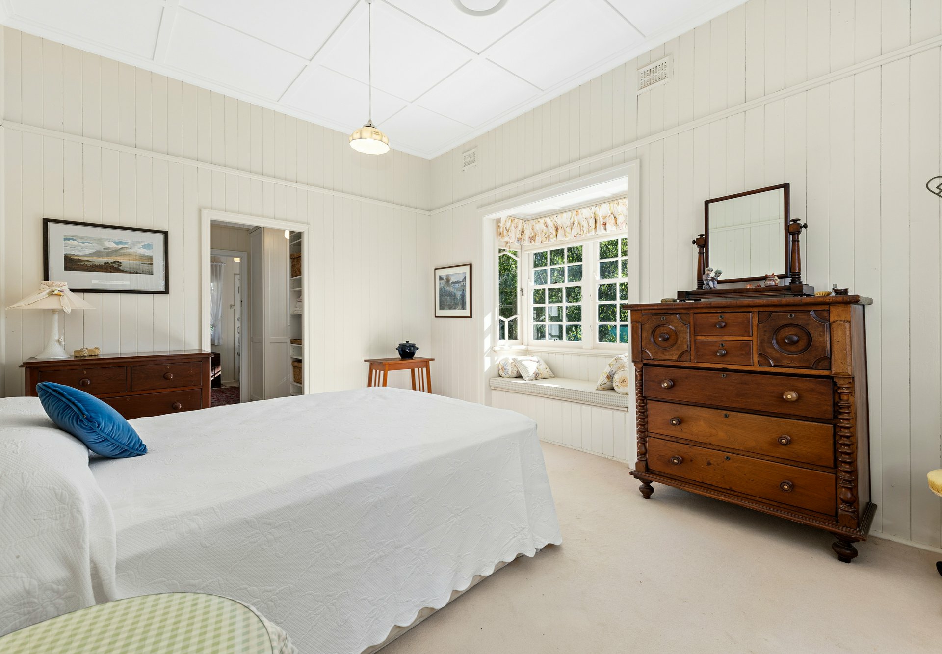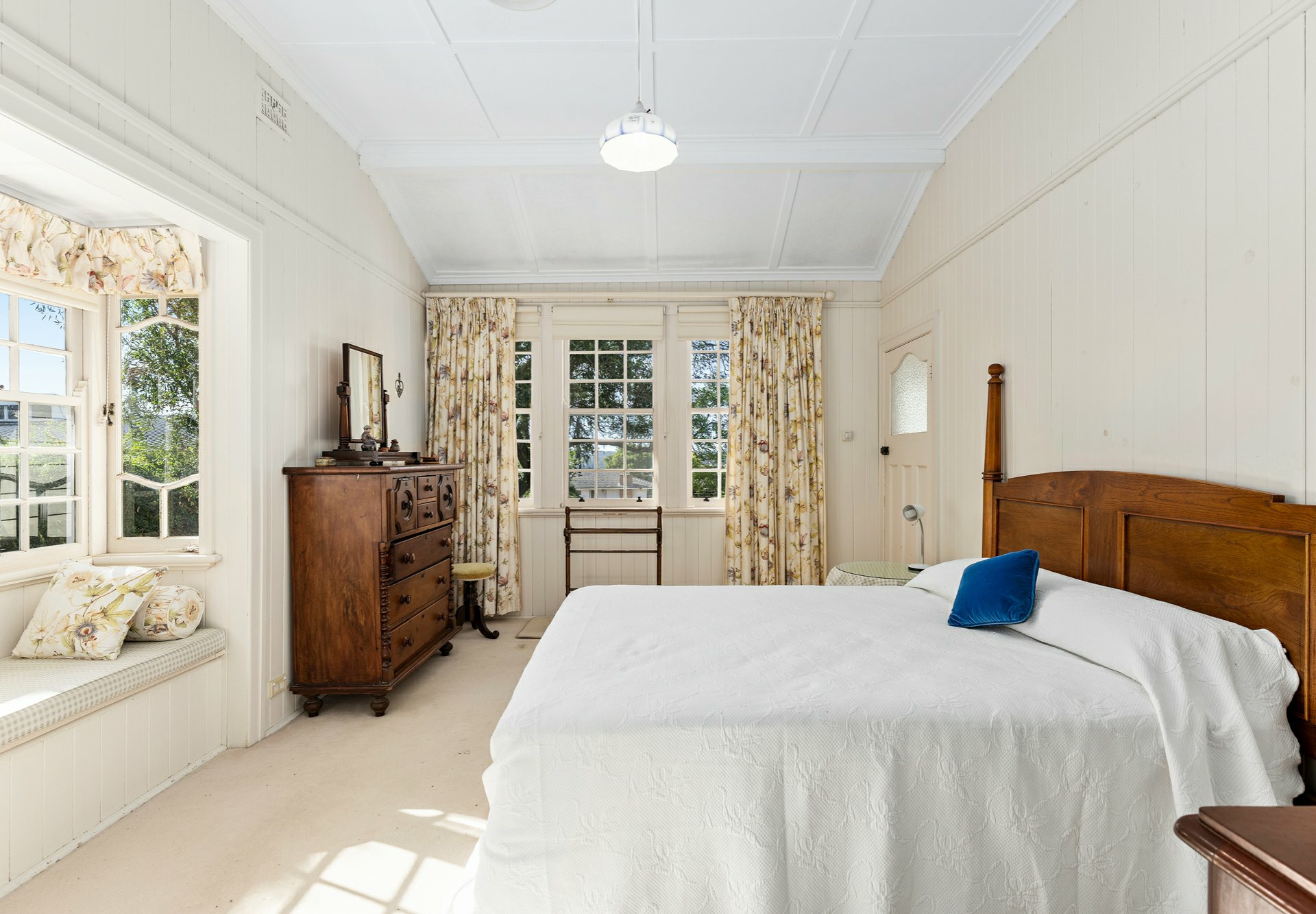 • You will notice the high ceilings, the block out, pull down blinds, there are polished floor boards, carpet as well in main bedroom, silky oak french doors out to the generous eastern deck area;