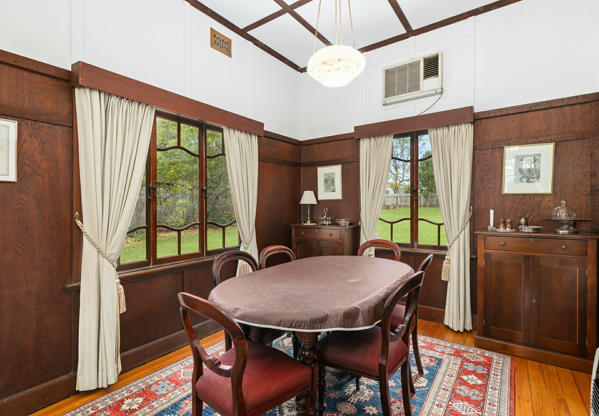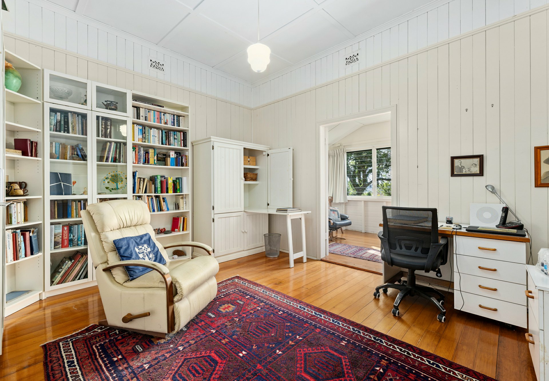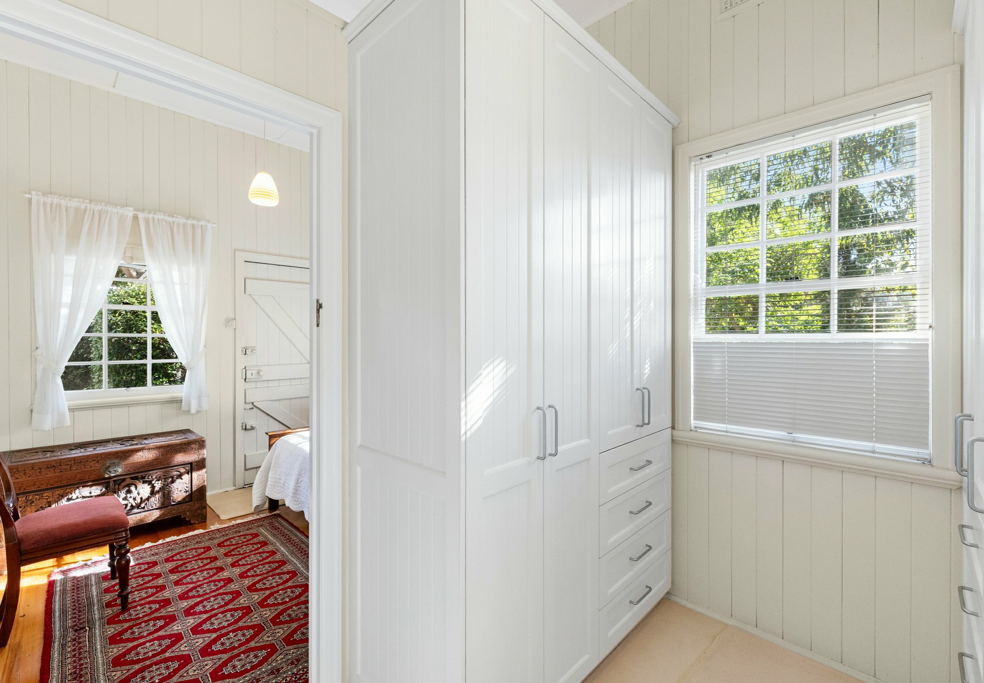 • You will notice the high ceilings, the block out, pull down blinds, there are polished floor boards, carpet as well in main bedroom, silky oak french doors out to the generous eastern deck area;