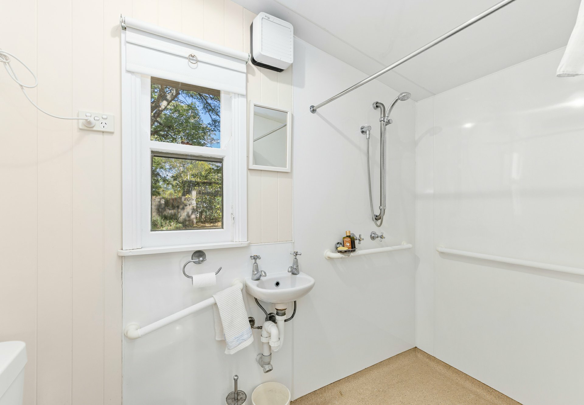 • the second Bathroom is toward the rear, utility area of the home, just off the Laundry where you have a hospital welded floor, laminate walled, disability grab bars, a walk in shower space, toilet and basin. This is great also when you have been out toiling in the garden to slip in to this Bathroom to shower;