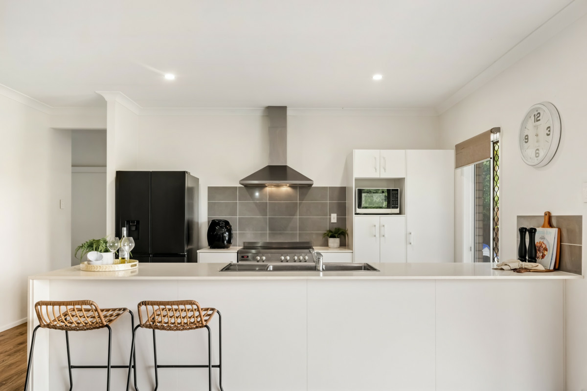 The chef in the family will enjoy cooking up a storm with the 900mm oven, stainless steel range hood and dishwasher. Stone bench tops with waterfall edging, a large breakfast bar, double fridge space and plenty of cupboards.