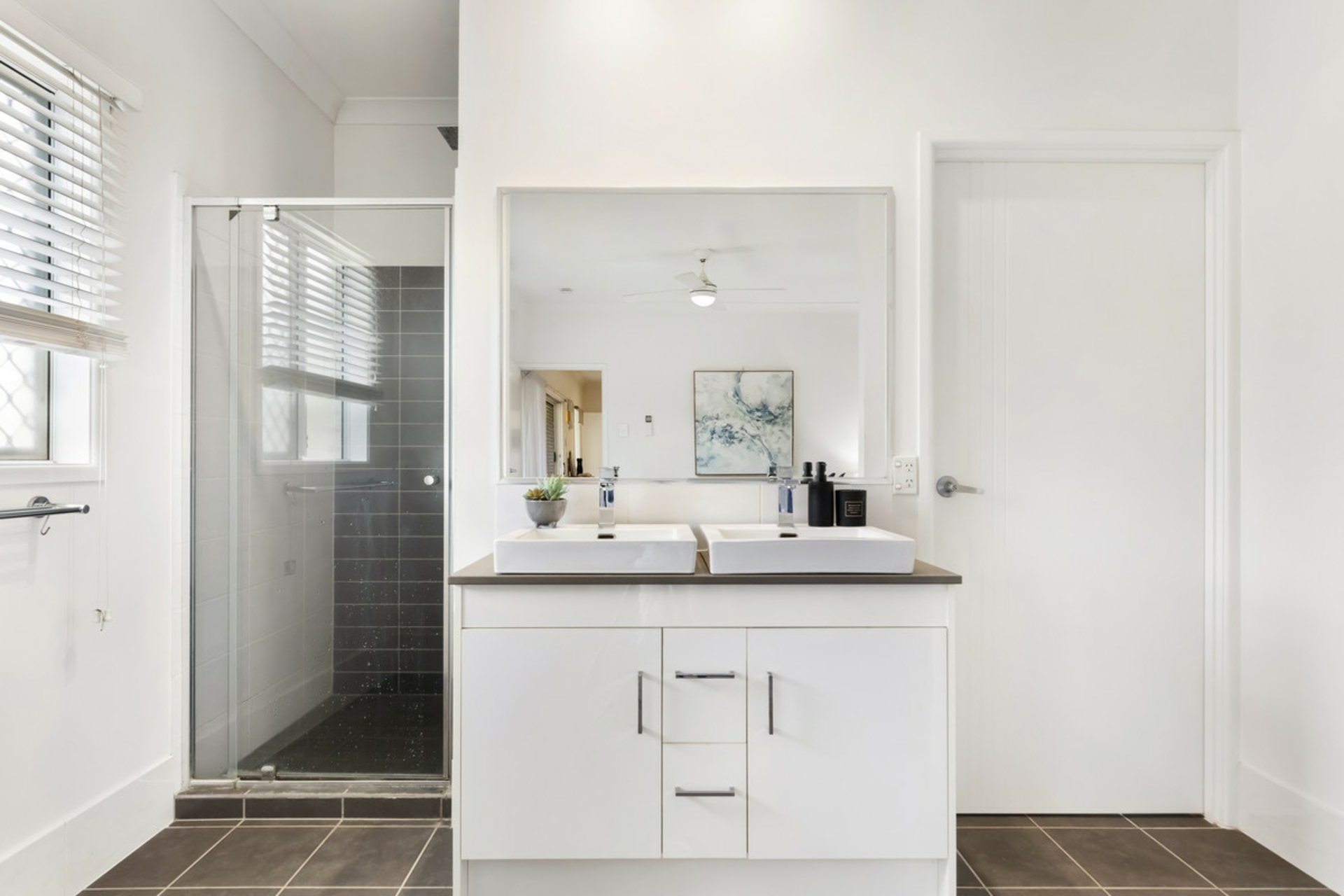 To the front of the home is the fourth bedroom that could easily be used as a study. Two additional bedrooms to the rear, all with built-ins and ceilings fans, plus the spacious air-conditioned master bedroom which has a walk-in robe and hotel inspired open plan ensuite with dual vanities, stone bench tops, large walk-in shower with two shower roses to one side and the toilet to the other side.