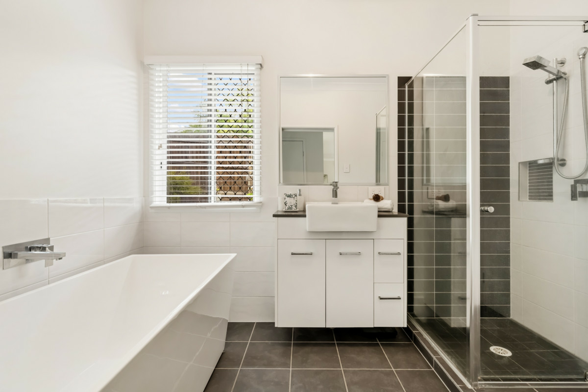 The modern main bathroom features a gorgeous free standing bathtub and stone bench tops. A separate toilet.
