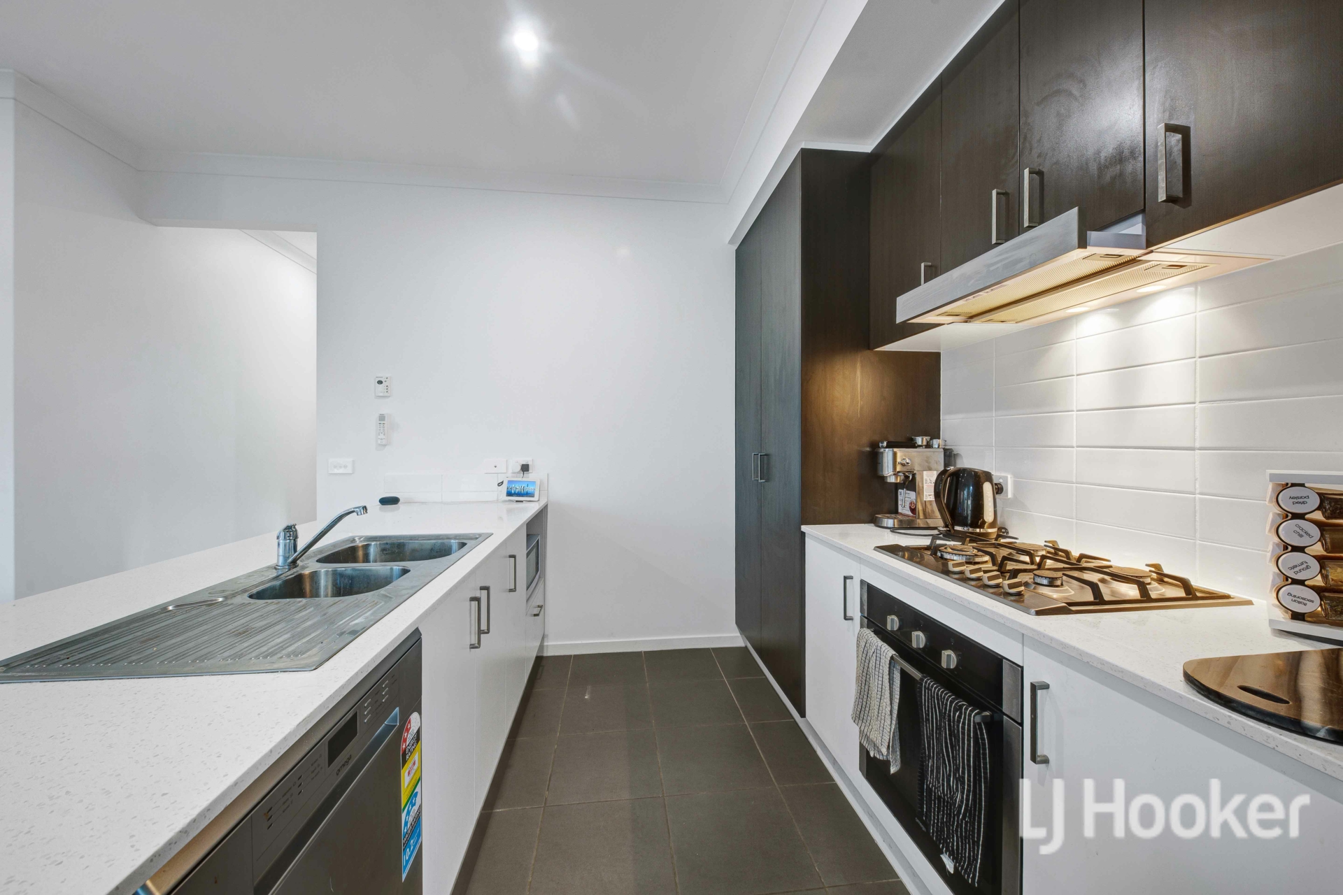 The stylish kitchen is fitted with stone benchtops, a gas cooktop, gas oven, dishwasher, and a modern splashback, making it perfect for both everyday living and entertaining. The master bedroom features a walk-in robe and private ensuite, while the remaining two bedrooms are equipped with built-in robes and serviced by a central bathroom that includes a bathtub.