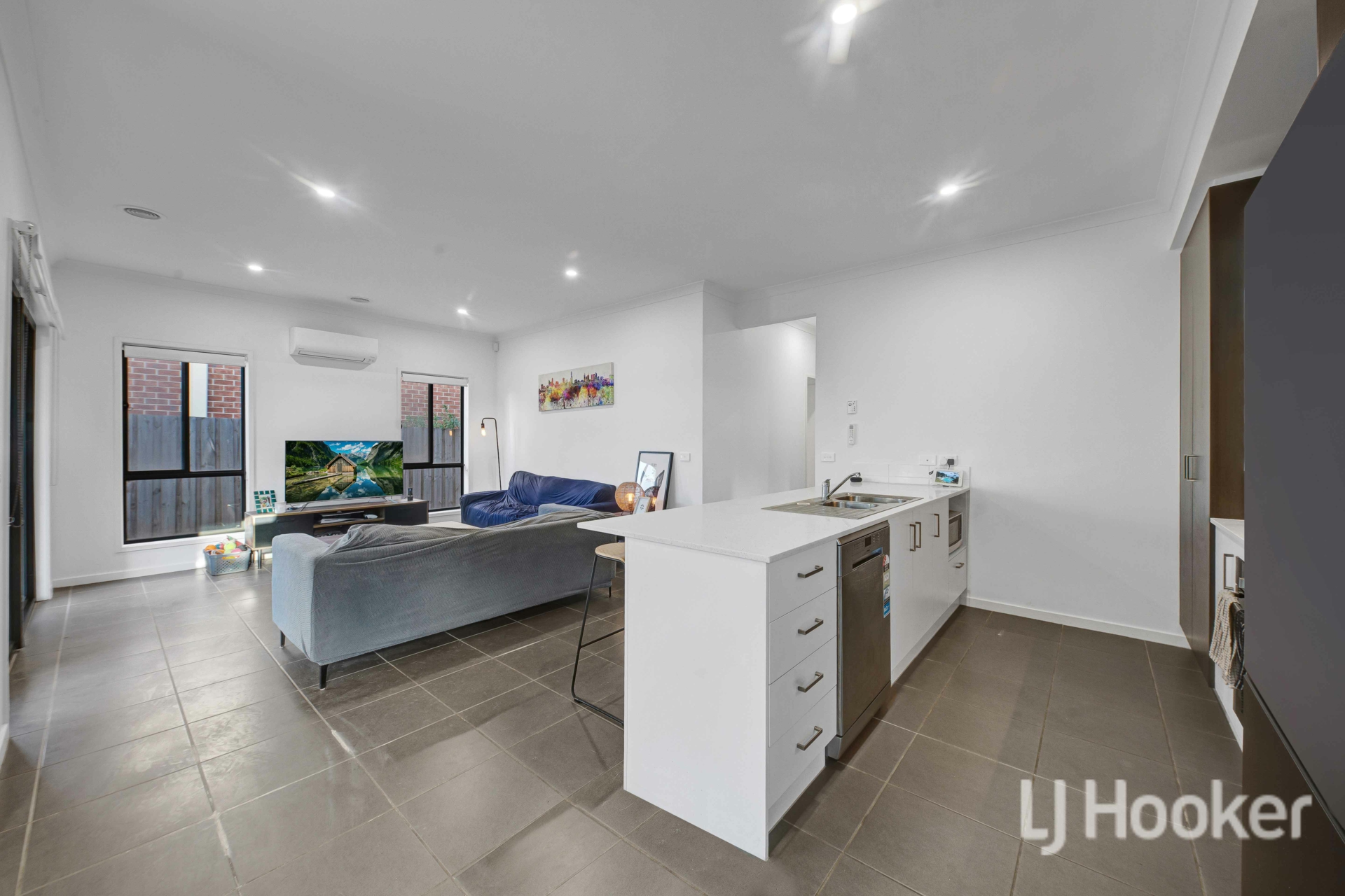 Step inside to discover high ceilings and sleek downlights that enhance the sense of space and natural light. The heart of the home is the open-plan living and dining area, complete with a split system for year-round comfort and seamlessly complemented by ducted heating throughout the entire home.