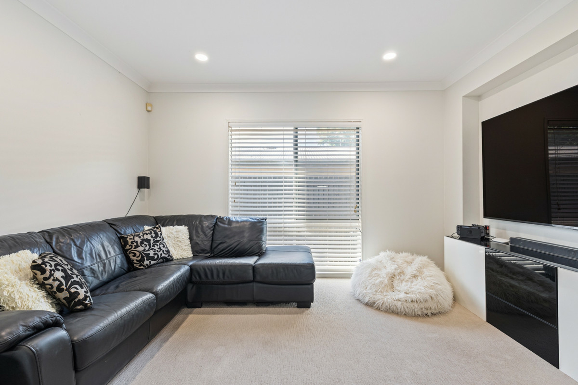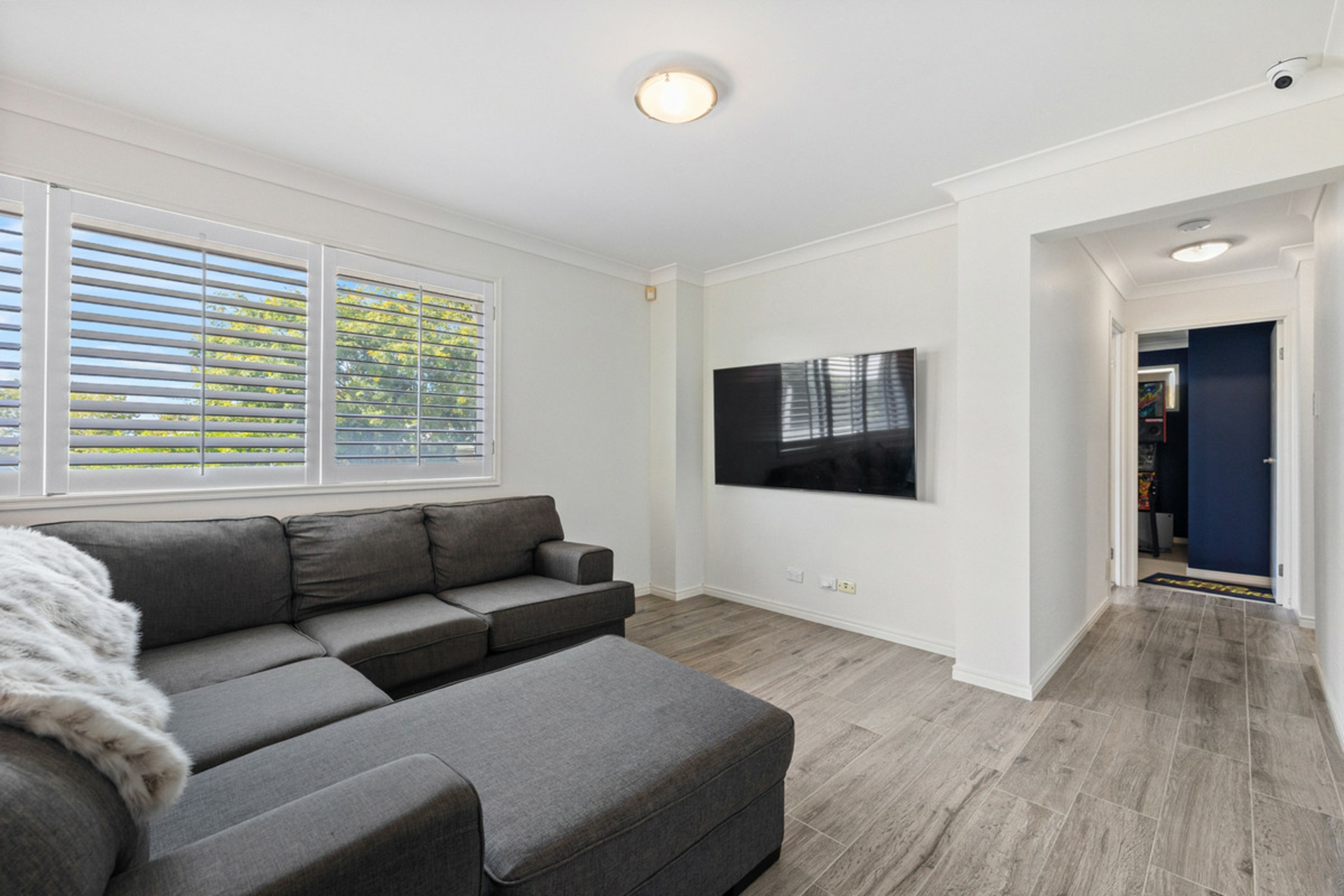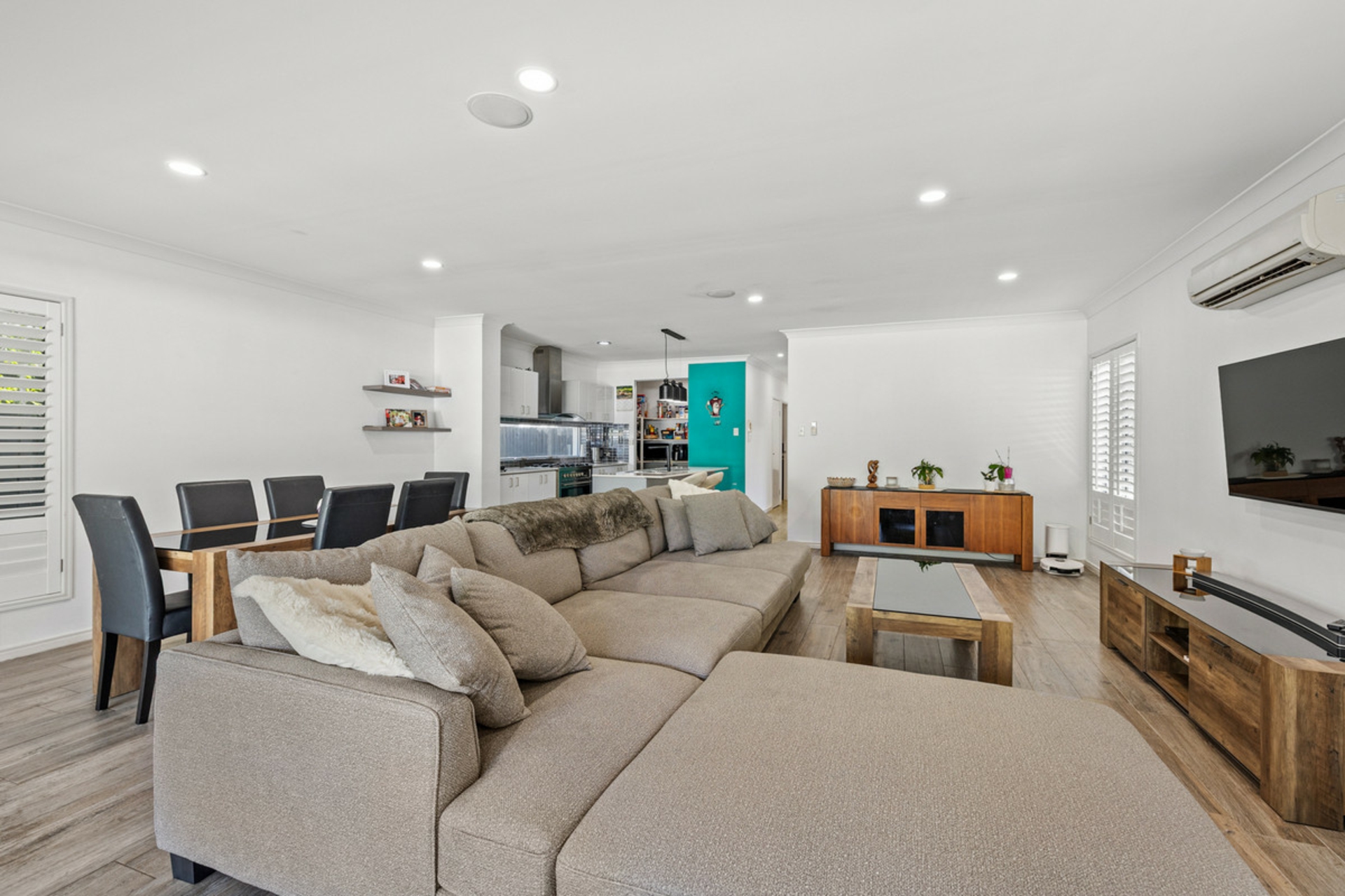 Designed with family living in mind, the home balances open-plan spaces with separate retreat zones across both levels. High ceilings, plantation shutters, and modern lighting create a bright and comfortable atmosphere, while stacker doors open the main living area directly to the outdoor entertaining and pool space.