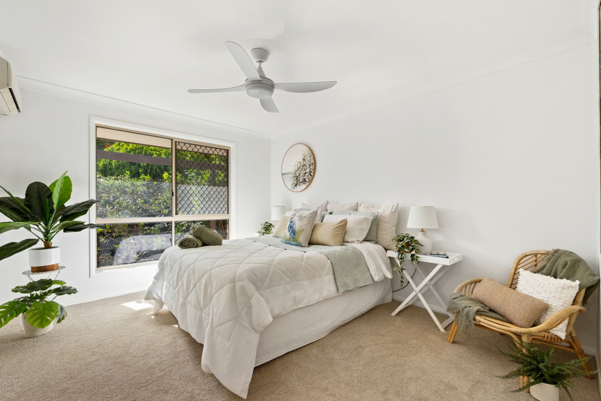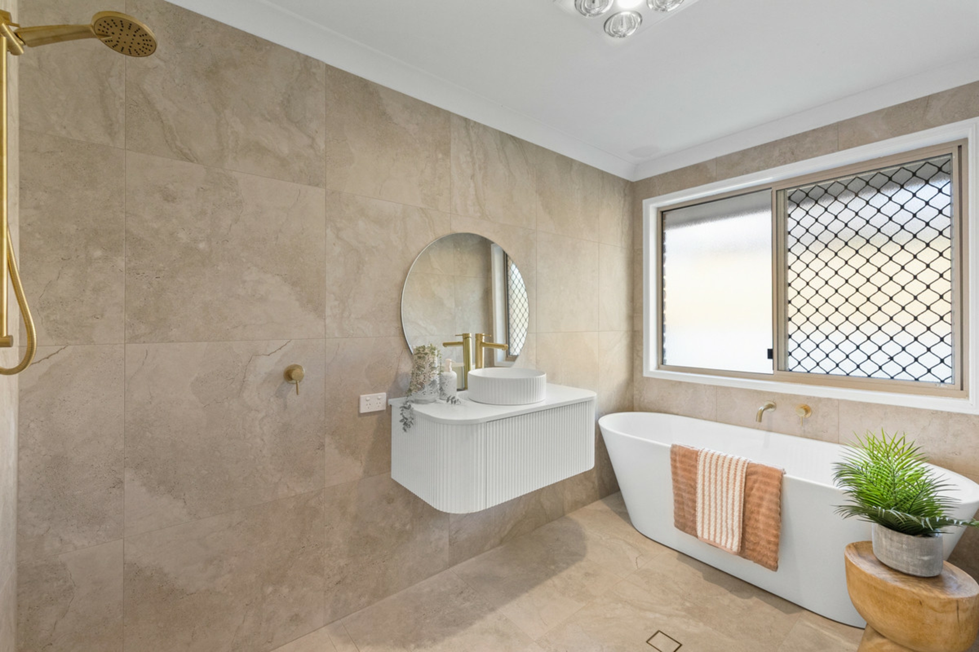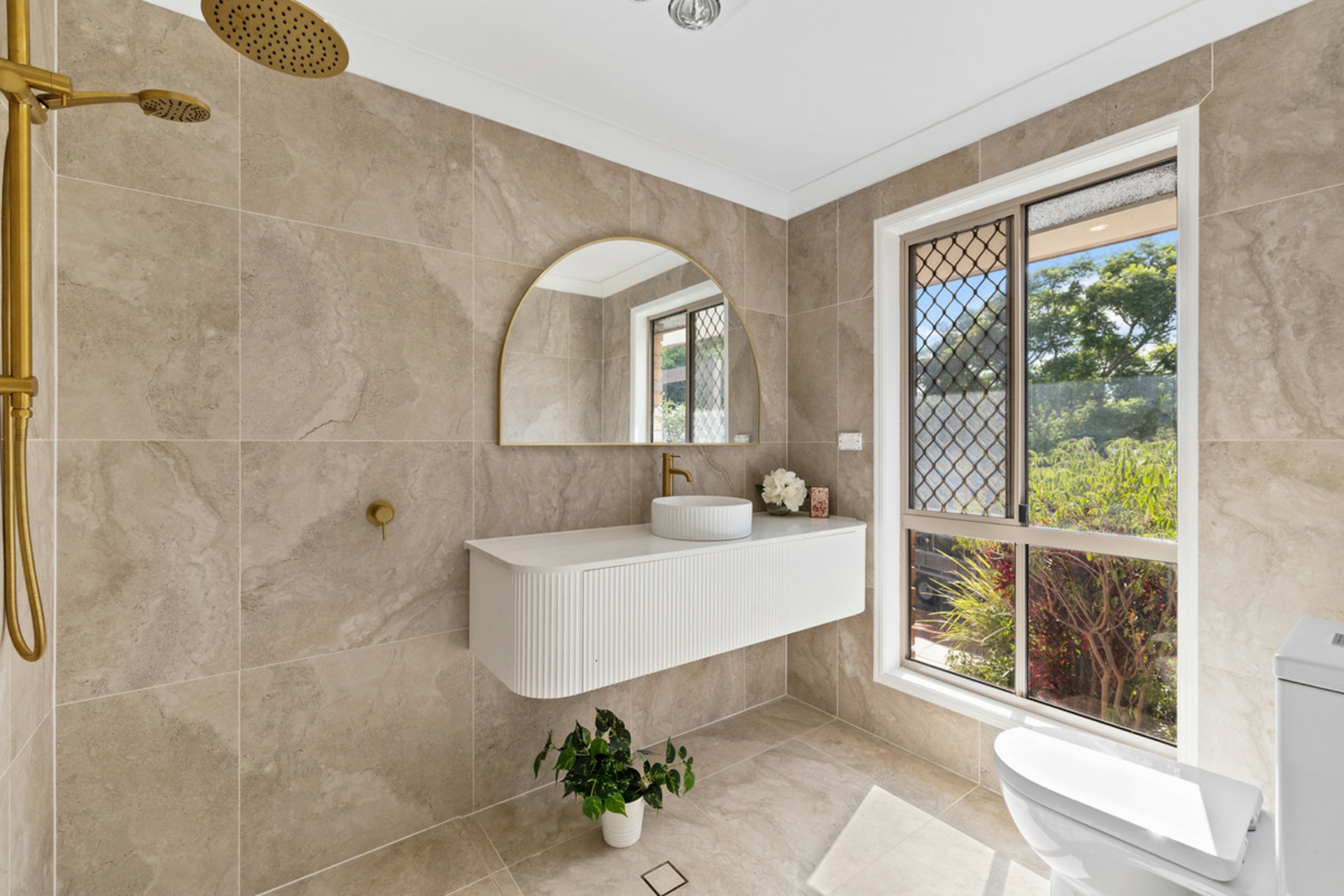 -Master bedroom with walk in wardrobe, fan and exceptional ensuite with large shower, stylish ensuite and brushed brass tapware.