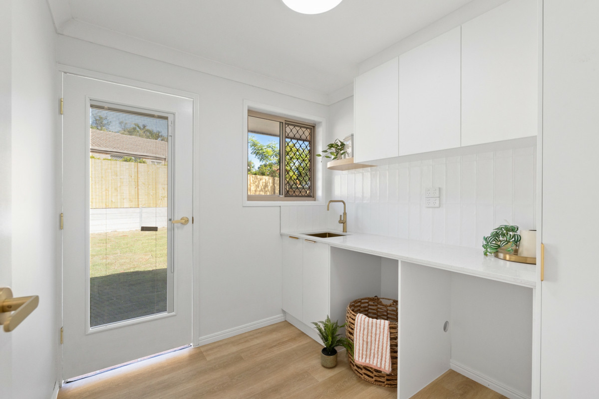 -Huge laundry with stone benchtops, door to backyard and sink.