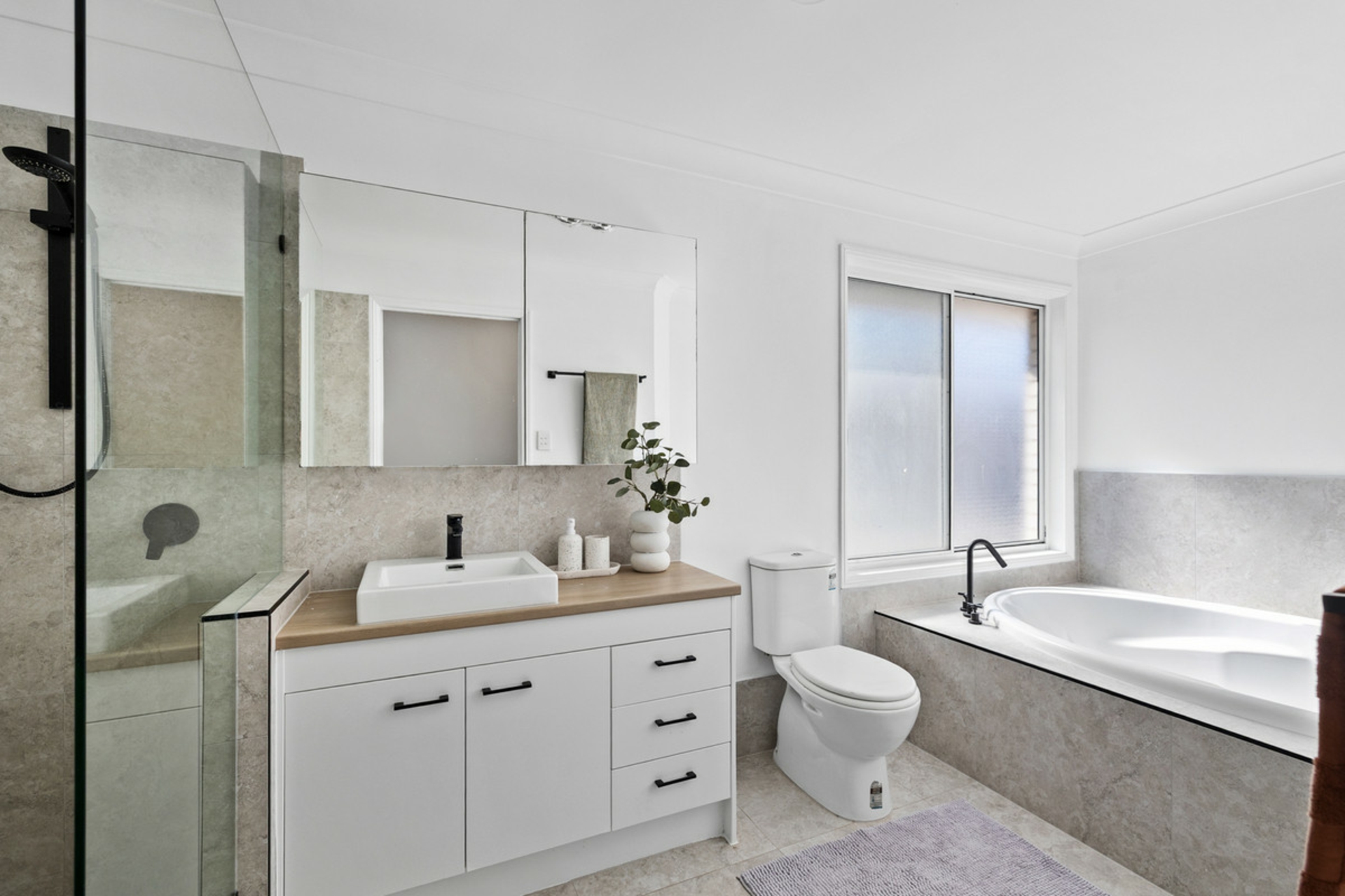 -Immaculate, new family bathroom with feature bath, shower, vanity and toilet