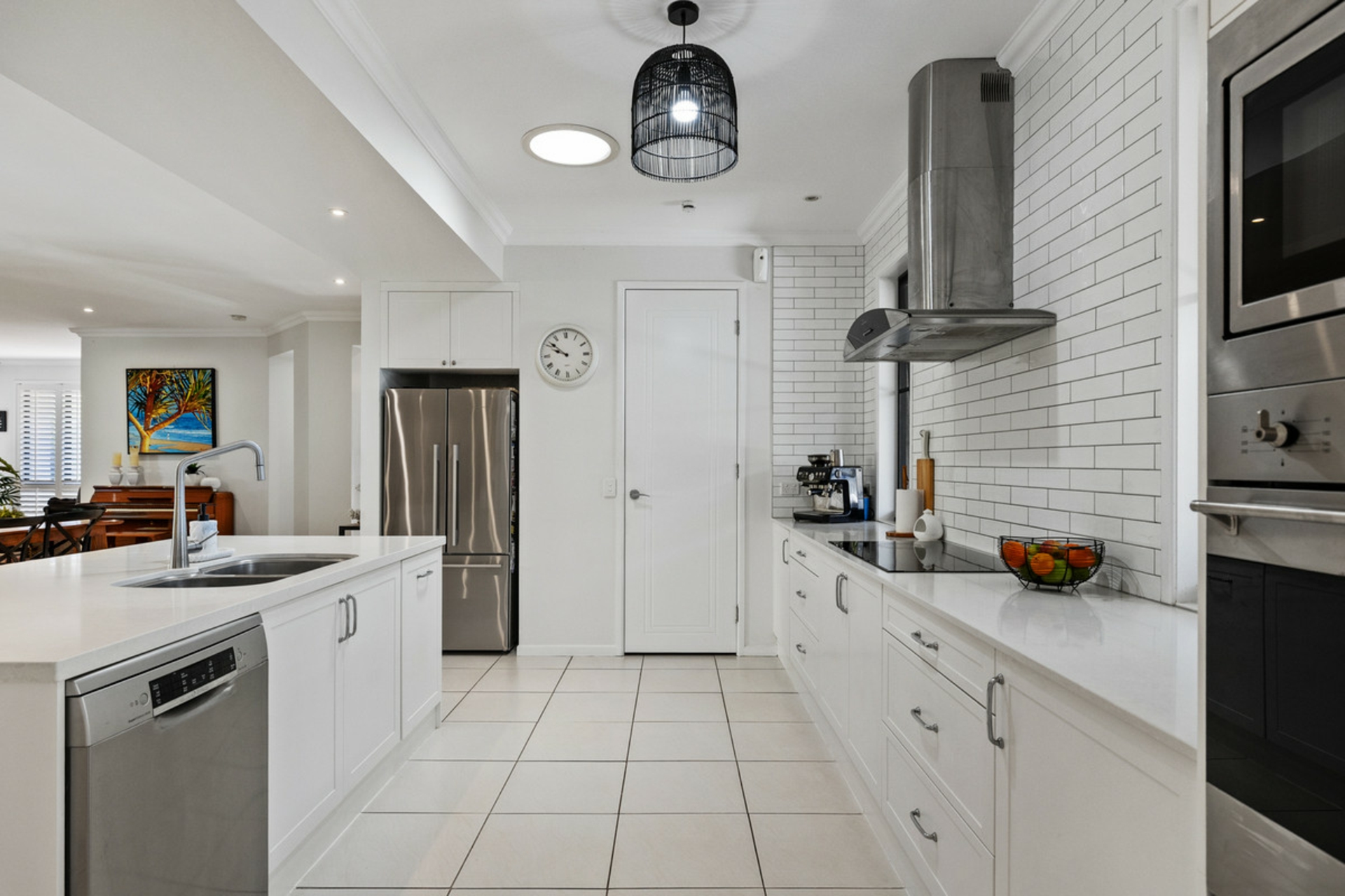 •Renovated, contemporary kitchen with stone benchtops and large central island with breakfast bar. Walk-in pantry, electric oven and cooktop, rangehood, dishwasher, double sink, feature subway tile splashback.
