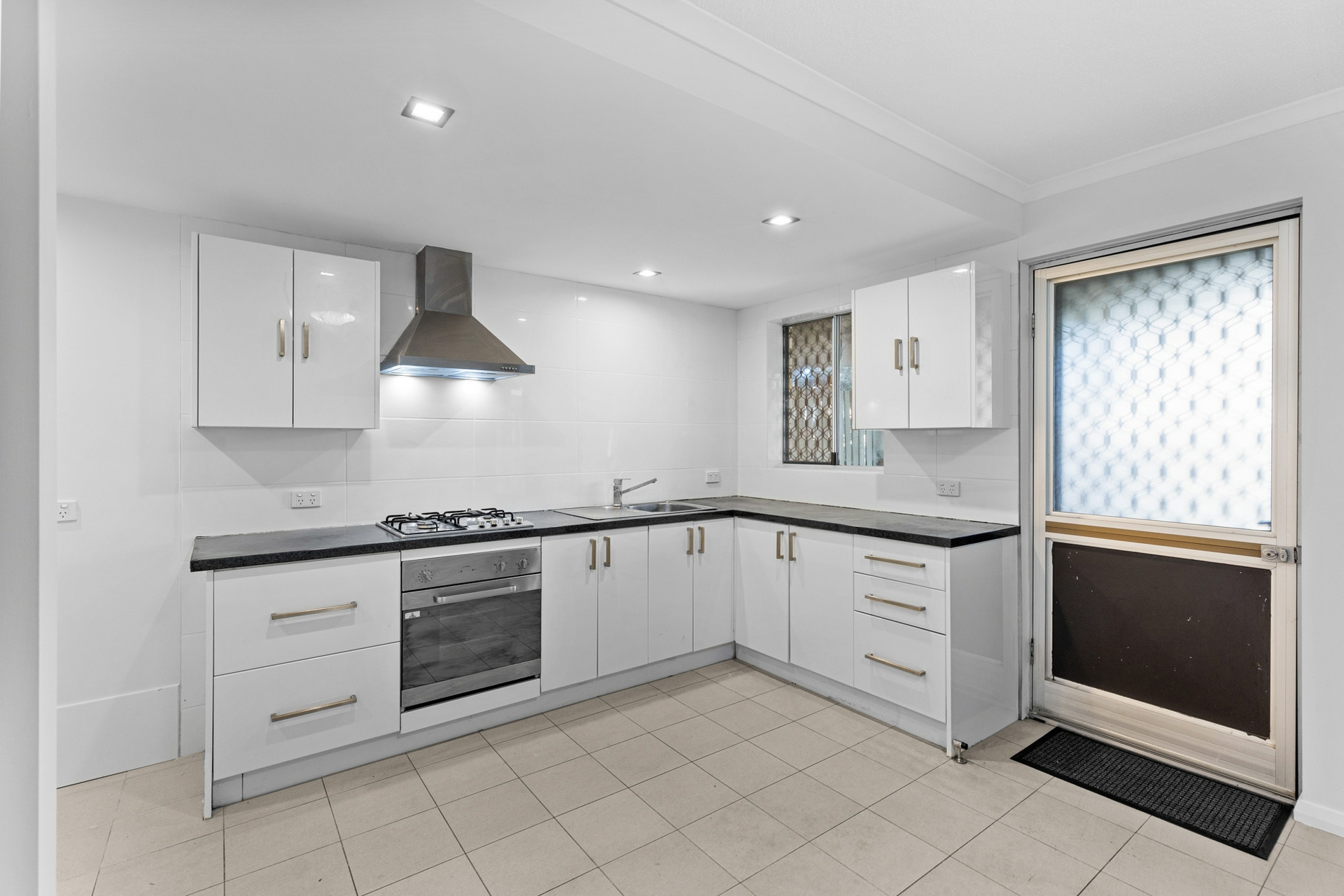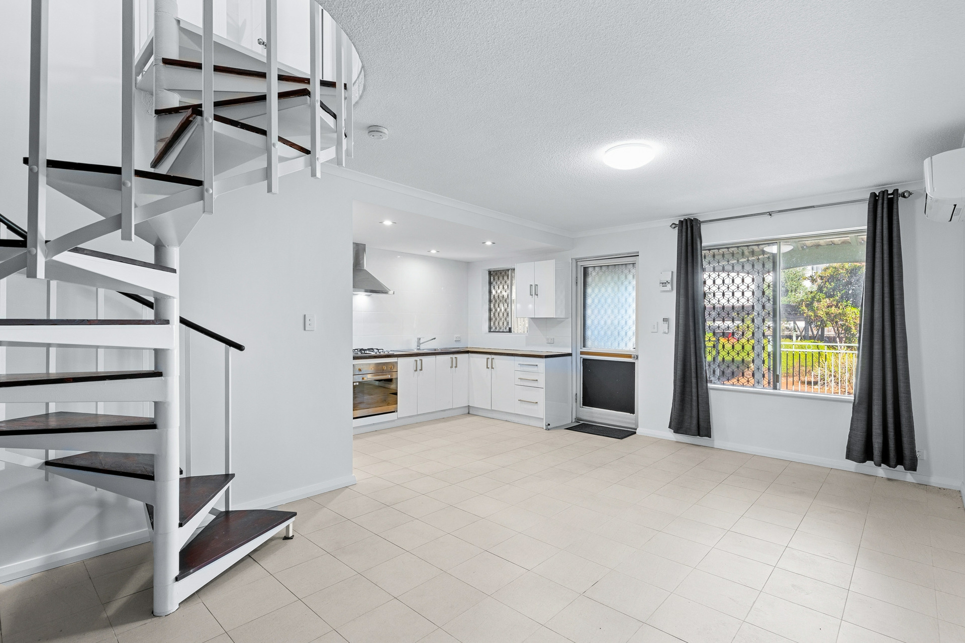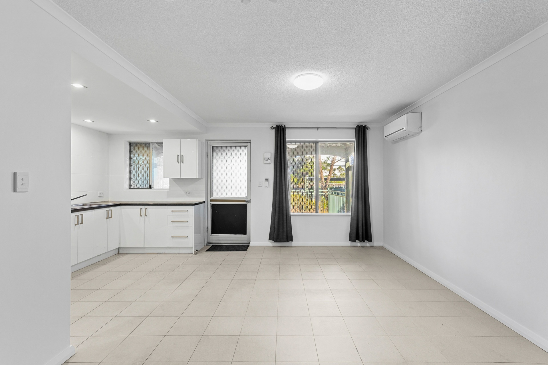 The open-plan living area flows seamlessly into a beautiful kitchen featuring new benchtops, stainless oven & rangehood, creating a home that radiates modern charm.