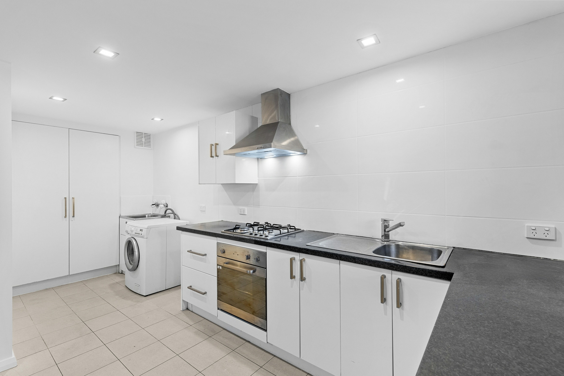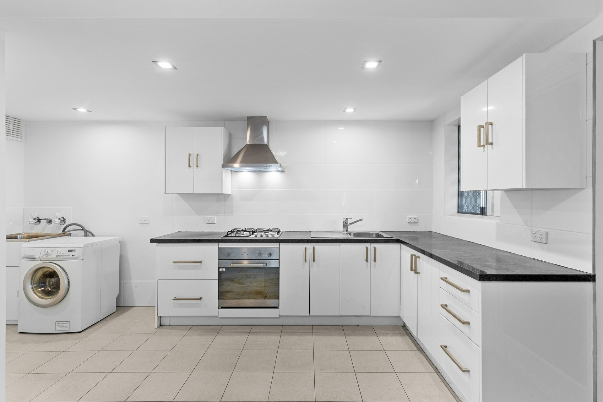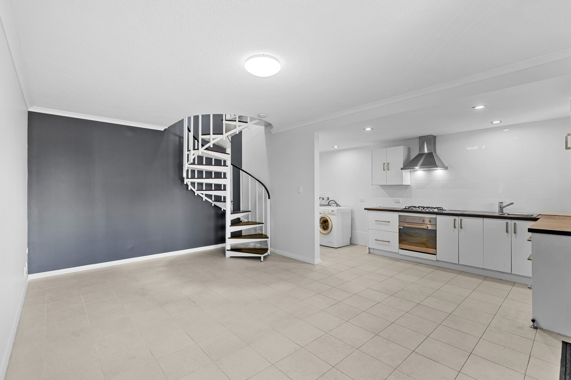 The open-plan living area flows seamlessly into a beautiful kitchen featuring new benchtops, stainless oven & rangehood, creating a home that radiates modern charm.