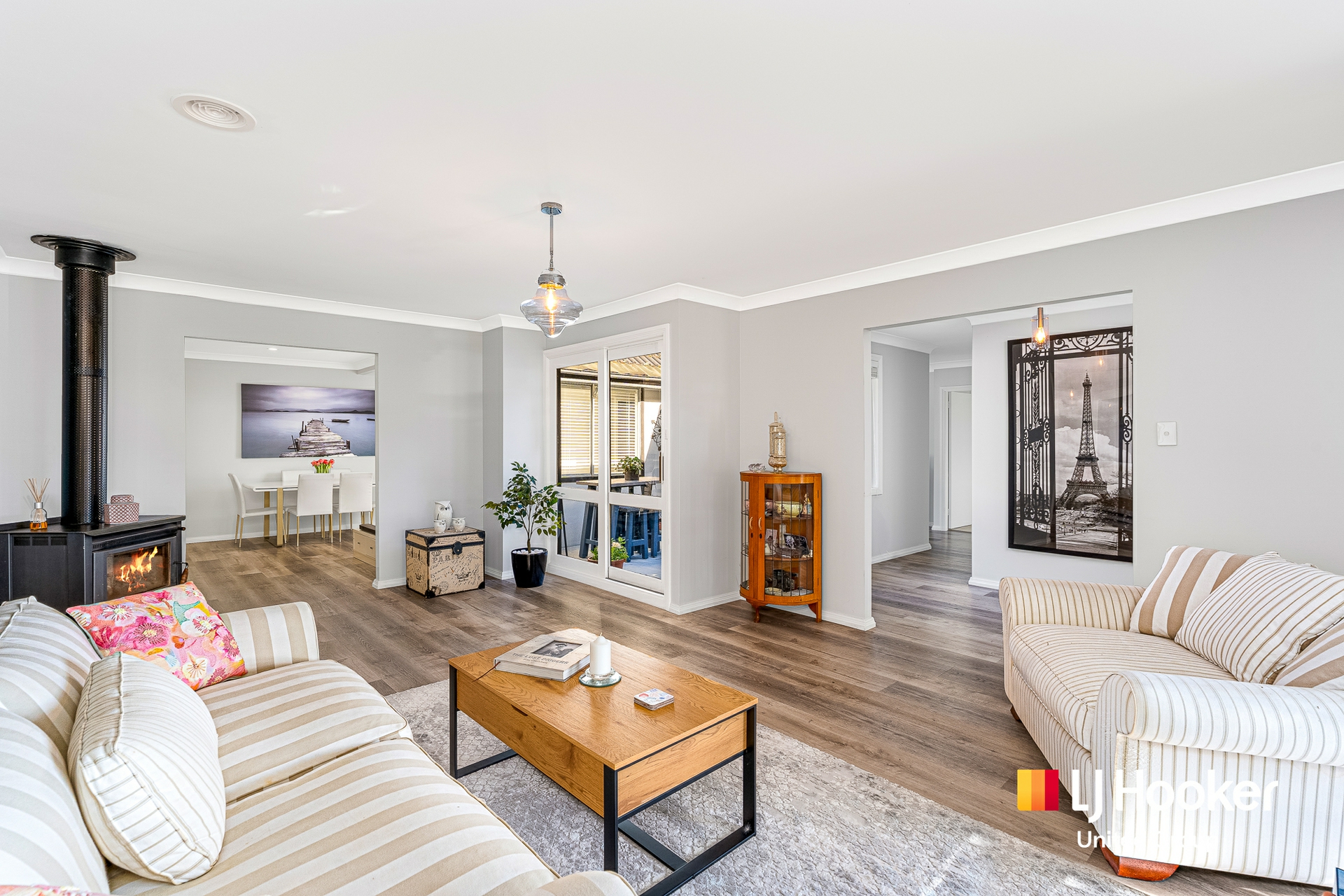 The main living area is both cosy and functional, complete with a combustion fireplace, while additional living and dining spaces flow seamlessly off the modern kitchen, creating a home that caters effortlessly to both everyday living and entertaining. The kitchen is well-appointed with gas cooking, ample storage and a practical layout.