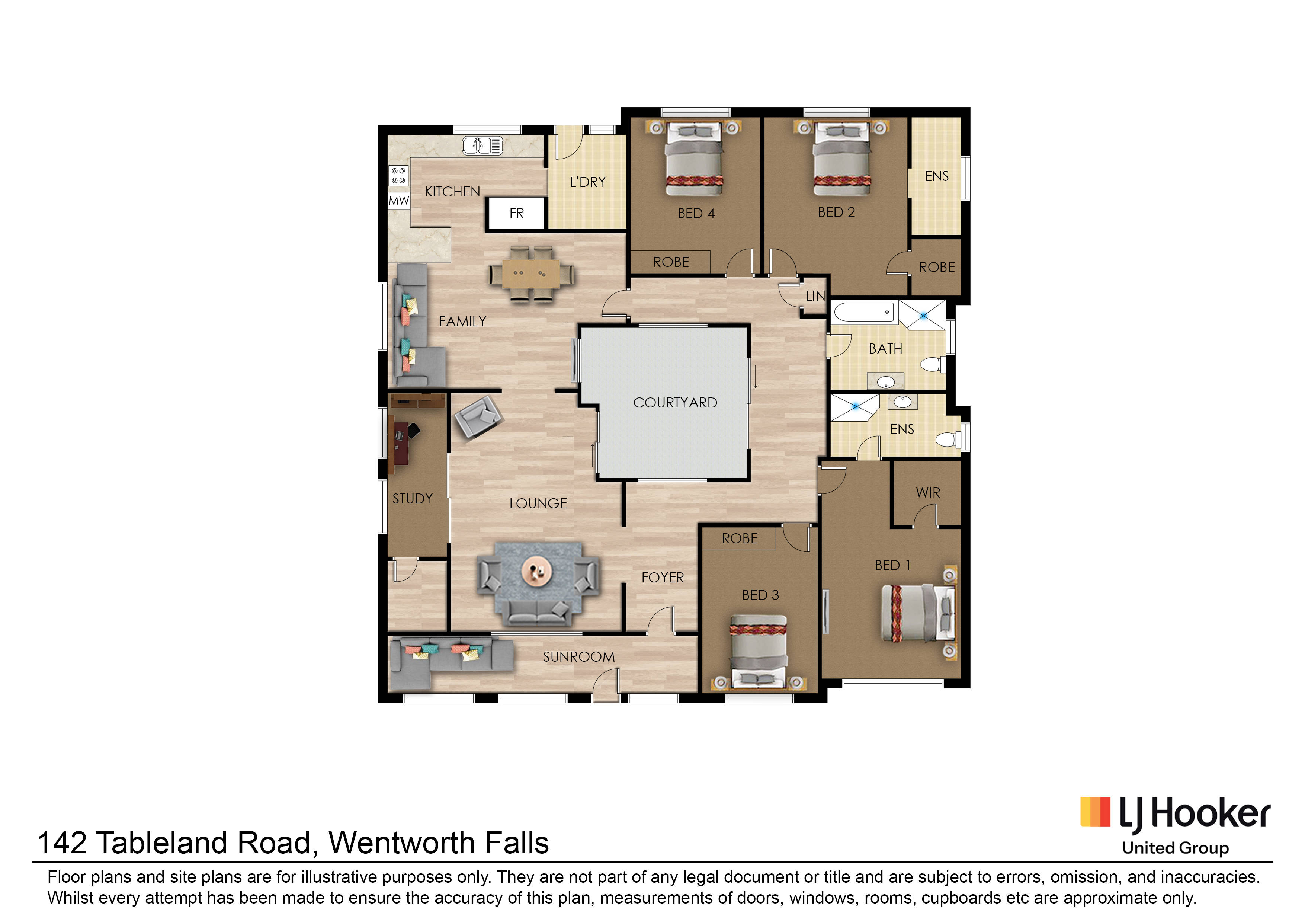 Accommodation is generous, with four well-sized bedrooms including a main suite with walk-in robe and ensuite. A second bedroom also features its own ensuite and walk-in robe, ideal for guests or extended family, while the remaining bedrooms include built-in robes.