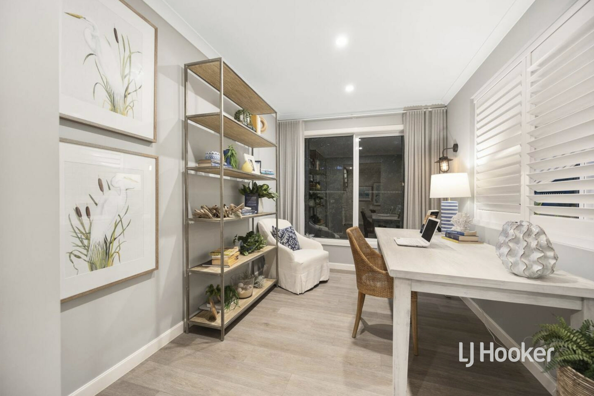 - Dedicated study showcasing refined décor, timber blinds and antique lantern-style wall sconces, adding warmth, character and rustic charm