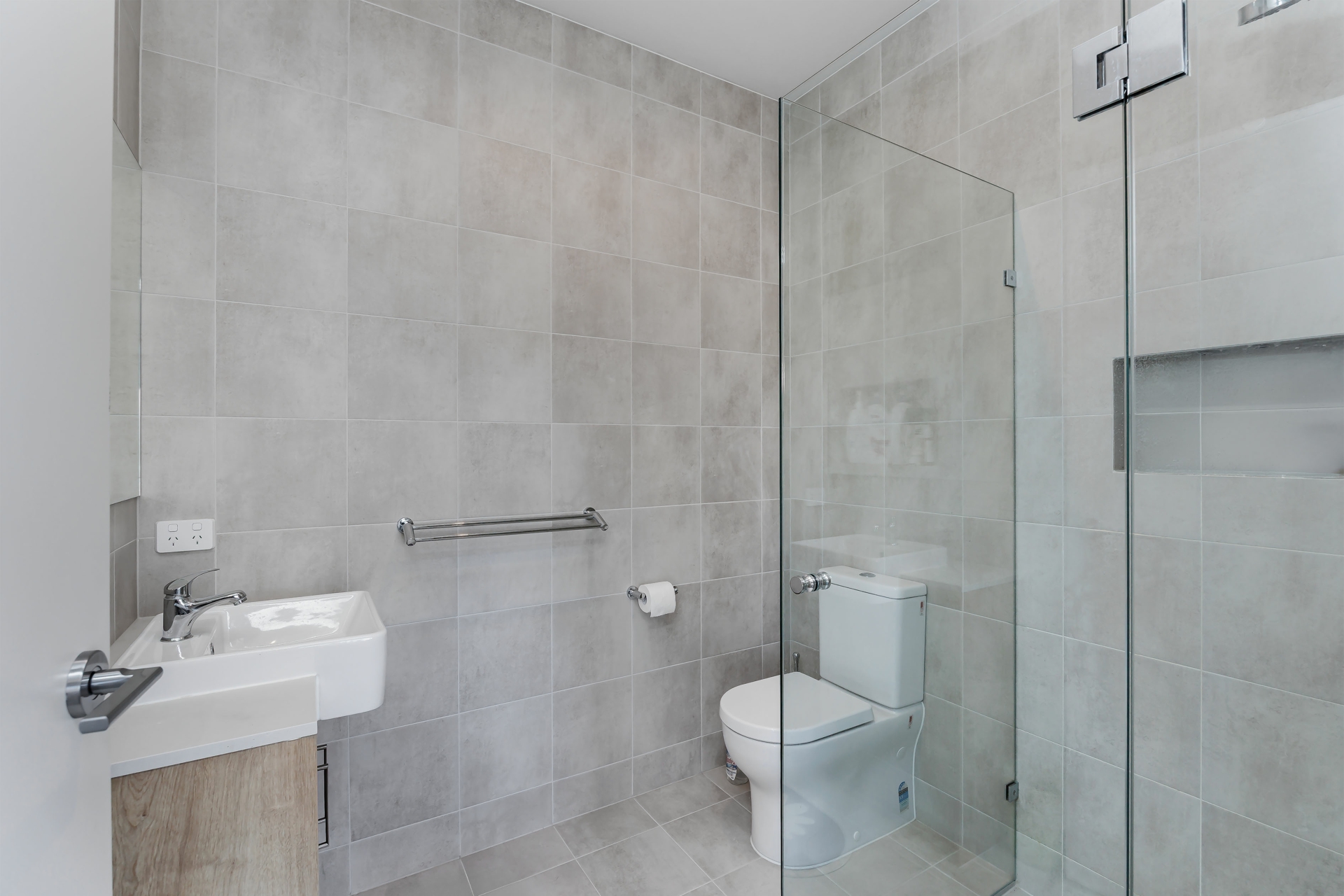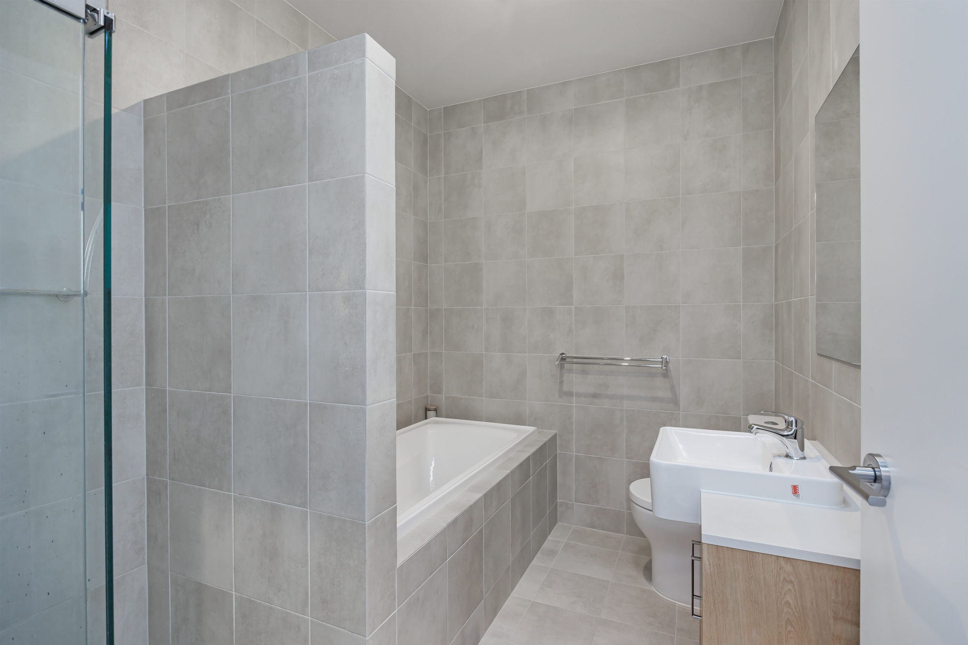 - Modern bathroom with stone top, bath and floor to ceiling tiles