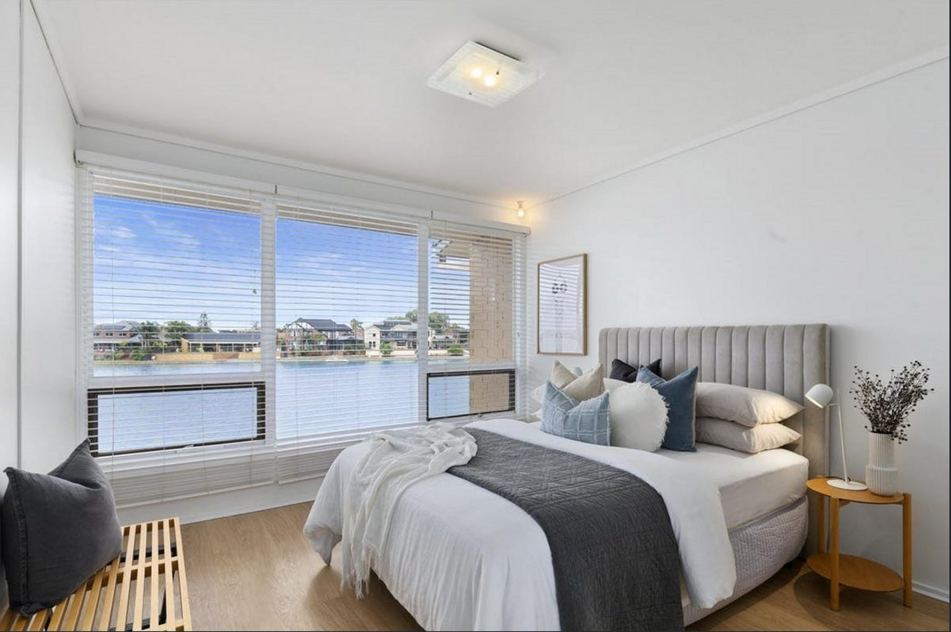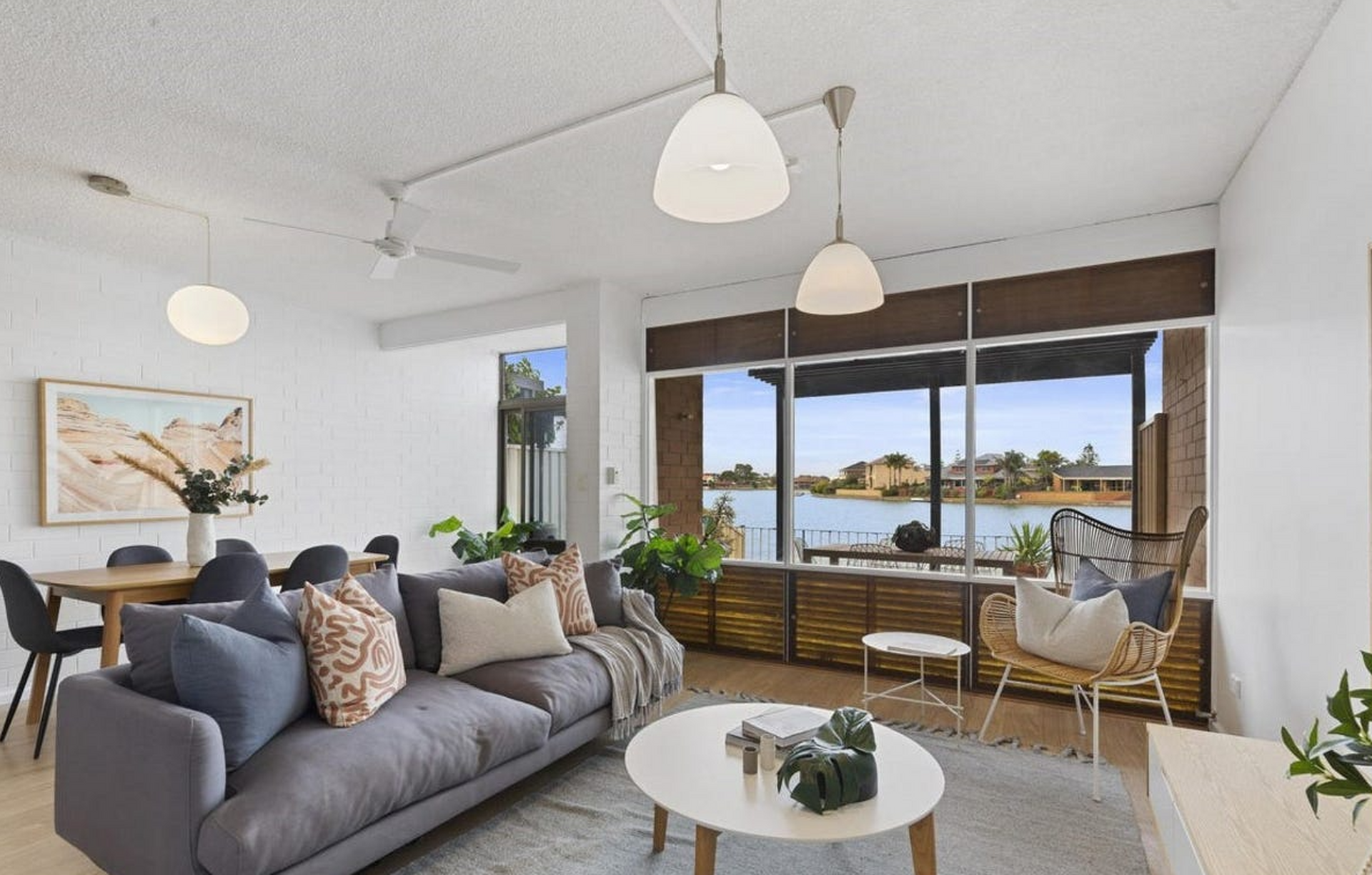 Downstairs, the light-filled open-plan lounge and dining area feature floor-to-ceiling windows that capture uninterrupted water views, creating an inviting space to relax or entertain. The updated kitchen offers timber benchtops, a gas cooktop, dishwasher, and plenty of storage, while sliding doors open to a paved outdoor entertaining area right by the lake's edge. A guest powder room and laundry complete the lower level.