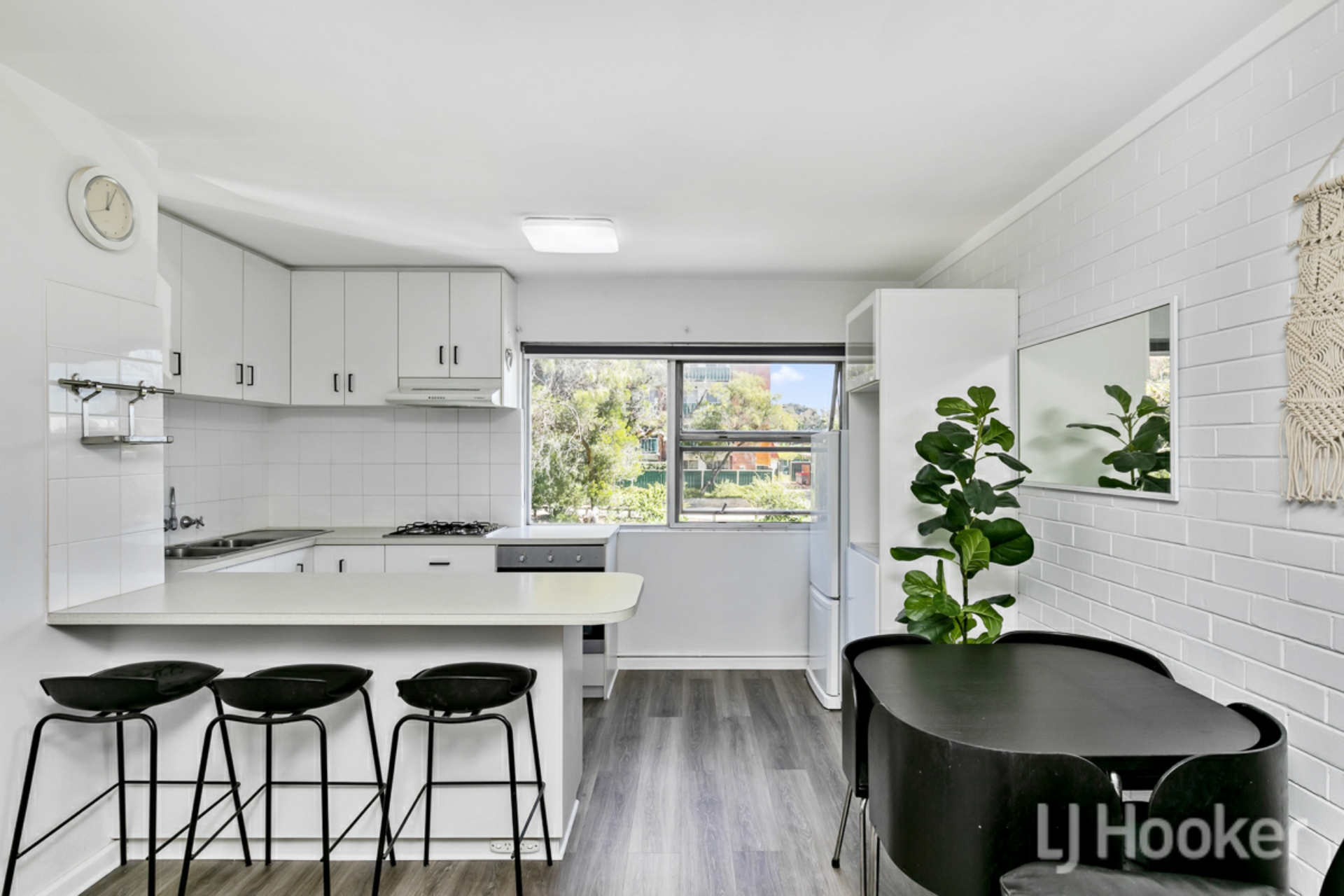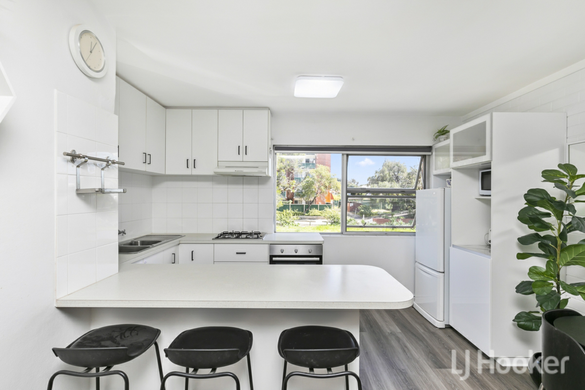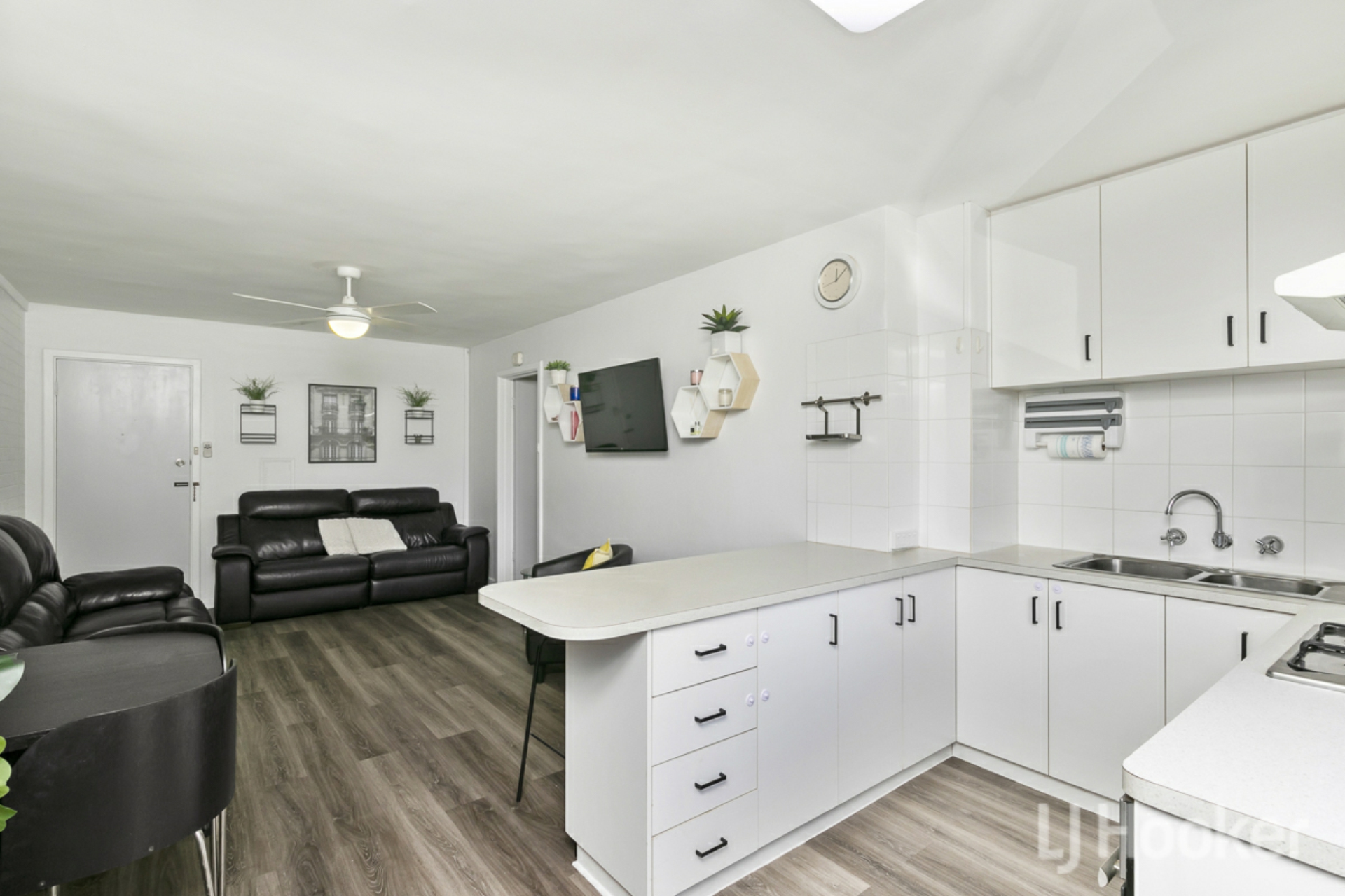 Kitchen with breakfast bar, benchtop, cupboards, overheads and draws.