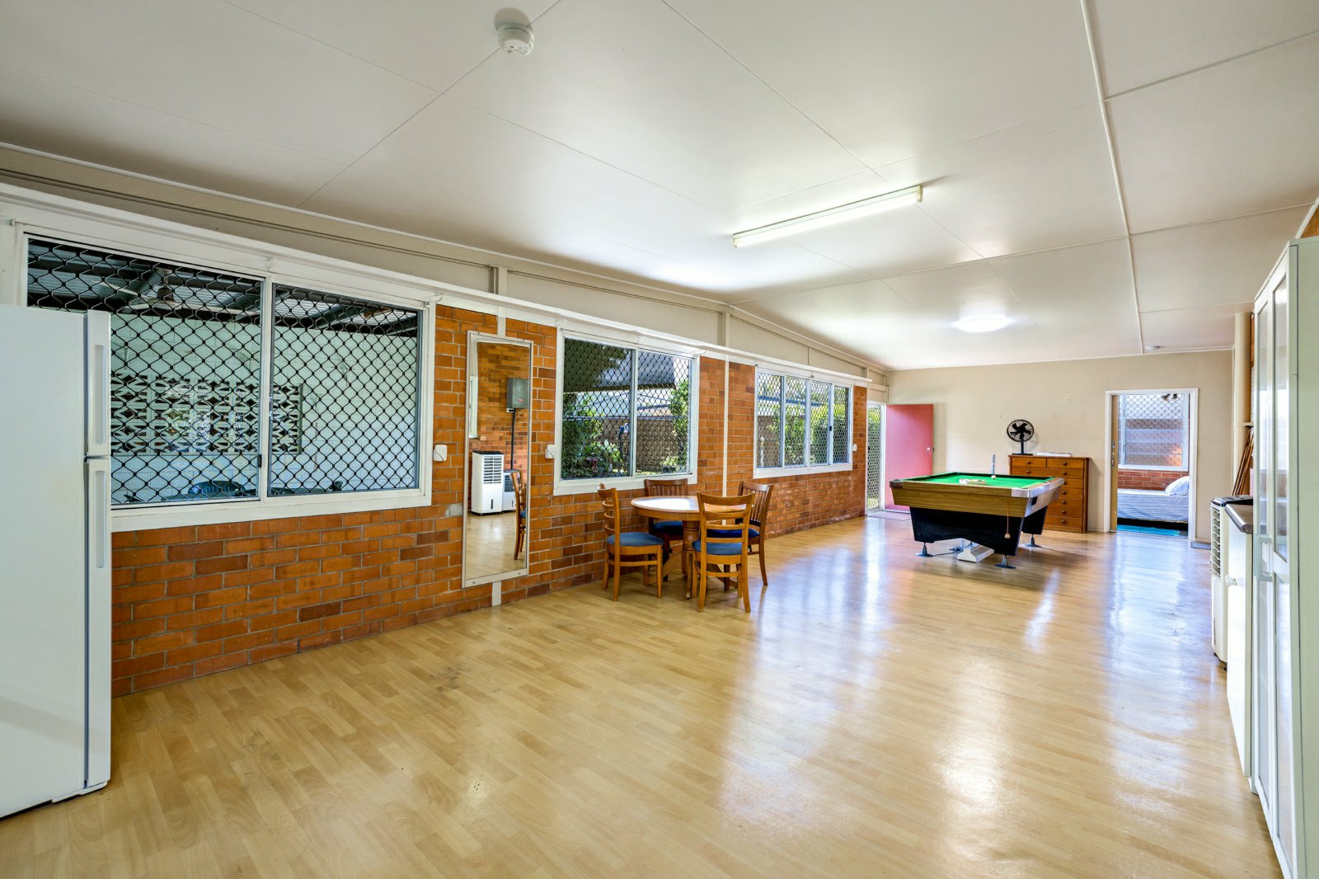 Inside natural light filters throughout, the kitchen is central to the open plan living and dining area, retaining its original retro style and functionality. To the rear of the home, a large rumpus room currently used as a games room provides an additional internal living area. Further external living space is provided by the rear covered patio that connects to the large shed.