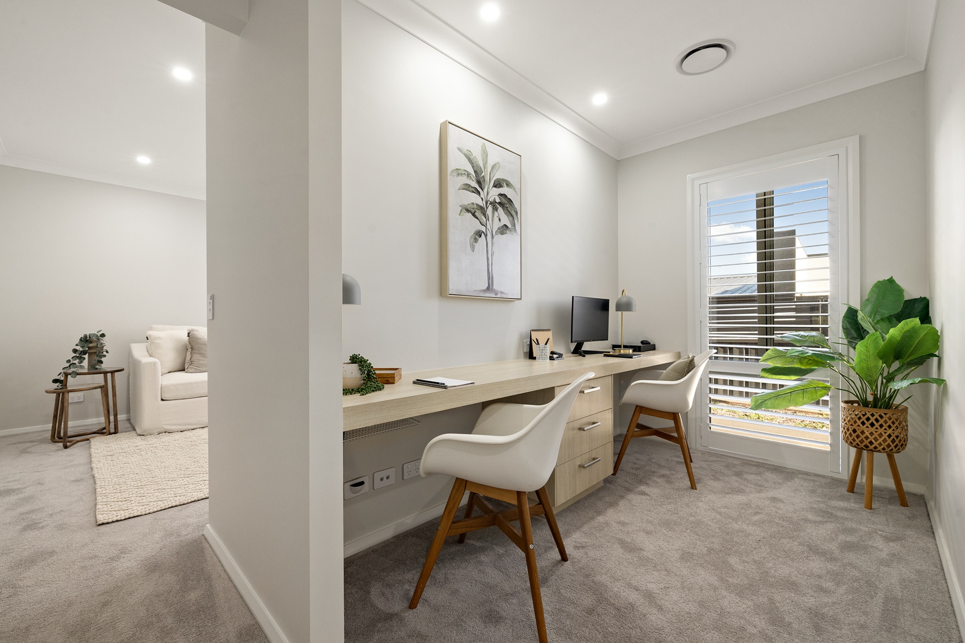 A dedicated study with built in desk caters perfectly to working from home, while a separate laundry with external access adds everyday convenience. Hybrid timber floors and custom joinery flow throughout, creating warmth and cohesion while offering practical durability for busy households.