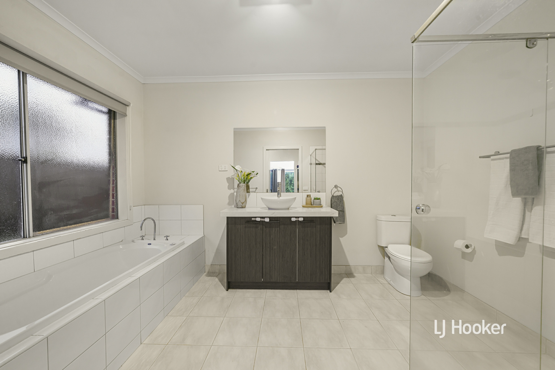 - Four carpeted bedrooms, each with a signature feature wall, include the elegant main boasting full ensuite with bathtub and immense walk-in robe, three remaining bedrooms offer built-in robes and are serviced by the pristine main bathroom with relaxing bathtub and separate toilet for added convenience.