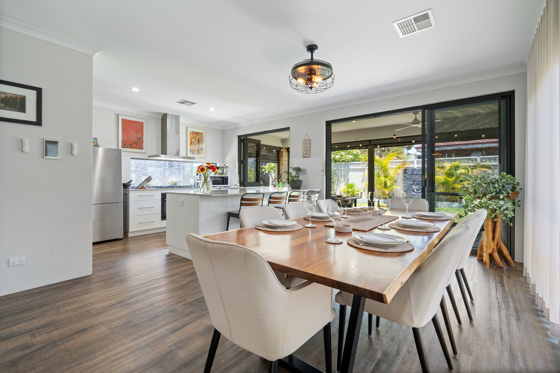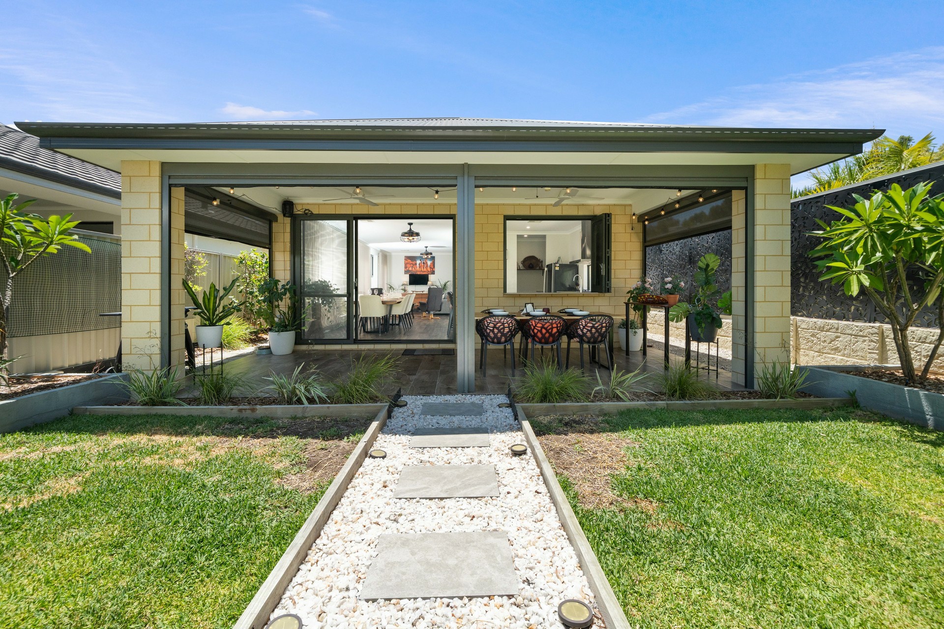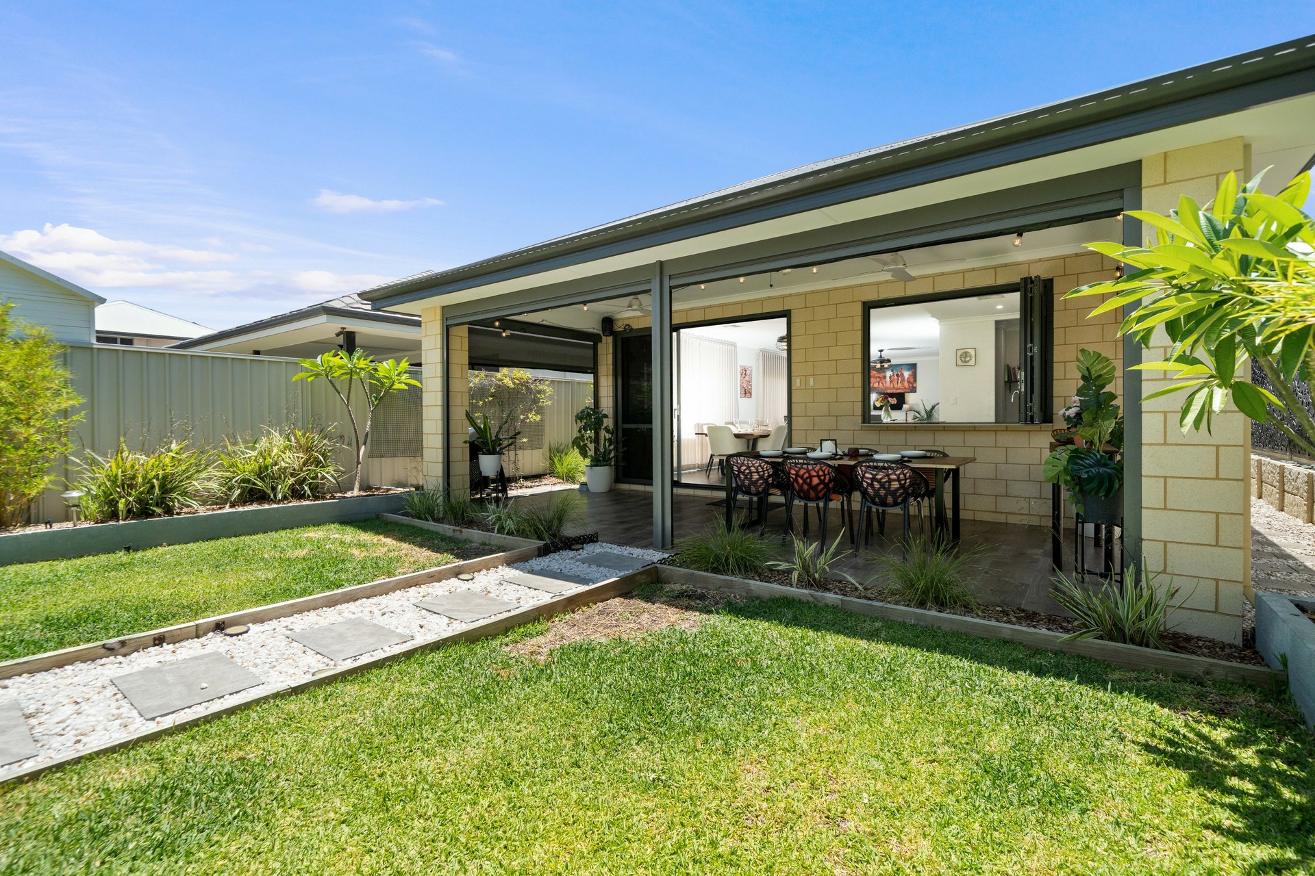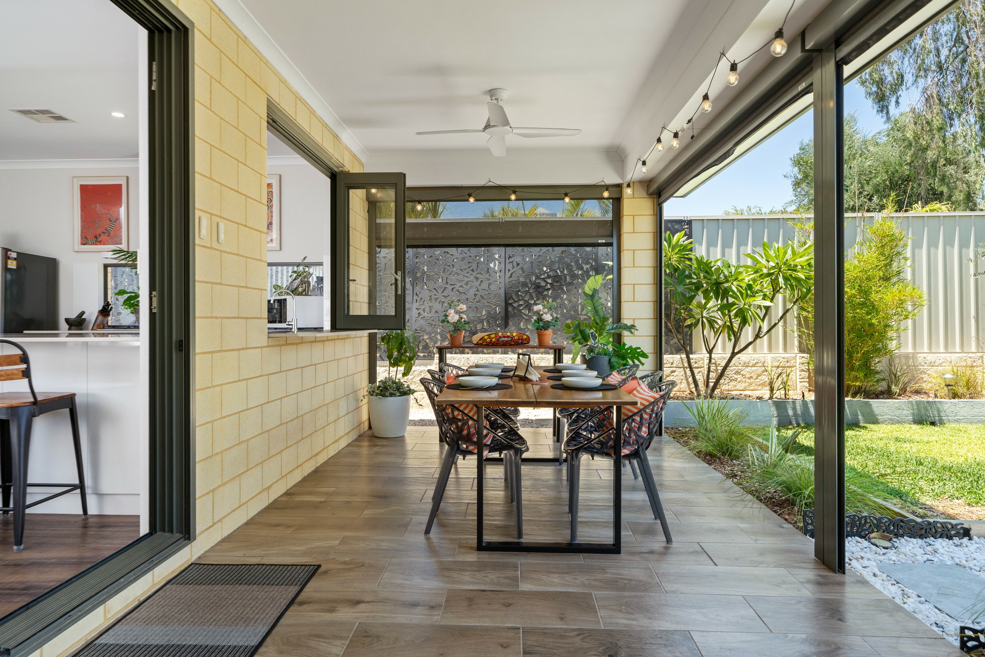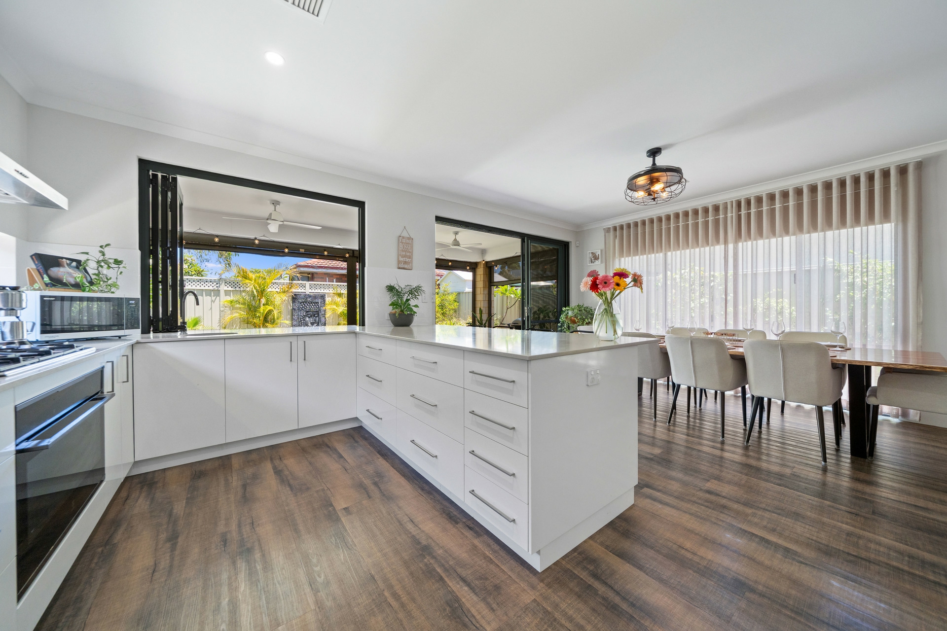 •Seamless Indoor-Outdoor Flow: Bifold windows in the kitchen and sliding doors in the dining area open completely to the alfresco, creating a perfect integration for entertaining.