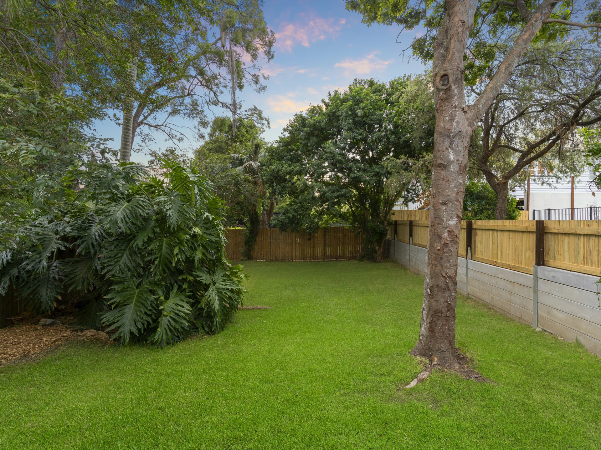 Low maintenance, fully fenced yard with mature greenery