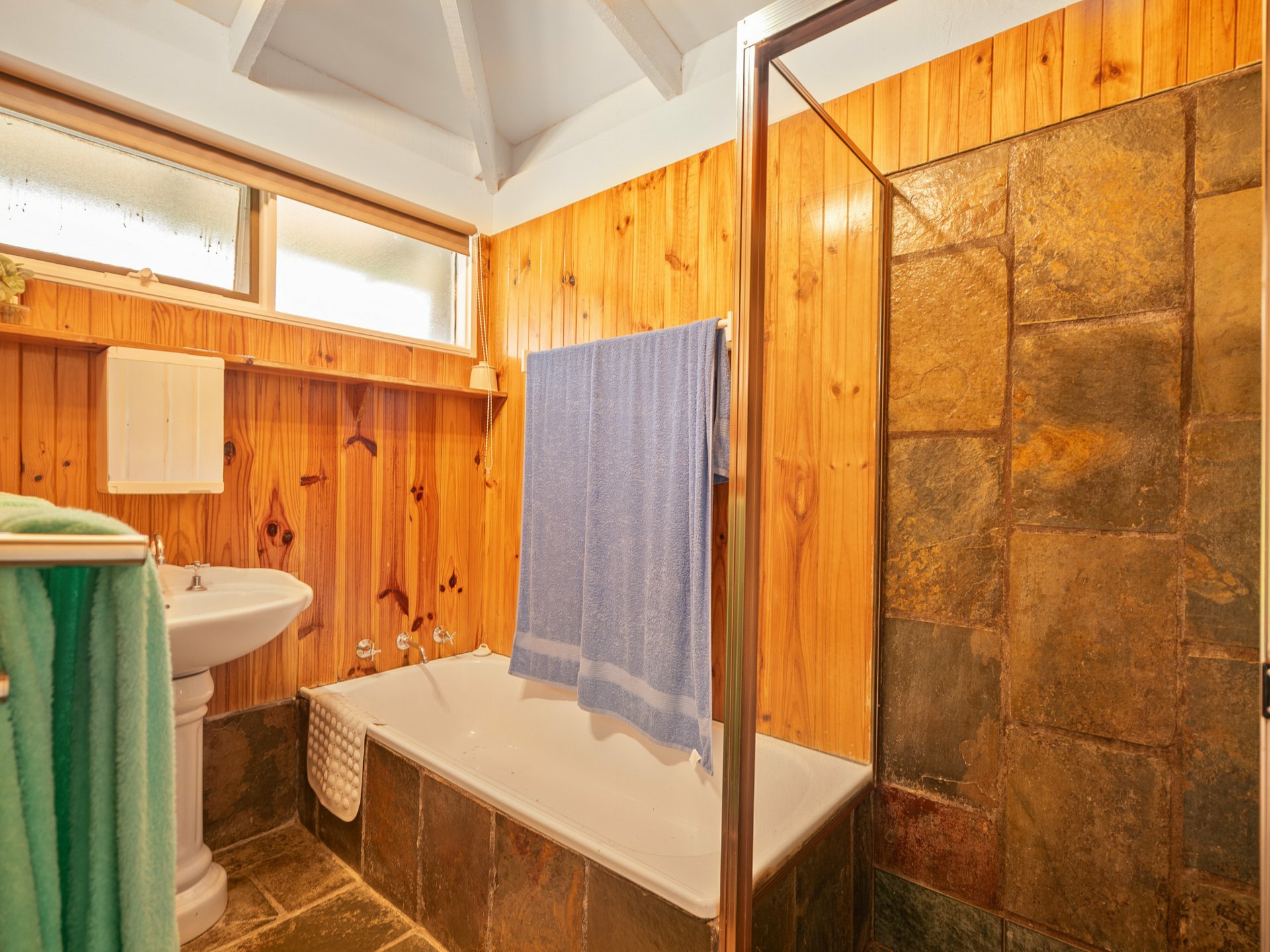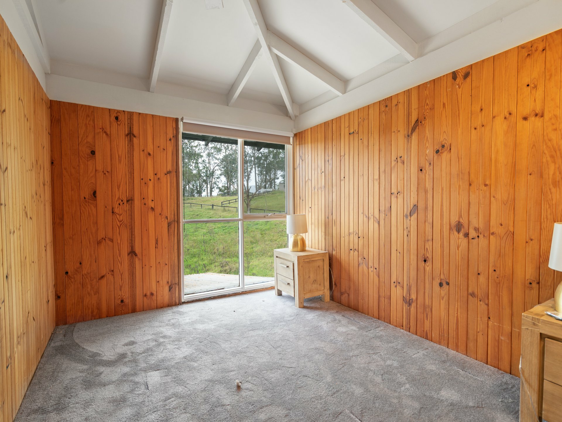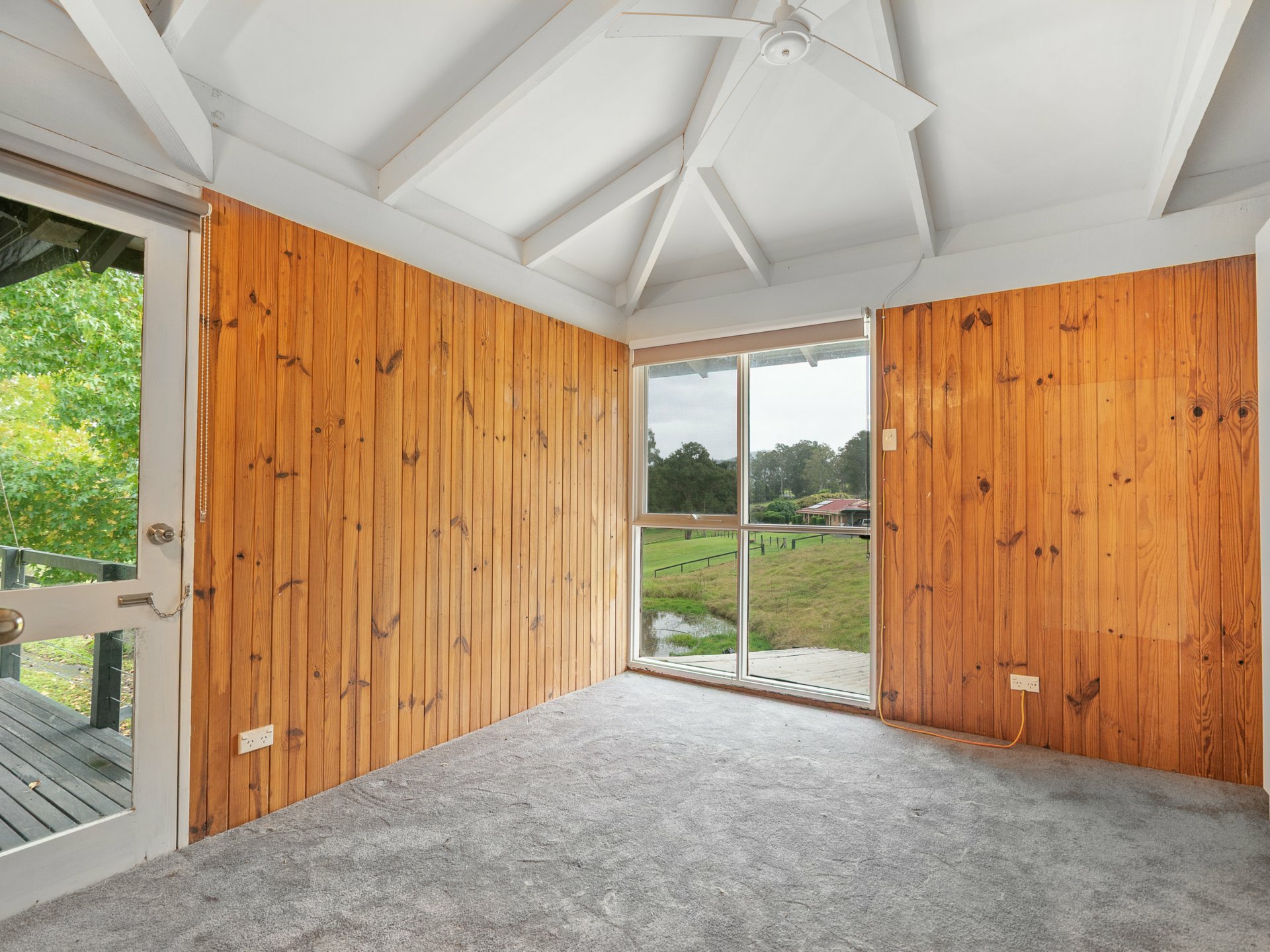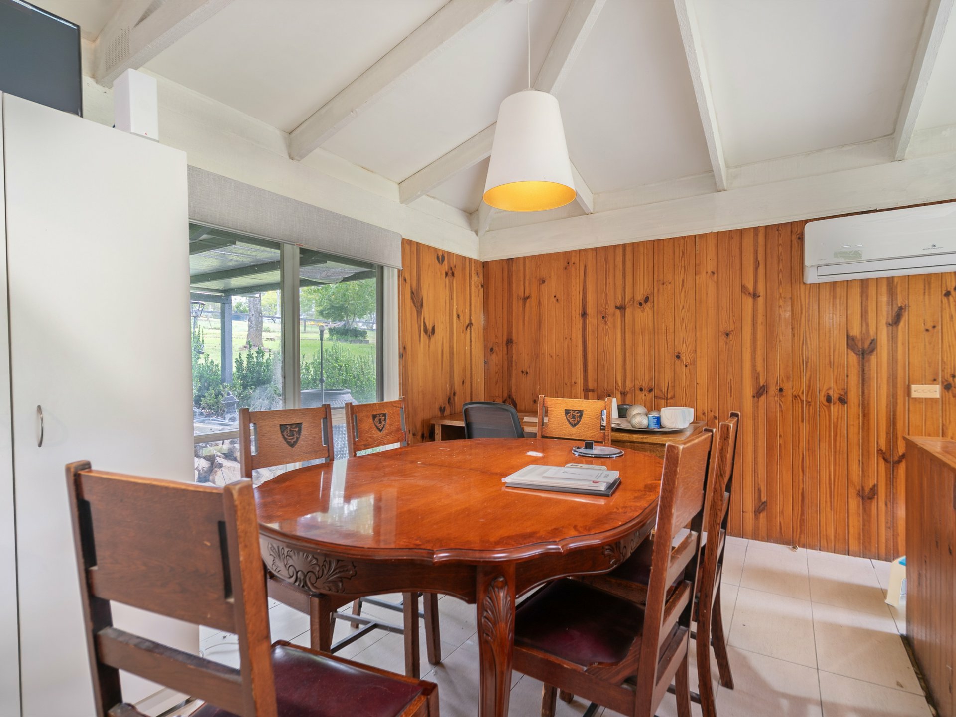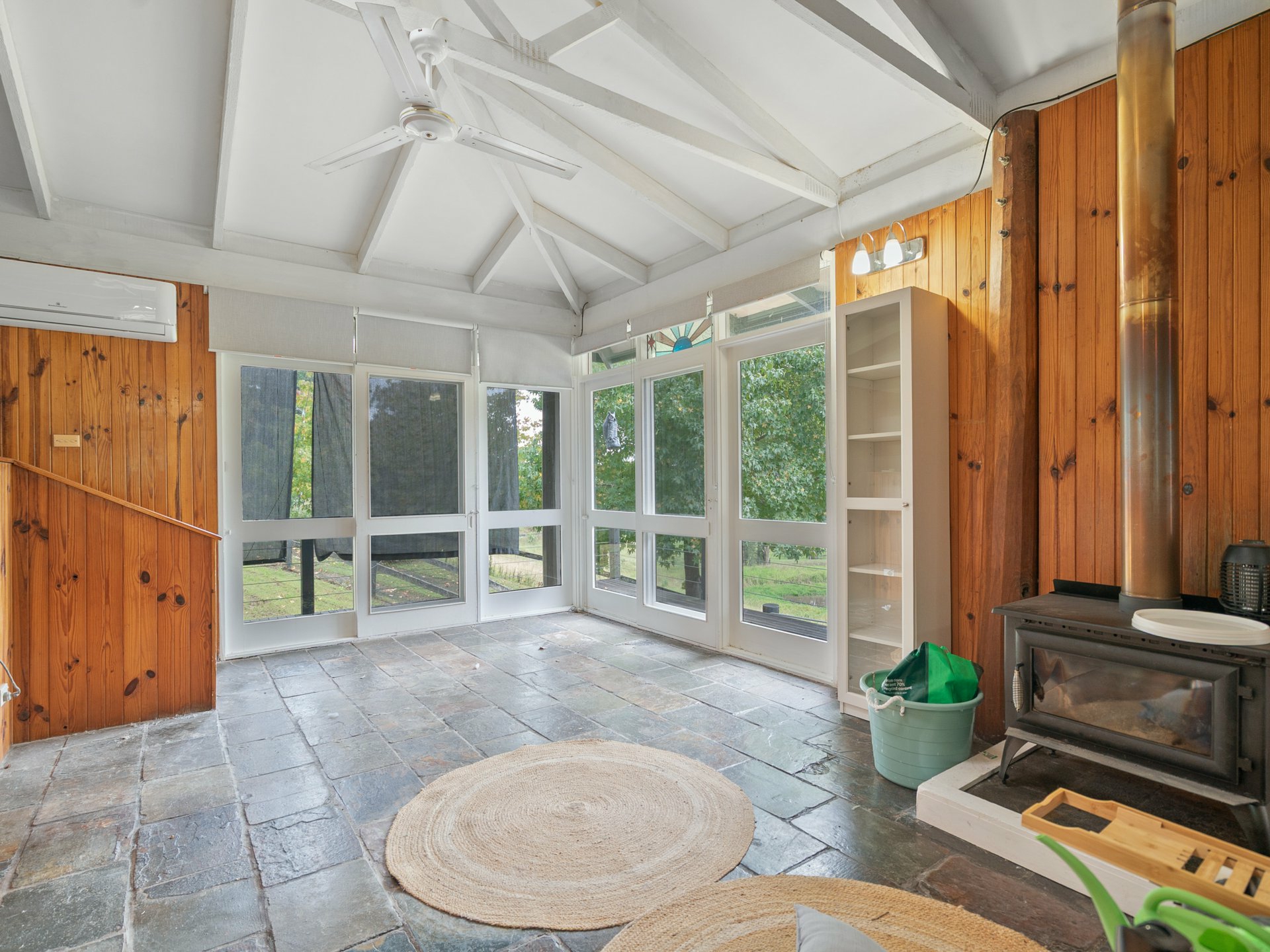 Step inside to discover a warm and inviting home featuring three bedrooms, including a self-contained suite with its own ensuite—ideal for guests, extended family, or as a private retreat. The elevated kitchen and dining area overlooks the spacious living zone, where exposed timber trusses, skylights, and durable slate flooring add a sense of rustic charm and natural light. Comfort is assured year-round with a cosy fireplace and reverse-cycle air conditioning.