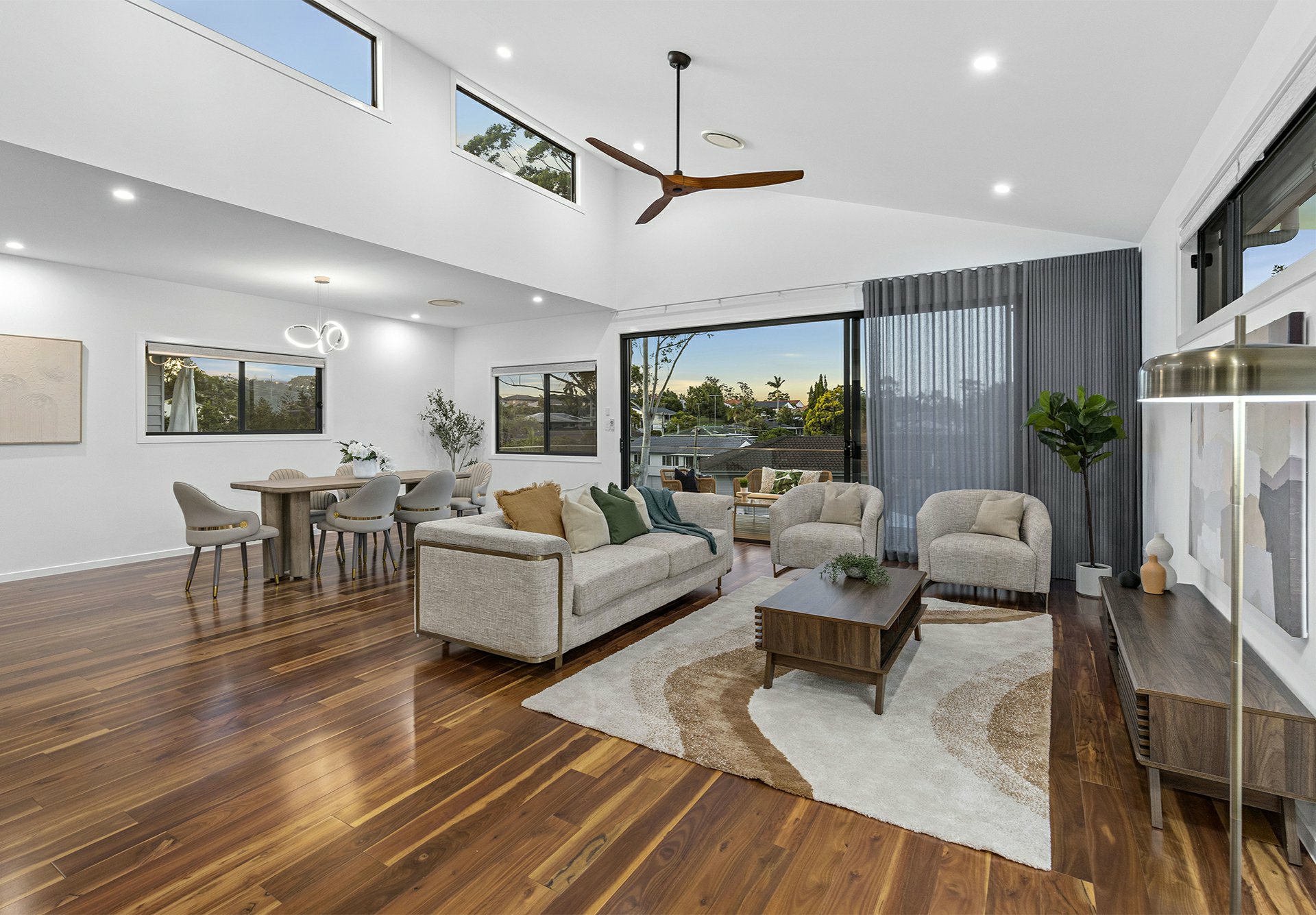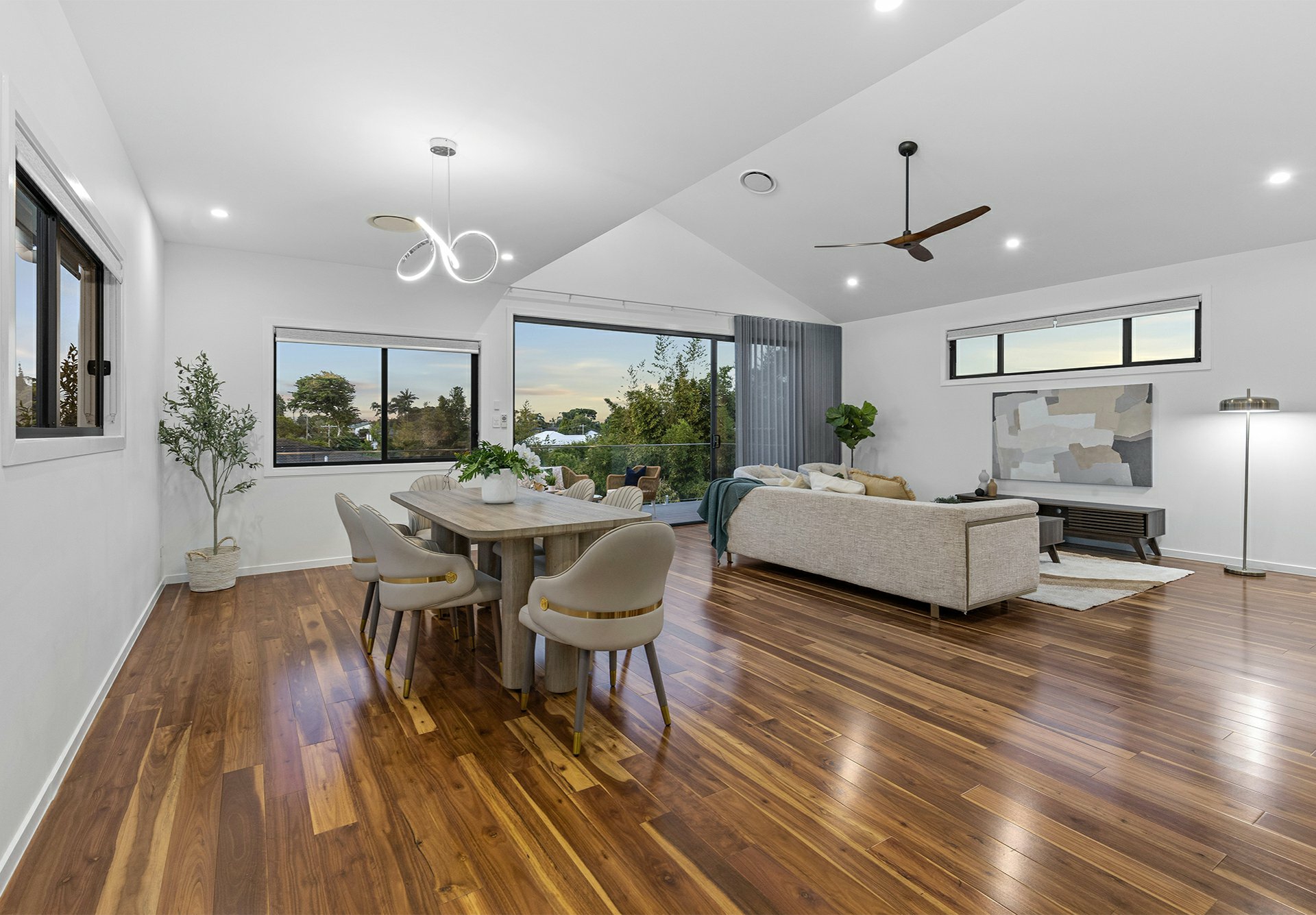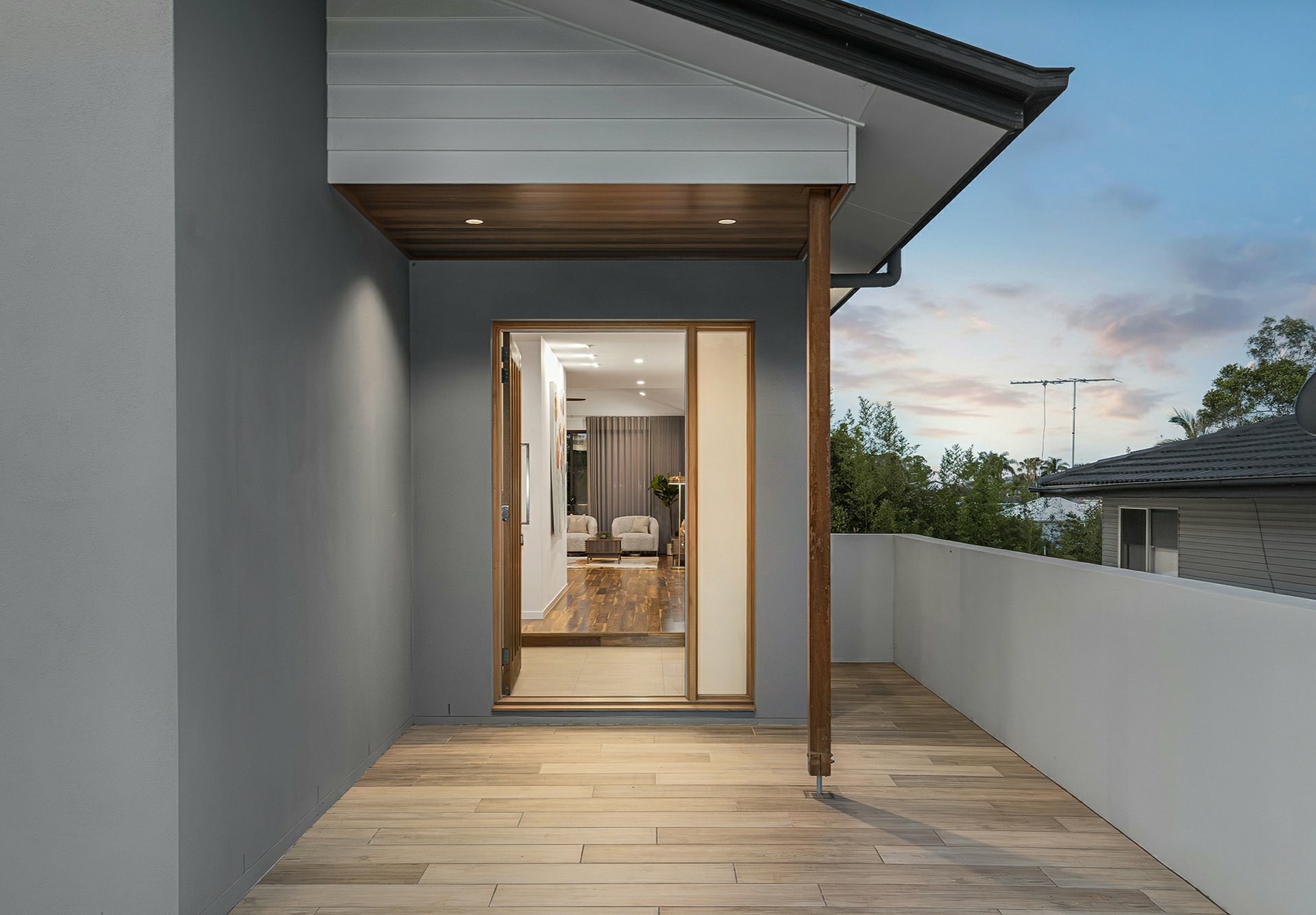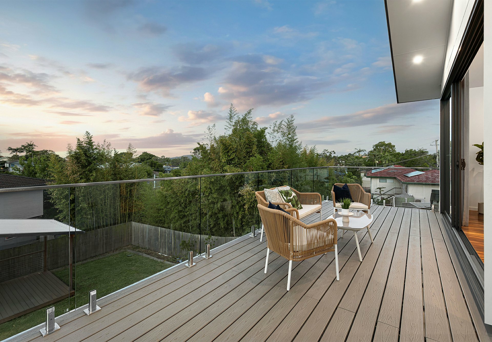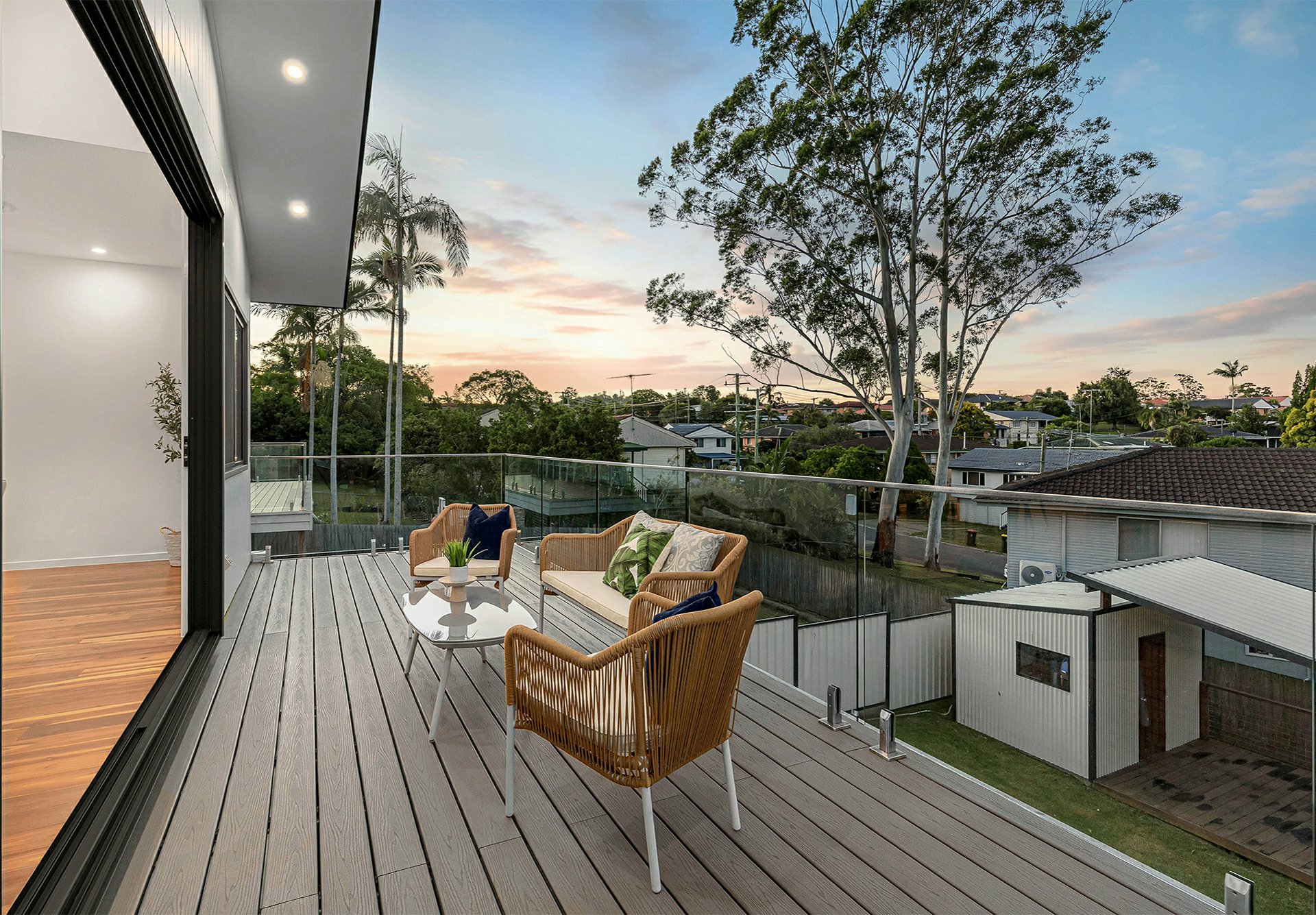 - Raked ceiling over the lounge + sliders onto a timber-decked balcony with district views