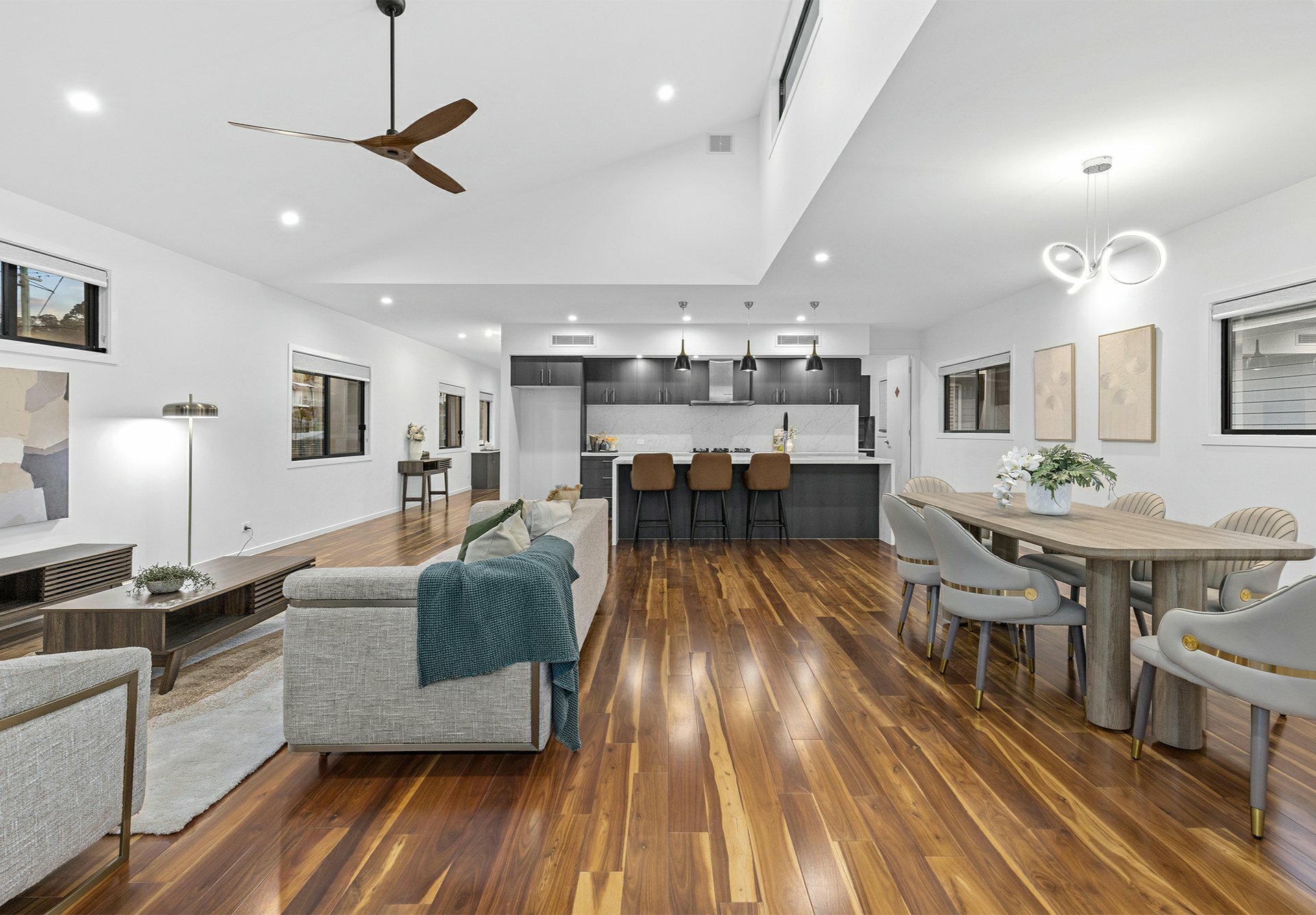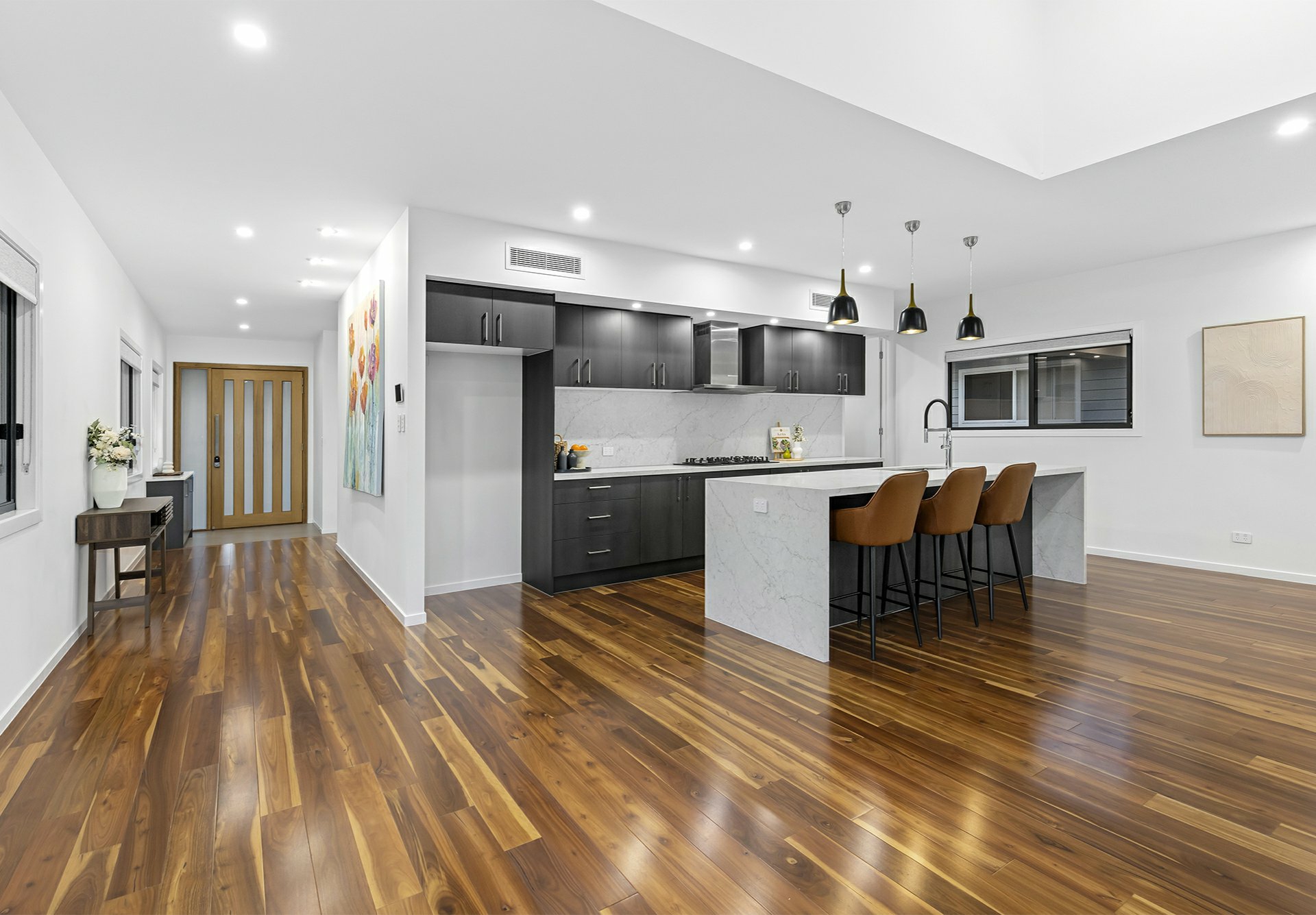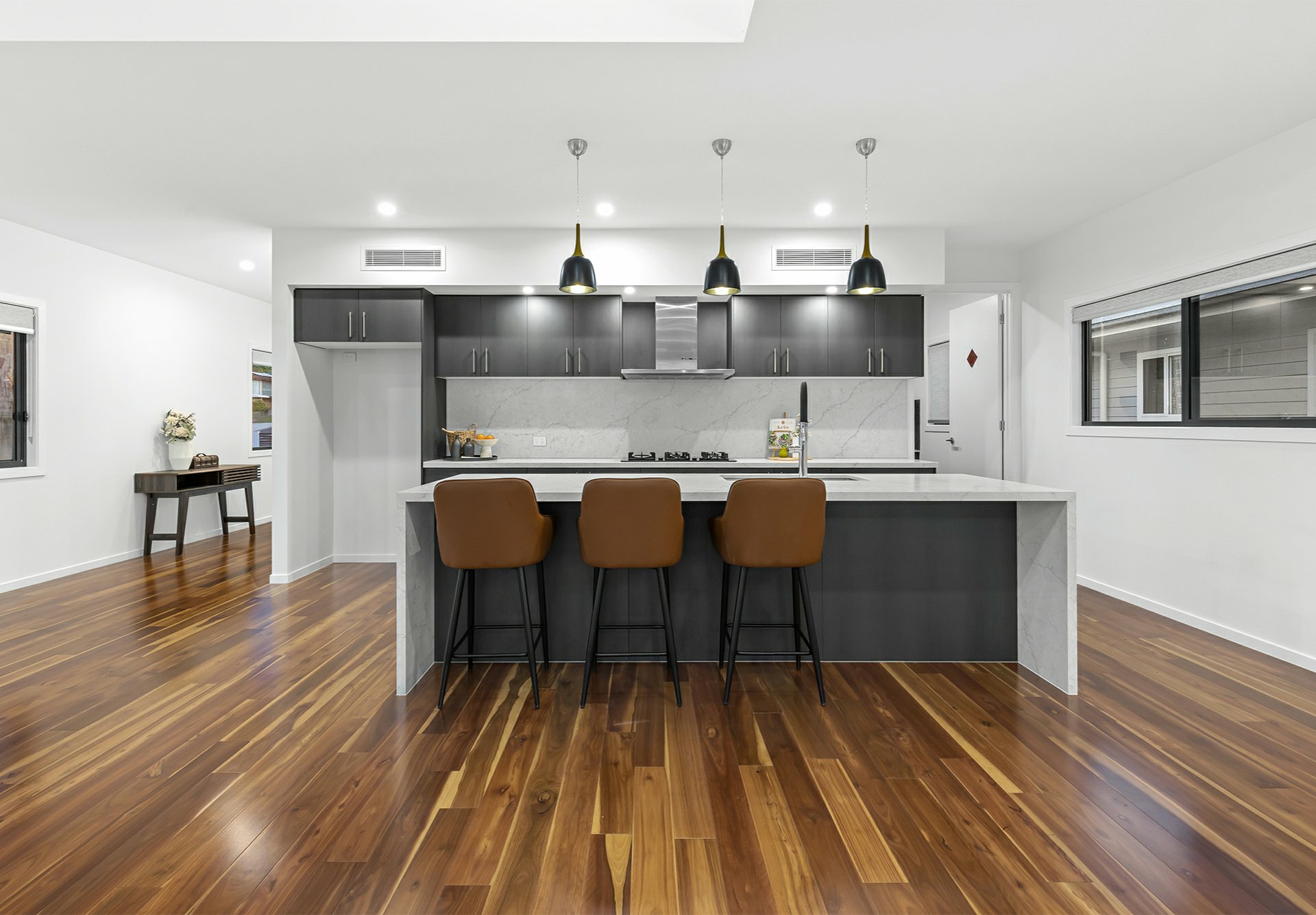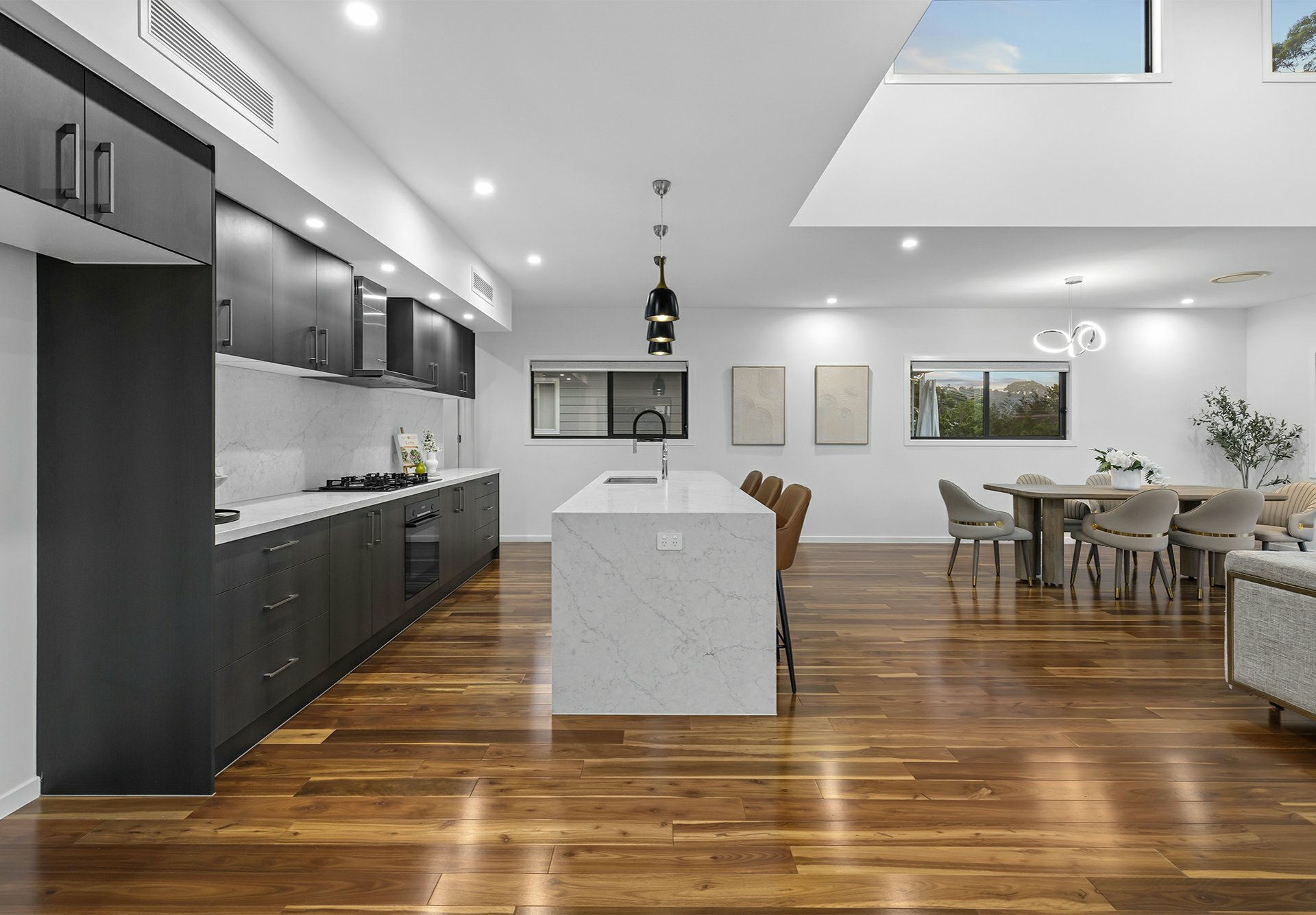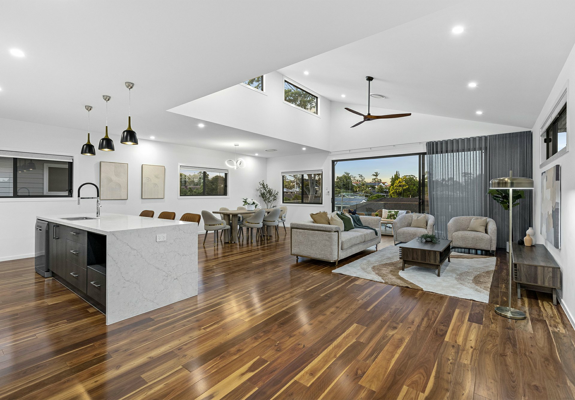 Other than the entry foyer and a powder room next to the laundry - all of which are tiled, the top-level sports richly-toned, solid timber underfoot. Where they shine best is in the enormous open-plan living/dining/kitchen hub, where natural light filters in through clerestory windows in the soaring raked ceilings and stacker sliders that extend this social zone onto a timber-decked balcony.