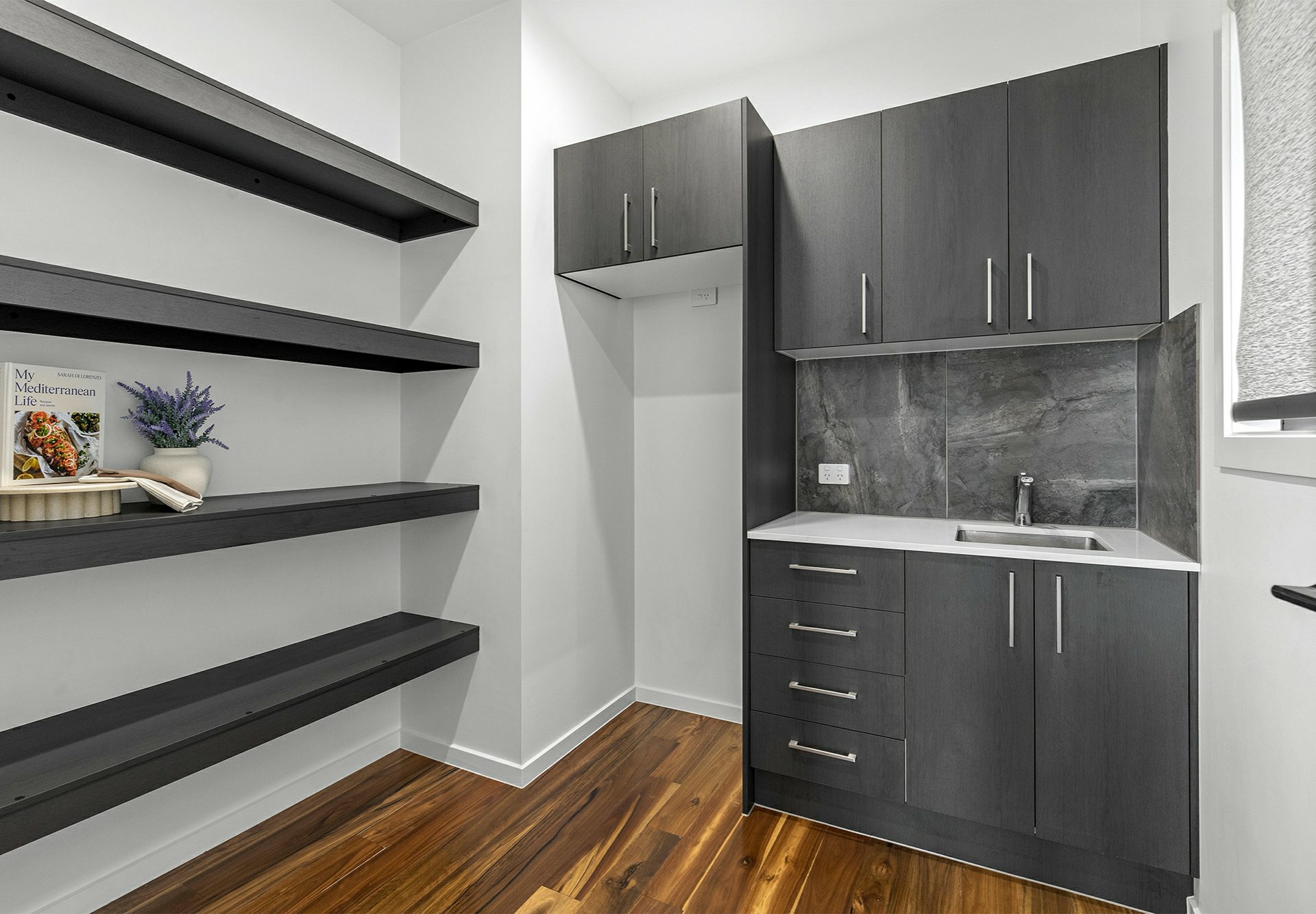 High-end all the way, the kitchen is simply spectacular. Illuminated by pendant lights, the stone-topped dining bar houses a dishwasher and sink with chic tapware, while the main culinary station has an oversize gas burner and under bench oven. Behind all this is a super-sized Butler's Pantry with a valuable second sink, storage and open shelving.