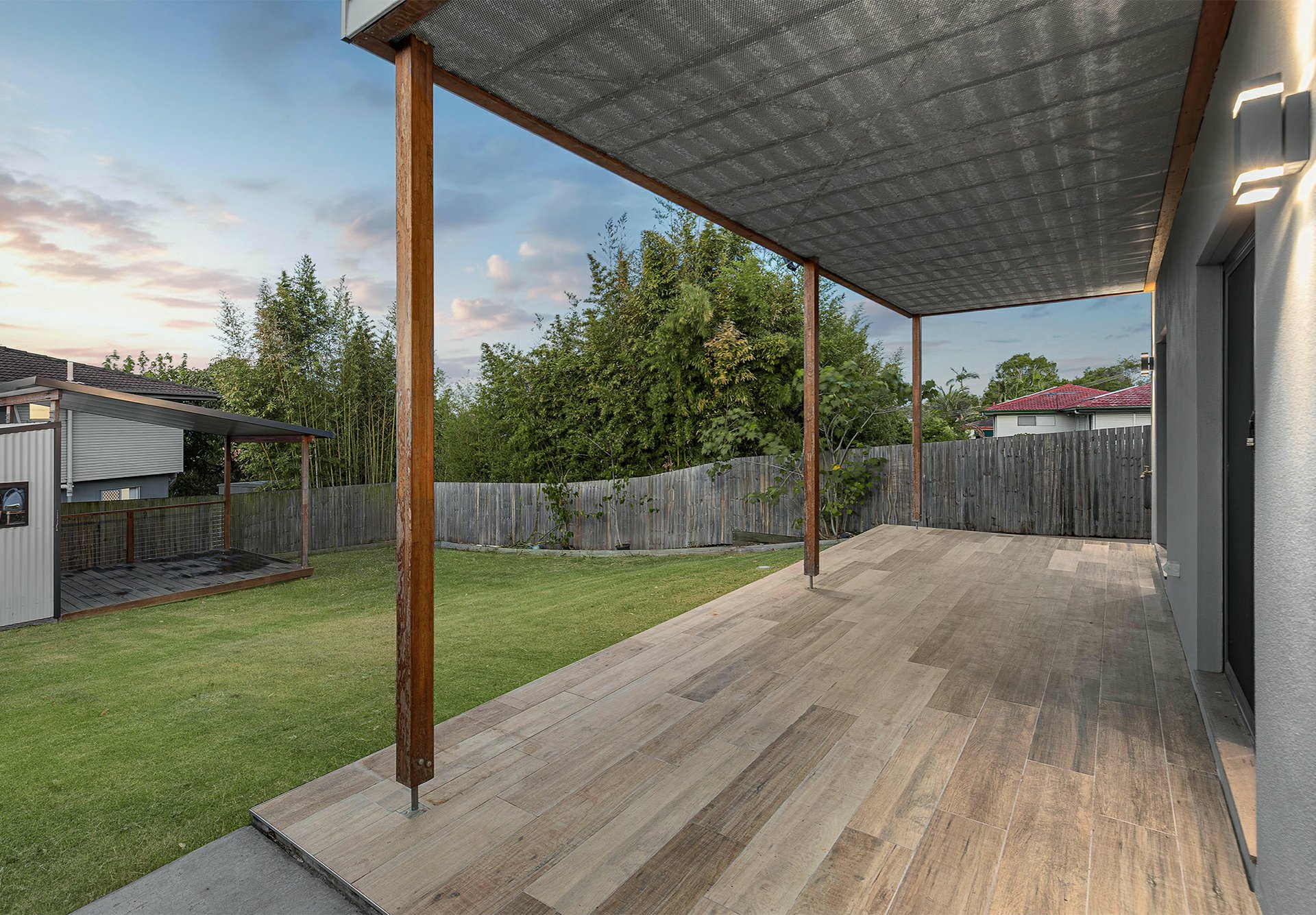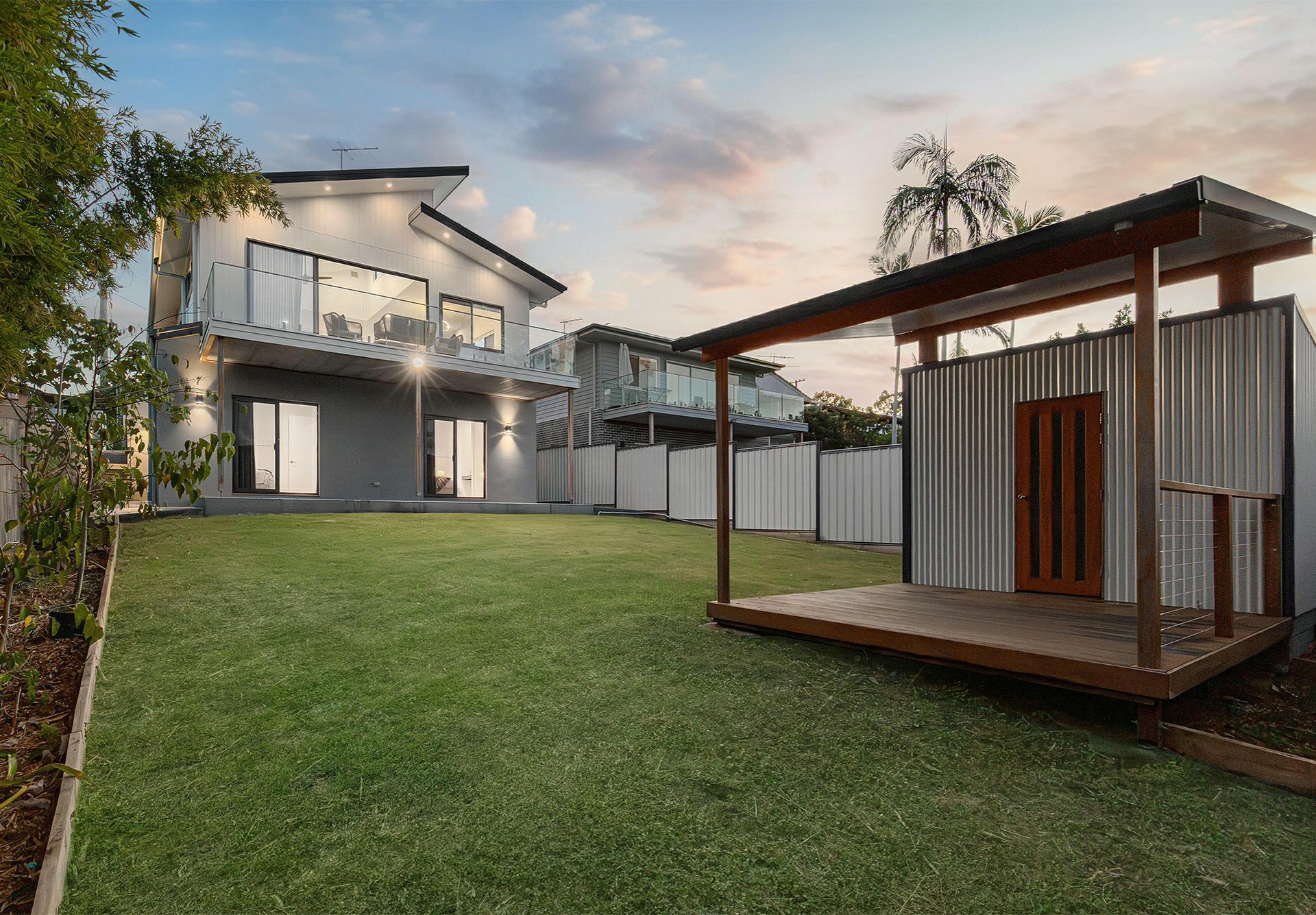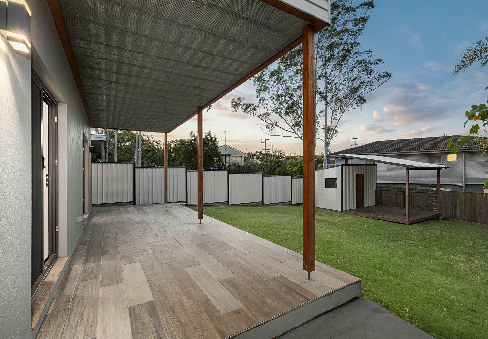 The 2 back beds, one being the master, have sliders onto a terrace that spills onto a low-upkeep grassy backyard with a multi-purpose shed/studio, complete with its own covered deck area! The glass balustrade on the balcony above makes that outdoor space feel even bigger, and the views across Brisbane's southside are brilliant!