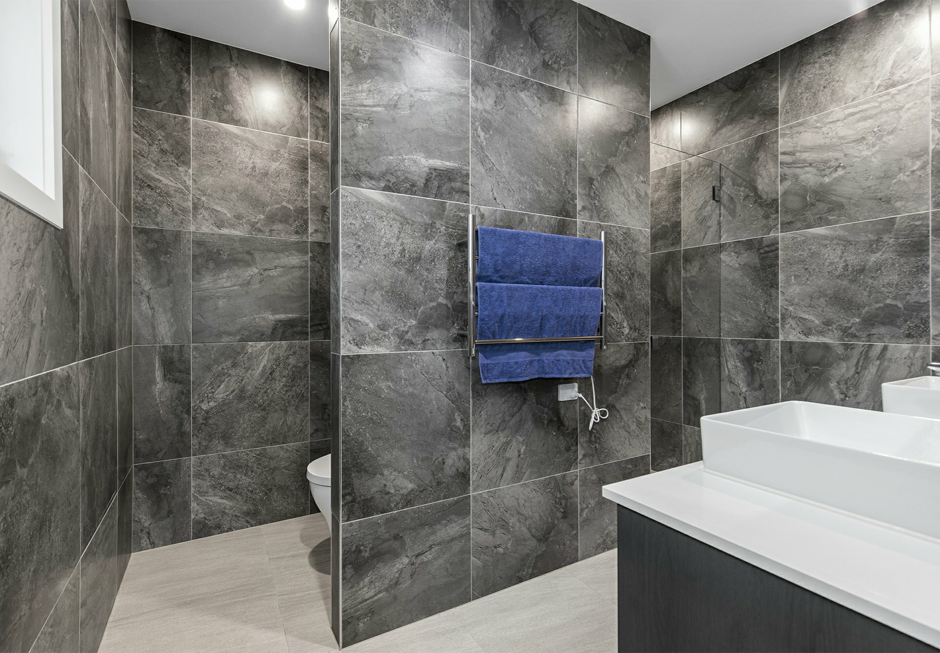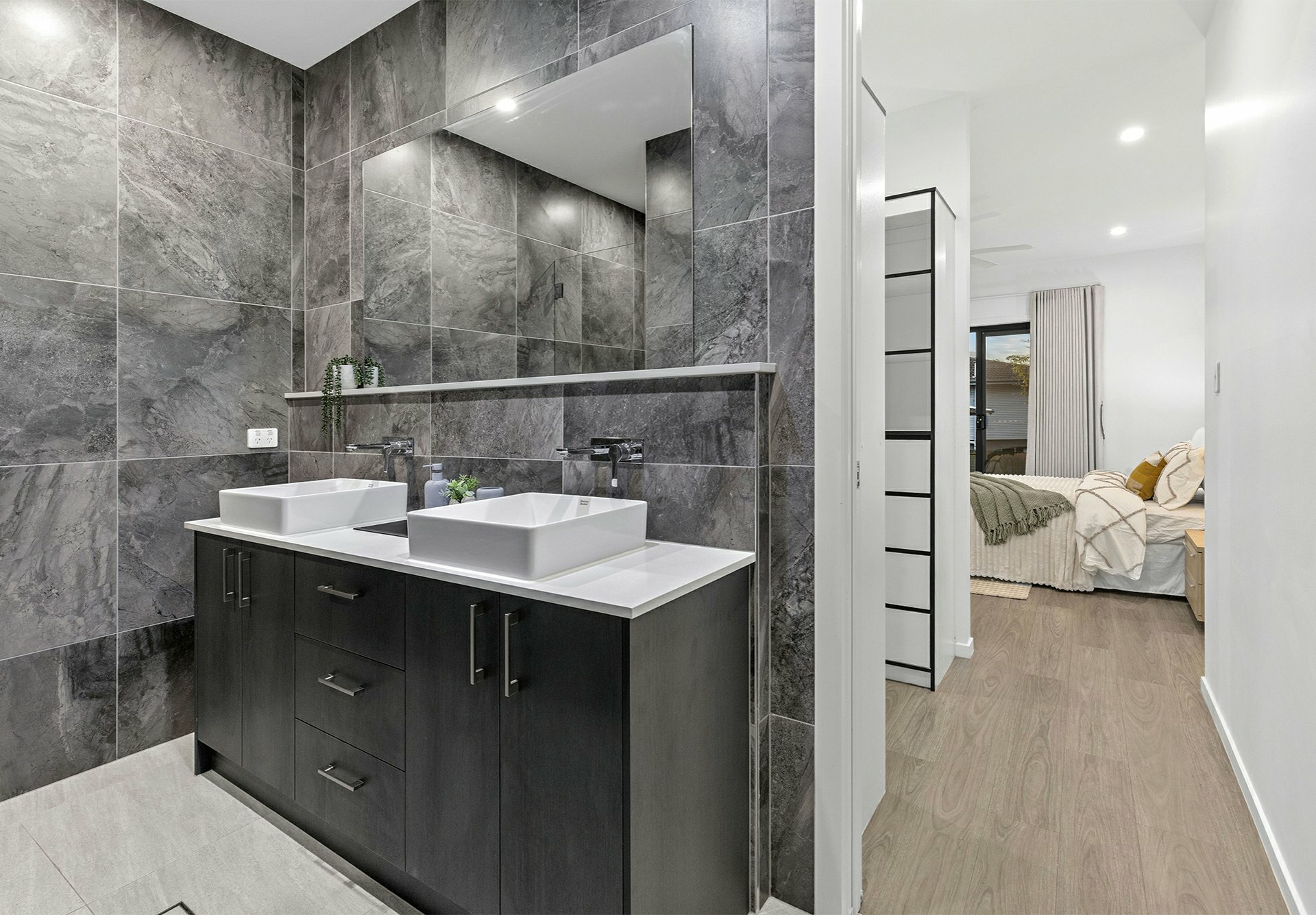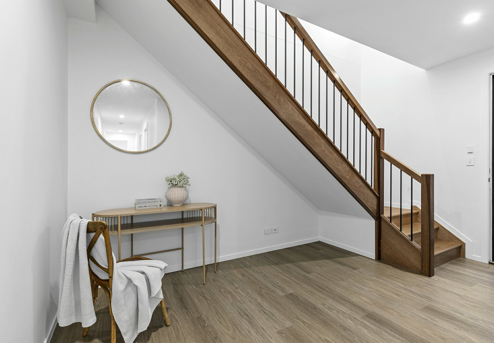 - Solid timber boards upstairs, hybrid timber below, fancy full-height tiles in the bathrooms